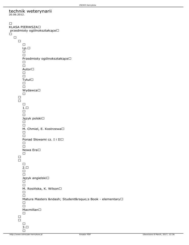 ZSCKR Henryków technik weterynarii 20.06.2012. KLASA PIERWSZA przedmioty ogólnokształcące Lp. Przedmioty ogólnokształcące Autor Tytuł Wydawca 1. Język polski M. Chmiel, E. Kostrzewa Ponad Słowami cz. I i II Nowa Era 2. Język angielski M. Rosińska, K. Wilson Matura Masters – Student’s Book - elementary Macmillan 3. http://www.rolniczak-henrykow.pl Kreator PDF Utworzono 8 March, 2017, 12:36 ZSCKR Henryków Język niemiecki S. Mróz-Dwornikowska, K. Szachowska Welttour. Podręcznik z zeszytem ćwiczeń Nowa Era 4. Historia S. Roszak, J. Kłaczkow Poznać przeszłość. Wiek XX Nowa Era 5. Wiedza o społeczeństwie A. Janicki W centrum uwagi Nowa Era 6. Wiedza o kulturze M. Bokiniec, B. Forysewicz Spotkania z kulturą Nowa Era http://www.rolniczak-henrykow.pl Kreator PDF Utworzono 8 March, 2017, 12:36 ZSCKR Henryków 7. Matematyka W. Babiański, L. Chańko Matematyka Nowa Era 8. Fizyka i astronomia M. Braun, W. Śliwa Odkryć fizykę Nowa Era 9. Chemia R. Hassa, A. Mrzigod To jest chemia Nowa Era 10. Biologia E. Bonar, W. Krzeszowiec http://www.rolniczak-henrykow.pl Kreator PDF Utworzono 8 March, 2017, 12:36 ZSCKR Henryków Biologia na czasie Nowa Era 11. Geografia B. Lenartowicz, m. Wójcik Czas na geografię PWN 12. Podstawy przedsiębiorczości Z. Makieła, T. Rachwał Krok w przedsiębiorczość Nowa Era 13. Informatyka 14. Edukacja dla bezpieczeństwa Praca zbiorowa http://www.rolniczak-henrykow.pl Kreator PDF Utworzono 8 March, 2017, 12:36 ZSCKR Henryków Żyję i działam bezpiecznie. Edukacja dla bezpieczeństwa Nowa Era Przedmioty zawodowe Lp. Przedmioty Autor Tytuł Wydawca 1. Prowadzenie działalności gospodarczej Prowadzenie działalności gospodarczej E. Maliszewski Zarządzanie firmą 2. Anatomia i fizjologia zwierząt W. Pilarski S. Kożniewski Anatomia i fizjologia zwierząt http://www.rolniczak-henrykow.pl Kreator PDF Utworzono 8 March, 2017, 12:36 ZSCKR Henryków PWRiL 3. Chów i hodowla zwierząt E. Marciniak-Kulka Produkcja zwierzęca, cz. 1 REA 4. Choroby i profilaktyka weterynaryjna W. Pilarski S. Kożniewski Anatomia i fizjologia zwierząt PWRiL KLASA DRUGA przedmioty ogólnokształcące Lp. Przedmioty Autor Tytuł Wydawca http://www.rolniczak-henrykow.pl Kreator PDF Utworzono 8 March, 2017, 12:36 ZSCKR Henryków 1. Język polski M. Chmiel, A. Równy Ponad słowami. Klasa 2 cz. 1 Poziom podstawowy i Nowa era rozszerzony 2. Język niemiecki K. Łuniewska Alles klar 1B WSiP 3. Język angielski M. Rosińska Matura Masters Pre-intermediate Macmillan 4. Matematyka W. Babiński i in. Matematyka 1Zakres podstawowy i rozszerzony http://www.rolniczak-henrykow.pl Kreator PDF Utworzono 8 March, 2017, 12:36 ZSCKR Henryków Nowa Era 5. Biologia rozszerzona M. Guzik i in. Biologia na czasie 1 Zakres rozszerzony Nowa Era 6. Podstawy przedsiębiorczości Z. Makieła, T. Rachwał Krok w przedsiębiorczość Nowa Era przedmioty zawodowe Lp. Przedmioty Autor Tytuł Wydawca http://www.rolniczak-henrykow.pl Kreator PDF Utworzono 8 March, 2017, 12:36 ZSCKR Henryków 1. Chów i hodowla zwierząt B. Biesiada i in. Produkcja zwierzęca cz. II REA 2. Podstawy działalności gospodarczej K. Jabłońska i in. Ekonomika w rolnictwie cz. I REA 3. Anatomia i fizjologia zwierząt W. Pilarski i in. Anatomia i fizjologia zwierząt PWRiL KLASA TRZECIA przedmioty ogólnokształcące http://www.rolniczak-henrykow.pl Kreator PDF Utworzono 8 March, 2017, 12:36 ZSCKR Henryków Lp. Przedmioty ogólnokształcące Autor Tytuł Wydawca 1. Język polski M. Chmiel i in. Ponad słowami. Klasa 2 cz. 2 Poziom podstawowy i Nowa Era rozszerzony 2. Język niemiecki K. Łuniewska i in. Alles klar 2A Zakres rozszerzony WSiP 3. Język angielski M. Rosińska i in. Matura Masters Intermediate http://www.rolniczak-henrykow.pl Kreator PDF Utworzono 8 March, 2017, 12:36 ZSCKR Henryków Macmillan 4. Matematyka W. Babiński i in. Matematyka 2 Zakres rozszerzony Nowa Era 5. Biologia rozszerzona F. Dubert i in. Biologia na czasie 2 Zakres rozszerzony Nowa Era 6. Historia i społeczeństwo- poziom uzupełniający T. Maćkowski Poznać przeszłość. Ojczysty Panteon i ojczyste spory Nowa Era KLASA CZWARTA http://www.rolniczak-henrykow.pl Kreator PDF Utworzono 8 March, 2017, 12:36 ZSCKR Henryków Lp. Przedmioty ogólnokształcące Autor Tytuł Wydawca 1. Język polski M. Chmiel i in. Ponad słowami. Klasa 3 Poziom podstawowy i rozszerzony Nowa Era 2. Język niemiecki K. Łuniewska i in. Alles klar 2B, 3A Zakres rozszerzony WSiP 3. Język angielski J. Quintana http://www.rolniczak-henrykow.pl Kreator PDF Utworzono 8 March, 2017, 12:36 ZSCKR Henryków Oxford Repetytorium. Matura podstawowa Oxford 4. Matematyka W. Babiński i in. Matematyka 3 Zakres rozszerzony Nowa Era 5. Biologia rozszerzona F. Dubert i in. Biologia na czasie 3 Zakres rozszerzony Nowa Era 6. Historia i społeczeństwo- poziom uzupełniający J. Centek Poznać przeszłość. Wojna i Wojskowość Nowa Era http://www.rolniczak-henrykow.pl Kreator PDF Utworzono 8 March, 2017, 12:36 ZSCKR Henryków http://www.rolniczak-henrykow.pl Kreator PDF Utworzono 8 March, 2017, 12:36