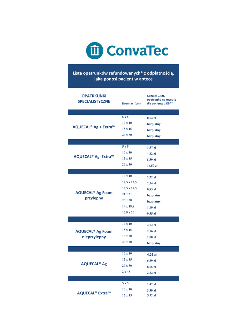 Lista opatrunków refundowanych* z odpłatnością, jaką ponosi pacjent w aptece OPATRKUNKI SPECJALISTYCZNE AQUECAL® Ag + Extra™ AQUECAL® Ag Extra™ AQUECAL® Ag Foam przylepny AQUECAL® Ag Foam nieprzylepny AQUECAL® Ag AQUECAL® Extra™ Rozmiar (cm) Cena za 1 szt. opatrunku na receptę dla pacjenta z EB** 5x5 0,64 zł 10 x 10 bezpłatny 15 x 15 bezpłatny 20 x 30 bezpłatny 5x5 1,57 zł 10 x 10 4,82 zł 15 x 15 8,59 zł 20 x 30 16,59 zł 10 x 10 2,72 zł 12,5 x 12,5 2,54 zł 17,5 x 17,5 0,83 zł 21 x 21 bezpłatny 25 x 30 bezpłatny 14 x 19,8 1,19 zł 16,9 x 20 0,55 zł 10 x 10 2,72 zł 15 x 15 2,16 zł 15 x 20 1,00 zł 20 x 20 bezpłatny 10 x 10 4,02 zł 15 x 15 6,89 zł 20 x 30 8,65 zł 2 x 45 2,32 zł 5x5 1.42 zł 10 x 10 3.39 zł 15 x 15 5.52 zł 10 x 10 3.39 zł 12,5 x 12,5 4.43 zł 17,5 x 17,5 6.59 zł 21 x 21 8.01 zł 25 x 30 10.36 zł 14 x 19,8 6.22 zł 16,9 x 20 7.03 zł 10 x 10 3.39 zł 15 x 15 5.52 zł 15 x 20 6.52 zł 20 x 20 7.68 zł 10 x 10 0,57 zł 15 x 15 bezpłatny 15 x 20 0,05 zł 20 x 20 bezpłatny 6x6 1,66 zł 10 x 10 1,93 zł 10 x 13 2,54 zł 15 x 15 0,73 zł 7,5 x 7,5 0,34 zł 10 x 10 0,57 zł 15 x 15 0,17 zł Granuflex® Pasta 30 g (tuba) bezpłatny GranuGEL® 15 g (tuba) 1.08 zł AQUECAL® Foam przylepny AQUECAL® Foam nieprzylepny Granuflex® Granuflex® Bordered Granuflex® Extra Thin * Opatrunki ConvaTec znajdują się w wykazie wyrobów medycznych. Obwieszczenie Ministra Zdrowia z dnia 28 grudnia 2016 r. w sprawie wykazu refundowanych leków, środków spożywczych specjalnego przeznaczenia żywieniowego oraz wyrobów medycznych na dzień 1 stycznia 2017 r. * * Opatrunki refundowane we wskazaniu Epidermolysis Bullosa wydawane są bezpłatnie do wysokości limitu finansowania i za dopłatą w wysokości różnicy między ceną detaliczną a wysokością limitu finansowania Wszystkie podane ceny opatrunków zawierają podatek VAT