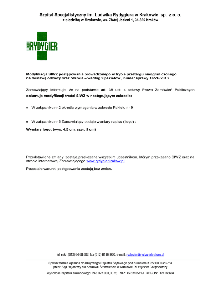 Szpital Specjalistyczny im. Ludwika Rydygiera w Krakowie sp. z o. o. z siedzibą w Krakowie, os. Złotej Jesieni 1, 31-826 Kraków Modyfikacja SIWZ postępowania prowadzonego w trybie przetargu nieograniczonego na dostawę odzieży oraz obuwia – według 9 pakietów , numer sprawy 16/ZP/2013 Zamawiający informuje, że na podstawie art. 38 ust. 4 ustawy Prawo Zamówień Publicznych dokonuje modyfikacji treści SIWZ w następującym zakresie: W załączniku nr 2 określa wymagania w zakresie Pakietu nr 9 W załączniku nr 5 Zamawiający podaje wymiary napisu ( logo) : Wymiary logo: (wys. 4,5 cm, szer. 5 cm) Przedstawione zmiany zostają przekazana wszystkim uczestnikom, którym przekazano SIWZ oraz na stronie internetowej Zamawiającego www.rydygierkrakow.pl Pozostałe warunki postępowania zostają bez zmian. tel. sekr. (012) 64 68 502, fax (012) 64 68 930, e-mail: [email protected] Spółka została wpisana do Krajowego Rejestru Sądowego pod numerem KRS: 0000352784 przez Sąd Rejonowy dla Krakowa Śródmieścia w Krakowie, XI Wydział Gospodarczy Wysokość kapitału zakładowego: 248.923.000,00 zł, NIP: 6783105119 REGON: 121188694