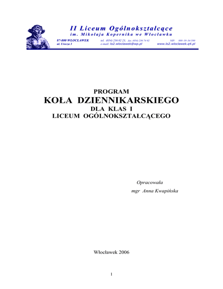 II Liceum Ogólnokształcące im. Mikołaja Kopernika we Włocławku 87-800 WŁOCŁAWEK ul. Urocza 3 tel. (054) 236 02 23, fax. (054) 236 74 02 e-mail: [email protected] NIP: 888–10–34-580 www.lo2.wloclawek.q4.pl PROGRAM KOŁA DZIENNIKARSKIEGO DLA KLAS I LICEUM OGÓLNOKSZTAŁCĄCEGO Opracowała mgr Anna Kwapińska Włocławek 2006 1 IDEA WIODĄCA Niniejszy program dydaktyczno - wychowawczy koła dziennikarskiego jest propozycją zajęć pozalekcyjnych dla klas I liceum ogólnokształcącego. Idea wiodąca programu skupia się wokół rozwijania zainteresowań uczniów uzdolnionych humanistycznie oraz pogłębiania wiadomości i kształcenia umiejętności zdobytych na lekcjach języka polskiego. Ponadto działania koła skierowane są na praktyczne wykorzystanie wiedzy z zakresu dziennikarstwa w Ŝyciu codziennym oraz wdroŜenie zainteresowanych uczniów do samodzielnego poszukiwania informacji z róŜnych źródeł, krytycznej analizy i oceny faktów, uzasadniania własnych opinii oraz odwagi ich wygłaszania. Do opracowania niniejszego programu skłoniło mnie ukończenie podyplomowych studiów z zakresu dziennikarstwa, a takŜe rzeczywiste zainteresowanie młodzieŜy tego typu zajęciami, które nie tylko pozwolą mile spędzić wolny czas, ale przede wszystkim wzbogacą ich w nowe wiadomości i umiejętności. Na realizację programu przewidziałam od 4 do 8 godzin miesięcznie w ciągu pierwszego roku nauki w liceum. W kolejnych dwóch latach uczniowie, którzy brali udział w zajęciach koła dziennikarskiego, będą mogli wykorzystywać zdobyte umiejętności podczas redagowania internetowej gazetki szkolnej, która jednocześnie stanie się wymiernym efektem pracy koła. 2 CELE OGÓLNE • Poszerzanie zakresu umiejętności i wiadomości zdobywanych na lekcjach języka polskiego • Zachęcanie uczniów do twórczej aktywności • Promowanie młodych talentów • Przygotowanie do dalszego kształcenia na kierunkach humanistycznodziennikarskich • Wspieranie wszechstronnego rozwoju ucznia • Rozpowszechnianie informacji na temat Ŝycia szkoły • Współtworzenie wizerunku szkoły w środowisku CELE OPERACYJNE W zakresie wiadomości i umiejętności uczniowie: • Zostaną wyposaŜeni w wiadomości ogólnohumanistyczne oraz zdobędą ogólną wiedzę dotyczącą prasy, telewizji i radia, a takŜe pracy dziennikarza, co ułatwi im wypowiadanie się w podstawowych gatunkach dziennikarskich • Opanują umiejętność pracy z komputerem ( z wykorzystaniem prostych programów edytorskich ), dyktafonem, kamerą amatorską • Zredagują własne teksty dziennikarskie • Poznają pracę dziennikarza prasowego, telewizyjnego i radiowego • Rozwiną w sobie umiejętność segregowania i opracowywania zdobytych informacji oraz wyraŜania własnego zdania • Nauczą się działać zespołowo • Udoskonalą swoje zdolności komunikacyjne • Wykształcą indywidualny styl pisarski 3 • Praktycznie wykorzystają zdobytą wiedzę przy redagowaniu gazetki klasowej, szkolnej, reportaŜu na temat Ŝycia szkoły czy audycji w radiu lokalnym • Poznają specyfikę środowiska szkolnego i miejskiego oraz będą uczestniczyć w Ŝyciu kulturalnym ww. W zakresie postaw: • Rozwijanie świadomości roli mediów w Ŝyciu człowieka • Zrozumienie konieczności aktywnego uczestniczenia w Ŝyciu kulturalnym i politycznym • Motywowanie do samokształcenia i samorealizacji • Kształtowanie postaw zaciekawienia sobą, drugim człowiekiem, sytuacją na świecie, poszanowania prawa, odpowiedzialności za własne słowa i czyny • Kształtowanie świadomego, czyli krytycznego odbioru dóbr kultury masowej • Kształcenie takich cech jak: systematyczność, odpowiedzialność, wytrwałość, pracowitość • Odnalezienie swojego miejsce w grupie, wzmocnienie poczucia własnej wartości, jednocześnie szanując innych i walcząc w obronie słabszych 4 PROCEDURY OSIĄGANIA CELÓW Przy realizacji załoŜeń programu koła dziennikarskiego najlepsze efekty uzyska się stosując róŜnorodne metody aktywizujące: • Metaplan • Drzewko decyzyjne • Burza mózgów • Debata „za i przeciw” • Rzadko pojawiać będzie się wykład Formy pracy: • Indywidualna • Zespoły zadaniowe Techniki: • Praca z tekstem • Prezentacje multimedialne 5 TREŚCI KSZTAŁCENIA ZAGADNIENIA PRZEWIDYWANE OSIĄGNIĘCIA UCZNIA DZIENNIKARSTWO PRASOWE Komunikacja Uczeń: • Teoria komunikacji - Zna schemat komunikacji oraz • Sposoby komunikacji - potrafi wyjaśnić zjawisko szumu • Komunikacja a media komunikacyjnego oraz podać jego • Psychologia komunikacji przyczyny elementy procesu komunikowania - umie wymienić formy i typy Tytułowanie i dzielenie tekstów komunikowania oraz dokonać • Gramatyka i stylistyka tekstów charakterystyki • Zapowiadanie tekstu - potrafi określić rolę mediów w komunikacji Akapity i śródtytuły Informacja, czyli sedno dziennikarstwa - zna podstawy retoryki dziennikarskiej • Redagowanie - zna podstawowe zasady • Precyzja tytułowania tekstów, kategorie • Artykuł informacyjny nagłówków - umie samodzielnie przekształcić • bądź zmienić tytuł na bardziej Sprawozdanie funkcjonalny - zna zasady zapowiadania tekstów i wykorzystuje je przy redagowaniu Gatunki dziennikarskie własnych • Felieton - wie co oznacza akapit i śródtytuł • Recenzja oraz stosuje je w praktyce • Wywiad • ReportaŜ - zna reguły obowiązujące w informacji, wie na czym polega zasada odwróconej piramidy i Prawo prasowe i etyka dziennikarska wykorzystuje swoją wiedzę przy omówienie zagadnień z wykorzystaniem pisaniu artykułów oraz sprawozdań filmów przedstawiających róŜnorodne - zna cechy podstawowych gatunków dziennikarskich postawy dziennikarzy - umie rozpoznać poszczególne Typy czasopism oraz budowa gazety 6 gatunki „Warsztaty dziennikarskie” z udziałem - umie napisać felieton, recenzję profesjonalnych dziennikarzy prasy wywiad, reportaŜ - zn