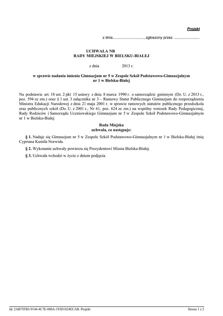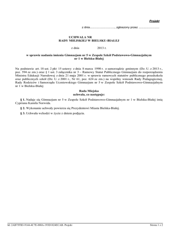 Projekt z dnia.............................., zgłoszony przez ......................... UCHWAŁA NR RADY MIEJSKIEJ W BIELSKU-BIAŁEJ z dnia 2013 r. w sprawie nadania imienia Gimnazjum nr 5 w Zespole Szkół Podstawowo-Gimnazjalnym nr 1 w Bielsku-Białej Na podstawie art. 18 ust. 2 pkt 15 ustawy z dnia 8 marca 1990 r. o samorządzie gminnym (Dz. U. z 2013 r., poz. 594 ze zm.) oraz § 1 ust. 3 załącznika nr 3 – Ramowy Statut Publicznego Gimnazjum do rozporządzenia Ministra Edukacji Narodowej z dnia 21 maja 2001 r. w sprawie ramowych statutów publicznego przedszkola oraz publicznych szkół (Dz. U. z 2001 r., Nr 61, poz. 624 ze zm.) na wspólny wniosek Rady Pedagogicznej, Rady Rodziców i Samorządu Uczniowskiego Gimnazjum nr 5 w Zespole Szkół Podstawowo-Gimnazjalnym nr 1 w Bielsku-Białej Rada Miejska uchwala, co następuje: § 1. Nadaje się Gimnazjum nr 5 w Zespole Szkół Podstawowo-Gimnazjalnym nr 1 w Bielsku-Białej imię Cypriana Kamila Norwida. § 2. Wykonanie uchwały powierza się Prezydentowi Miasta Bielska-Białej. § 3. Uchwała wchodzi w życie z dniem podjęcia. Id: 2AB75FB3-9144-4C7E-880A-193D1824ECAB. Projekt Strona 1 z 2 Uzasadnienie Na podstawie § 1 ust. 3 załącznika nr 3 – Ramowy Statut Publicznego Gimnazjum do rozporządzenia Ministra Edukacji Narodowej z dnia 21 maja 2001 r. w sprawie ramowych statutów publicznego przedszkola oraz publicznych szkół (Dz. U. z 2001 r. Nr 61 poz. 624 ze zm.) organ prowadzący nadaje imię gimnazjum na wniosek rady gimnazjum lub wspólny wniosek rady pedagogicznej, rady rodziców i samorządu uczniowskiego. Rada Pedagogiczna, Rada Rodziców i Samorząd Uczniowski Gimnazjum nr 5 w Zespole Szkół Podstawowo-Gimnazjalnym nr 1 w Bielsku-Białej 8 lipca 2013 r. złożyły wspólny wniosek o nadanie Gimnazjum nr 5 w Zespole Szkół Podstawowo-Gimnazjalnym nr 1 imienia Cypriana Kamila Norwida. Cyprian Kamil Norwid – polski poeta, dramatopisarz, prozaik, artysta plastyk. Często uważany za ostatniego z czterech najważniejszych polskich poetów romantycznych, choć wielu historyków literatury zalicza jego twórczość raczej do klasycyzmu i parnasizmu. Urodził się 24 września 1821 we wsi Laskowo-Głuchy (okolice Warszawy). Był synem niezamożnego urzędnika. Wcześnie stracił rodziców, wychowywał się u babki Hilarii z Sobieskich Zdziechowskiej. Razem ze starszym bratem Ludwikiem (poetą) uczył się w gimnazjum warszawskim w latach 1831-1832 i 1834-1837. Przerwał naukę i wstąpił do prywatnej szkoły malarskiej. Już jako uczeń próbował pióra budząc ogólny podziw swoimi utworami. W końcu zadebiutował jako poeta w roku 1840 na łamach prasy warszawskiej poruszając poważnie problemy miłości, szacunku dla ludu i pojęcia twórczości artystycznej, jako pracy. Latem 1842 roku wyjechał za granicę, by nigdy już nie powrócić do kraju. Najpierw zwiedzał południowe Niemcy, potem Włochy. W swojej podróży kontynuował również studia malarskie (Monachium) i rzeźby (Florencja). W końcu wrócił do Niemiec, by jako wolny słuchacz uczęszczać na uniwersytet w Berlinie. Podejrzany o związki z anty carskimi spiskami został aresztowany 10 czerwca 1846 roku w Berlinie i do końca lipca osadzony w więzieniu. W 1847 roku artysta po raz kolejny wyjechał do Rzymu. W czasie pobytu we Włoszech zakochał się w słynnej wówczas pianistce Marii Kalergis. Ta wielka, nigdy niespełniona miłość, przez wiele lat wpływała na tematykę twórczości Norwida. W roku 1849 przybył na dłużej do Paryża. Tu zbliżył się ze Słowackim, Chopinem, Zaleskim i Mickiewiczem. Zetknął się również z działaczami demokratycznymi, co przyczyniło się do wyraźnej radykalizacji jego poglądów. W tym okresie jego życia powiększyło się osamotnienie poety i zaostrzyły się ataki wrogo do niego nastawionych krytyków. Warunki materialne w jakich żył bliskie były nędzy. Kolejne niepowodzenia oraz osobiste zawody życiowe skłoniły Norwida do opuszczenia Paryża i udania się do Ameryki. 29 listopada 1852 wyjechał do Londynu, a stamtąd żaglowcem do Nowego Yorku. Mimo rozmaitych dorywczych prac jego sytuacja w Ameryce stawała się beznadziejna. W grudniu 1854 powrócił do Paryża, którego już nie opuścił do końca życia. Popadał w coraz większą biedę, nasilały się konflikty ze znajomymi, które pogłębiała głuchota. W lutym 1877 r. zmuszony został zamieszkać w Ivry w Zakładzie Świętego Kazimierza, przeznaczonym dla polskich sierot i weteranów. Cyprian Norwid zmarł w nocy z 22 na 23 maja 1883. Zaraz po jego śmierci, w czasie porządkowania pokoju spalone zostały papiery zgromadzone w kufrze pisarza. Został pochowany na cmentarzu w Ivry. Po pięciu latach zwłoki zostały przeniesione do polskiego grobu zbiorowego na cmentarzu w Montmorency a następnie do zbiorowego grobu domowników Hotelu Lambert. Obecnie Cyprian Kamil Norwid może stanowić wzór poświęcenia w imię najwyższych wartości. To on jest autorem często cytowanego zdania: „Ojczyzna to wielki zbiorowy obowiązek”. Twórczość tego Poety Myśli – jak go nazywają współcześni – obdarzonego bystrym, analitycznym umysłem, przybliża młodym ludziom takie wartości jak: tolerancja, szacunek dla siebie i drugiego człowieka czy kierowanie się w swym postępowaniu otwartością dla innych kultur i narodowości. Twórca ten, mimo iż wcześnie osierocony przez rodziców, przez całe życie nie stracił ambicji kształcenia, rozwijania talentów plastycznych i literackich. Troszczył się o szacunek dla drugiego człowieka i jego pracy. Twierdził, że jest podstawowa wartość moralna: „Tyle i takiej egzystencji naród ma, ile i jak jest w stanie człowieka uszanować”. Id: 2AB75FB3-9144-4C7E-880A-193D1824ECAB. Projekt Strona 2 z 2
