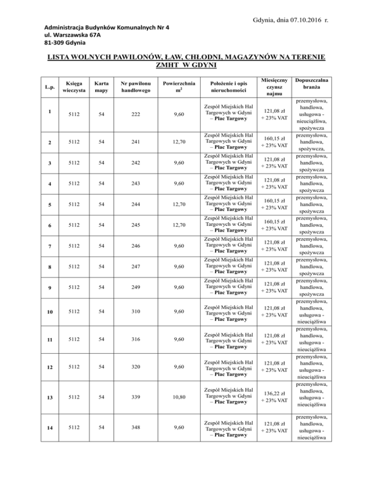Gdynia, dnia 07.10.2016 r. Administracja Budynków Komunalnych Nr 4 ul. Warszawska 67A 81-309 Gdynia LISTA WOLNYCH PAWILONÓW, ŁAW, CHŁODNI, MAGAZYNÓW NA TERENIE ZMHT W GDYNI L.p. Księga wieczysta Karta mapy Nr pawilonu handlowego Miesięczny czynsz najmu Powierzchnia m2 Położenie i opis nieruchomości 121,08 zł + 23% VAT 1 5112 54 222 9,60 Zespół Miejskich Hal Targowych w Gdyni – Plac Targowy 2 5112 54 241 12,70 Zespół Miejskich Hal Targowych w Gdyni – Plac Targowy 160,15 zł + 23% VAT 3 5112 54 242 9,60 Zespół Miejskich Hal Targowych w Gdyni – Plac Targowy 121,08 zł + 23% VAT 4 5112 54 243 9,60 Zespół Miejskich Hal Targowych w Gdyni – Plac Targowy 121,08 zł + 23% VAT 5 5112 54 244 12,70 Zespół Miejskich Hal Targowych w Gdyni – Plac Targowy 160,15 zł + 23% VAT 6 5112 54 245 12,70 Zespół Miejskich Hal Targowych w Gdyni – Plac Targowy 160,15 zł + 23% VAT 7 5112 54 246 9,60 Zespół Miejskich Hal Targowych w Gdyni – Plac Targowy 121,08 zł + 23% VAT 8 5112 54 247 9,60 Zespół Miejskich Hal Targowych w Gdyni – Plac Targowy 121,08 zł + 23% VAT 9 5112 54 249 9,60 Zespół Miejskich Hal Targowych w Gdyni – Plac Targowy 121,08 zł + 23% VAT 10 5112 54 310 9,60 Zespół Miejskich Hal Targowych w Gdyni – Plac Targowy 121,08 zł + 23% VAT 11 5112 54 316 9,60 Zespół Miejskich Hal Targowych w Gdyni – Plac Targowy 121,08 zł + 23% VAT 12 5112 54 320 9,60 Zespół Miejskich Hal Targowych w Gdyni – Plac Targowy 121,08 zł + 23% VAT 13 5112 54 339 10,80 Zespół Miejskich Hal Targowych w Gdyni – Plac Targowy 136,22 zł + 23% VAT 9,60 Zespół Miejskich Hal Targowych w Gdyni – Plac Targowy 121,08 zł + 23% VAT 14 5112 54 348 Dopuszczalna branża przemysłowa, handlowa, usługowa nieuciążliwa, spożywcza przemysłowa, handlowa, spożywcza, przemysłowa, handlowa, spożywcza przemysłowa, handlowa, spożywcza przemysłowa, handlowa, spożywcza przemysłowa, handlowa, spożywcza przemysłowa, handlowa, spożywcza przemysłowa, handlowa, spożywcza przemysłowa, handlowa, spożywcza przemysłowa, handlowa, usługowa nieuciążliwa przemysłowa, handlowa, usługowa nieuciążliwa przemysłowa, handlowa, usługowa nieuciążliwa przemysłowa, handlowa, usługowa nieuciążliwa przemysłowa, handlowa, usługowa nieuciążliwa 15 5112 54 352 9,60 Zespół Miejskich Hal Targowych w Gdyni – Plac Targowy 16 5112 54 356 8,73 Zespół Miejskich Hal Targowych w Gdyni – Plac Targowy 110,11 zł + 23% VAT 17 5112 54 363 9,60 Zespół Miejskich Hal Targowych w Gdyni – Plac Targowy 121,08 zł + 23% VAT 18 5112 54 19 5112 54 20 5112 54 21 5112 54 22 5112 54 ława przemysłowa nr 6 54 ława przemysłowa nr 7 54 ława przemysłowa nr 9 54 ława przemysłowa nr 10 54 ława przemysłowa nr 14 54 ława przemysłowa nr 18 54 ława przemysłowa nr 19 23 24 25 26 27 28 29 30 5112 5112 5112 5112 5112 5112 5112 5112 54 54 365 ława przemysłowa nr 1 ława przemysłowa nr 2 ława przemysłowa nr 3 14** 29** 121,08 zł + 23% VAT Zespół Miejskich Hal Targowych w Gdyni – Plac Targowy 121,08 zł + 23% VAT 2,00 Zespół Miejskich Hal Targowych w Gdyni – Plac Targowy 90,81 zł + 23% VAT 2,00 Zespół Miejskich Hal Targowych w Gdyni – Plac Targowy 90,81 zł + 23% VAT 2,00 Zespół Miejskich Hal Targowych w Gdyni – Plac Targowy 90,81 zł + 23% VAT 1,50 Zespół Miejskich Hal Targowych w Gdyni – Plac Targowy 90,81 zł + 23% VAT 2,00 Zespół Miejskich Hal Targowych w Gdyni – Plac Targowy 90,81 zł + 23% VAT 1,00 Zespół Miejskich Hal Targowych w Gdyni – Plac Targowy 90,81 zł + 23% VAT Zespół Miejskich Hal Targowych w Gdyni – Plac Targowy 90,81 zł + 23% VAT Zespół Miejskich Hal Targowych w Gdyni – Plac Targowy 90,81 zł + 23% VAT Zespół Miejskich Hal Targowych w Gdyni – Plac Targowy 90,81 zł + 23% VAT 2,00 Zespół Miejskich Hal Targowych w Gdyni – Plac Targowy 90,81 zł + 23% VAT 10,00 Zespół Miejskich Hal Targowych w Gdyni – Hala Łukowa 454,05 zł + 23% VAT 10,00 Zespół Miejskich Hal Targowych w Gdyni – Hala Łukowa 454,05 zł + 23% VAT 9,60 1,50 2,00 2,50 przemysłowa, handlowa, usługowa nieuciążliwa przemysłowa, handlowa, usługowa nieuciążliwa przemysłowa, handlowa, usługowa nieuciążliwa Przemysłowa, handlowa, usługowa nieuciążliwa przemysłowa, handlowa przemysłowa, handlowa przemysłowa, handlowa przemysłowa, handlowa przemysłowa, handlowa przemysłowa, handlowa przemysłowa, handlowa przemysłowa, handlowa przemysłowa, handlowa przemysłowa, handlowa przemysłowa, handlowa, usługowa nieuciążliwa przemysłowa, handlowa, usługowa nieuciążliwa 31 32 33 34 35 36 5112 5112 5112 5112 5112 5112 54 54 54 54 54 54 46** 59* 73** 201* 218* 240 10,00 Zespół Miejskich Hal Targowych w Gdyni – Hala Łukowa 454,05 zł + 23% VAT 24,50 Zespół Miejskich Hal Targowych w Gdyni – Hala Łukowa 1.112,42 zł + 23% VAT 98,00 Zespół Miejskich Hal Targowych w Gdyni – Hala Łukowa 8,70 Zespół Miejskich Hal Targowych w Gdyni – Hala Płaska 8,70 Zespół Miejskich Hal Targowych w Gdyni – Hala Płaska 8,70 Zespół Miejskich Hal Targowych w Gdyni – Hala Płaska 4.449,69 zł + 23% VAT 554,95 zł + 23% VAT 554,95 zł + 23% VAT 554,95 zł + 23% VAT przemysłowa, handlowa, usługowa nieuciążliwa przemysłowa, handlowa, usługowa nieuciążliwa Przemysłowa, handlowa spożywcza, usługowa nieuciążliwa przemysłowa, handlowa, spożywcza, usługowa nieuciążliwa przemysłowa, handlowa, spożywcza, usługowa nieuciążliwa przemysłowa, handlowa, usługowa nieuciążliwa Magazyn – Hala Rybna Jedno wspólne pomieszczenie L.p. Księga wieczysta Karta mapy Powierzchnia m2 Położenie i opis nieruchomości Miesięczny czynsz najmu 1 5112 54 Wolna powierzchnia 64 m2 ( istnieje możliwość wynajęcia dowolnej powierzchni) Zespół Miejskich Hal Targowych w Gdyni – magazyn pod Halą Rybną 6,31 zł /m2 + 23 % VAT Magazyn – Hala Płaska L.p. Księga wieczysta Karta mapy Nr Powierzchnia m2 Położenie i opis nieruchomości Mi