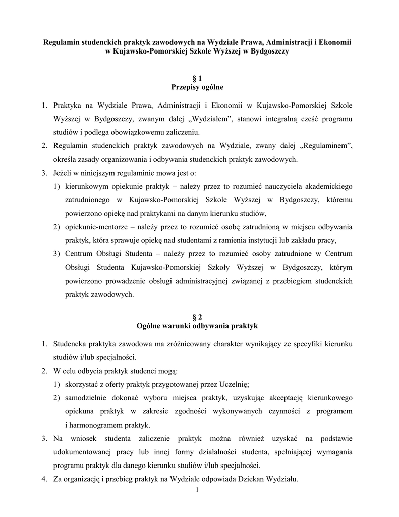 Regulamin studenckich praktyk zawodowych na Wydziale Prawa, Administracji i Ekonomii w Kujawsko-Pomorskiej Szkole Wyższej w Bydgoszczy §1 Przepisy ogólne 1. Praktyka na Wydziale Prawa, Administracji i Ekonomii w Kujawsko-Pomorskiej Szkole Wyższej w Bydgoszczy, zwanym dalej „Wydziałem”, stanowi integralną cześć programu studiów i podlega obowiązkowemu zaliczeniu. 2. Regulamin studenckich praktyk zawodowych na Wydziale, zwany dalej „Regulaminem”, określa zasady organizowania i odbywania studenckich praktyk zawodowych. 3. Jeżeli w niniejszym regulaminie mowa jest o: 1) kierunkowym opiekunie praktyk – należy przez to rozumieć nauczyciela akademickiego zatrudnionego w Kujawsko-Pomorskiej Szkole Wyższej w Bydgoszczy, któremu powierzono opiekę nad praktykami na danym kierunku studiów, 2) opiekunie-mentorze – należy przez to rozumieć osobę zatrudnioną w miejscu odbywania praktyk, która sprawuje opiekę nad studentami z ramienia instytucji lub zakładu pracy, 3) Centrum Obsługi Studenta – należy przez to rozumieć osoby zatrudnione w Centrum Obsługi Studenta Kujawsko-Pomorskiej Szkoły Wyższej w Bydgoszczy, którym powierzono prowadzenie obsługi administracyjnej związanej z przebiegiem studenckich praktyk zawodowych. §2 Ogólne warunki odbywania praktyk 1. Studencka praktyka zawodowa ma zróżnicowany charakter wynikający ze specyfiki kierunku studiów i/lub specjalności. 2. W celu odbycia praktyk studenci mogą: 1) skorzystać z oferty praktyk przygotowanej przez Uczelnię; 2) samodzielnie dokonać wyboru miejsca praktyk, uzyskując akceptację kierunkowego opiekuna praktyk w zakresie zgodności wykonywanych czynności z programem i harmonogramem praktyk. 3. Na wniosek studenta zaliczenie praktyk można również uzyskać na podstawie udokumentowanej pracy lub innej formy działalności studenta, spełniającej wymagania programu praktyk dla danego kierunku studiów i/lub specjalności. 4. Za organizację i przebieg praktyk na Wydziale odpowiada Dziekan Wydziału. 1 5. Uczelnia nie pokrywa kosztów związanych z organizacją i przebiegiem praktyk. 6. Praktyki są bezpłatne, z zastrzeżeniem ust. 7. 7. W przypadku gdy podstawą odbywania praktyki jest umowa o pracę lub umowa cywilnoprawna student może pobierać wynagrodzenie z instytucji lub zakładu pracy wynikające z postanowień umowy. Stosowna umowa zawierana jest pomiędzy instytucją/zakładem pracy a studentem bez pośrednictwa Uczelni. §3 Kompetencje osób odpowiedzialnych za przebieg studenckich praktyk zawodowych 1. Do kompetencji kierunkowego opiekuna praktyk należy w szczególności: 1) informowanie studentów o miejscu, formie, celach i zadaniach praktyk; 2) sprawdzanie dokumentacji sporządzonej przez studenta po zakończeniu praktyk; 3) dokonywanie zaliczenia praktyk i wpisów; 4) pozyskiwanie nowych miejsc praktyk oraz ich organizacja; 5) udział w opracowywaniu i systematycznym weryfikowaniu programów kształcenia praktyk; 6) ocena efektów kształcenia praktyk, 7) złożenie Dziekanowi Wydziału rocznego sprawozdania z realizacji praktyk na Wydziale wraz ze stosowną dokumentacją; 8) wykonywanie innych zadań zleconych przez Dziekana Wydziału w zakresie praktyk. 2. Do kompetencji Dziekana należy w szczególności: 1) odpowiedzialność za organizację i przebieg praktyk na Wydziale, 2) opracowywanie i systematyczne weryfikowanie programów praktyk, 3) merytoryczne przygotowywanie umów z zakresu organizacji praktyk studenckich i porozumień w sprawie organizacji praktyk studenckich. §4 Czas i termin odbywania praktyk oraz program praktyk 1. Zasady i formę odbywania praktyk dla poszczególnych kierunków studiów, z uwzględnieniem formy studiów, ustala rada wydziału. 2. Rada wydziału określa w ramach: 1) planu studiów - wymiar (tygodniowy, godzinowy) i terminy realizacji praktyk wraz z liczbą punktów ECTS; 2 2) programu studiów: a) cel praktyk, b) program praktyk, c) sposób dokumentacji praktyk, d) warunki zaliczenia praktyki. 3. Program praktyk uwzględnia nabywanie przez studenta umiejętności praktycznych i kompetencji społecznych, w szczególności: 1) samodzielnego pozyskiwania i przetwarzania informacji; 2) sprawnej komunikacji; 3) prezentacji wyników samodzielnej pracy; 4) umiejętności działania w warunkach ryzyka; 5) współpracy w zespole; 6) postaw społecznych; 7) szeroko rozumianych kompetencji zawodowych oraz postaw przedsiębiorczych. 4. Program praktyk zawiera w szczególności: 1) wymiar i czas praktyk; 2) zakres praktyk; 3) sposób i zasady oceniania; 4) prawa i obowiązki studenta podczas odbywania praktyk. §5 Obowiązki studentów 1. Do obowiązków studenta należy: 1) zgłoszenie do Centrum Obsługi Studenta miejsca i czasu praktyk, nie później niż na dwa tygodnie przed rozpoczęciem planowanych praktyk; 2) przekazanie do Centrum Obsługi Studenta podpisanych umów lub porozumień o organizacji praktyk studenckich; 3) przekazanie do Centrum Obsługi Studenta dokumentacji praktyk w terminie miesiąca od jej zakończenia; 4) odbiór dokumentacji praktyk po dokonaniu wpisów przez kierunkowego opiekuna praktyk ze Centrum Obsługi Studenta. 3 2. W przypadku gdy instytucja, w której planowane jest odbycie praktyk uzna za konieczne posiadanie ubezpieczenia od Następstw Nieszczęśliwych Wypadków i/lub Odpowiedzialności Cywilnej, student zobowiązany jest do zawarcia umowy ubezpieczenia we własnym zakresie. §6 Warunki zaliczenia praktyk i dokonania wpisu 1. Zaliczenia praktyk dokonuje kierunkowy opiekun praktyk, a pod jego nieobecność Dziekan Wydziału, po spełnieniu przez studenta poniższych warunków: 1) uzyskaniu pozytywnej opinii o odbyciu praktyk wystawionej przez opiekuna-mentora w miejscu praktyk; 2) przedstawieniu kierunkowemu opiekunowi praktyk dokumentacji z odbycia praktyk; 3) uzyskaniu pozytywnej oceny na karcie zaliczenia wystawionej przez kierunkowego opiekuna praktyk (sposób i zasady wystawiania oceny określone s