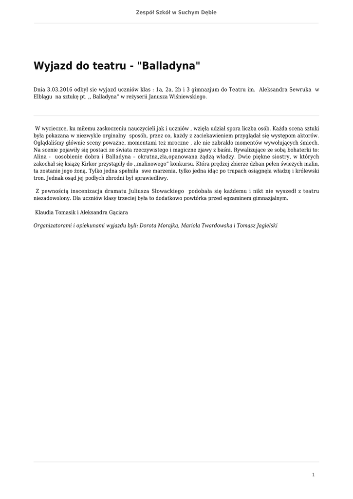 Zespół Szkół w Suchym Dębie Wyjazd do teatru - "Balladyna" Dnia 3.03.2016 odbył sie wyjazd uczniów klas : 1a, 2a, 2b i 3 gimnazjum do Teatru im. Aleksandra Sewruka w Elblągu na sztukę pt. ,, Balladyna” w reżyserii Janusza Wiśniewskiego. W wycieczce, ku miłemu zaskoczeniu nauczycieli jak i uczniów , wzięła udział spora liczba osób. Każda scena sztuki była pokazana w niezwykle orginalny sposób, przez co, każdy z zaciekawieniem przyglądał się występom aktorów. Oglądaliśmy głównie sceny poważne, momentami też mroczne , ale nie zabrakło momentów wywołujących śmiech. Na scenie pojawiły się postaci ze świata rzeczywistego i magiczne zjawy z baśni. Rywalizujące ze sobą bohaterki to: Alina - uosobienie dobra i Balladyna – okrutna,zła,opanowana żądzą władzy. Dwie piękne siostry, w których zakochał się książę Kirkor przystąpiły do ,,malinowego” konkursu. Która prędzej zbierze dzban pełen świeżych malin, ta zostanie jego żoną. Tylko jedna spełniła swe marzenia, tylko jedna idąc po trupach osiągnęła władzę i królewski tron. Jednak osąd jej podłych zbrodni był sprawiedliwy. Z pewnością inscenizacja dramatu Juliusza Słowackiego podobała się każdemu i nikt nie wyszedł z teatru niezadowolony. Dla uczniów klasy trzeciej była to dodatkowo powtórka przed egzaminem gimnazjalnym. Klaudia Tomasik i Aleksandra Gąciara Organizatorami i opiekunami wyjazdu byli: Dorota Morajka, Mariola Twardowska i Tomasz Jagielski 1
