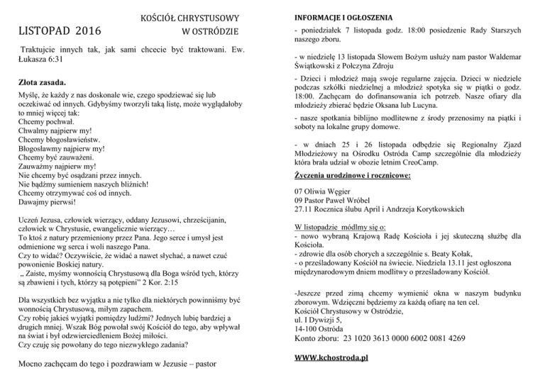 LISTOPAD 2016 KOŚCIÓŁ CHRYSTUSOWY W OSTRÓDZIE Traktujcie innych tak, jak sami chcecie być traktowani. Ew. Łukasza 6:31 Złota zasada. Myślę, że każdy z nas doskonale wie, czego spodziewać się lub oczekiwać od innych. Gdybyśmy tworzyli taką listę, może wyglądałoby to mniej więcej tak: Chcemy pochwał. Chwalmy najpierw my! Chcemy błogosławieństw. Błogosławmy najpierw my! Chcemy być zauważeni. Zauważmy najpierw my! Nie chcemy być osądzani przez innych. Nie bądźmy sumieniem naszych bliźnich! Chcemy otrzymywać coś od innych. Dawajmy pierwsi! Uczeń Jezusa, człowiek wierzący, oddany Jezusowi, chrześcijanin, człowiek w Chrystusie, ewangelicznie wierzący… To ktoś z natury przemieniony przez Pana. Jego serce i umysł jest odmienione wg serca i woli naszego Pana. Czy to widać? Oczywiście, że widać a nawet słychać, a nawet czuć powonienie Boskiej natury. „ Zaiste, myśmy wonnością Chrystusową dla Boga wśród tych, którzy są zbawieni i tych, którzy są potępieni” 2 Kor. 2:15 Dla wszystkich bez wyjątku a nie tylko dla niektórych powinniśmy być wonnością Chrystusową, miłym zapachem. Czy robię jakieś wyjątki pomiędzy ludźmi? Jednych lubię bardziej a drugich mniej. Wszak Bóg powołał swój Kościół do tego, aby wpływał na świat i był odzwierciedleniem Bożej miłości. Czy czuję się powołany do tego niezwykłego zadania? Mocno zachęcam do tego i pozdrawiam w Jezusie – pastor INFORMACJE I OGŁOSZENIA - poniedziałek 7 listopada godz. 18:00 posiedzenie Rady Starszych naszego zboru. - w niedzielę 13 listopada Słowem Bożym usłuży nam pastor Waldemar Świątkowski z Połczyna Zdroju - Dzieci i młodzież mają swoje regularne zajęcia. Dzieci w niedziele podczas szkółki niedzielnej a młodzież spotyka się w piątki o godz. 18:00. Zachęcam do dofinansowania ich potrzeb. Nasze ofiary dla młodzieży zbierać będzie Oksana lub Lucyna. - nasze spotkania biblijno modlitewne z środy przenosimy na piątki i soboty na lokalne grupy domowe. - w dniach 25 i 26 listopada odbędzie się Regionalny Zjazd Młodzieżowy na Ośrodku Ostróda Camp szczególnie dla młodzieży która brała udział w obozie letnim CreoCamp. Życzenia urodzinowe i rocznicowe: 07 Oliwia Węgier 09 Pastor Paweł Wróbel 27.11 Rocznica ślubu April i Andrzeja Korytkowskich W listopadzie módlmy się o: - nowo wybraną Krajową Radę Kościoła i jej skuteczną służbę dla Kościoła. - zdrowie dla osób chorych a szczególnie s. Beaty Kołak, - o prześladowany Kościół na świecie. Niedziela 13.11 jest ogłoszona międzynarodowym dniem modlitwy o prześladowany Kościół. -Jeszcze przed zimą chcemy wymienić okna w naszym budynku zborowym. Wdzięczni będziemy za każdą ofiarę na ten cel. Kościół Chrystusowy w Ostródzie, ul. I Dywizji 5, 14-100 Ostróda Konto zboru: 23 1020 3613 0000 6002 0081 4269 WWW.kchostroda.pl