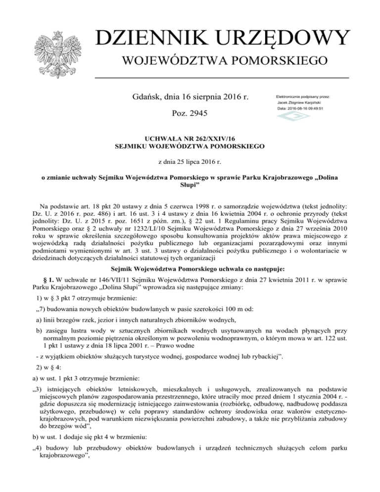 DZIENNIK URZĘDOWY WOJEWÓDZTWA POMORSKIEGO Gdańsk, dnia 16 sierpnia 2016 r. Elektronicznie podpisany przez: Jacek Zbigniew Karpiński Poz. 2945 Data: 2016-08-16 09:49:51 UCHWAŁA NR 262/XXIV/16 SEJMIKU WOJEWÓDZTWA POMORSKIEGO z dnia 25 lipca 2016 r. o zmianie uchwały Sejmiku Województwa Pomorskiego w sprawie Parku Krajobrazowego „Dolina Słupi” Na podstawie art. 18 pkt 20 ustawy z dnia 5 czerwca 1998 r. o samorządzie województwa (tekst jednolity: Dz. U. z 2016 r. poz. 486) i art. 16 ust. 3 i 4 ustawy z dnia 16 kwietnia 2004 r. o ochronie przyrody (tekst jednolity: Dz. U. z 2015 r. poz. 1651 z późn. zm.), § 22 ust. 1 Regulaminu pracy Sejmiku Województwa Pomorskiego oraz § 2 uchwały nr 1232/LI/10 Sejmiku Województwa Pomorskiego z dnia 27 września 2010 roku w sprawie określenia szczegółowego sposobu konsultowania projektów aktów prawa miejscowego z wojewódzką radą działalności pożytku publicznego lub organizacjami pozarządowymi oraz innymi podmiotami wymienionymi w art. 3 ust. 3 ustawy o działalności pożytku publicznego i o wolontariacie w dziedzinach dotyczących działalności statutowej tych organizacji Sejmik Województwa Pomorskiego uchwala co następuje: § 1. W uchwale nr 146/VII/11 Sejmiku Województwa Pomorskiego z dnia 27 kwietnia 2011 r. w sprawie Parku Krajobrazowego „Dolina Słupi” wprowadza się następujące zmiany: 1) w § 3 pkt 7 otrzymuje brzmienie: „7) budowania nowych obiektów budowlanych w pasie szerokości 100 m od: a) linii brzegów rzek, jezior i innych naturalnych zbiorników wodnych, b) zasięgu lustra wody w sztucznych zbiornikach wodnych usytuowanych na wodach płynących przy normalnym poziomie piętrzenia określonym w pozwoleniu wodnoprawnym, o którym mowa w art. 122 ust. 1 pkt 1 ustawy z dnia 18 lipca 2001 r. – Prawo wodne - z wyjątkiem obiektów służących turystyce wodnej, gospodarce wodnej lub rybackiej”. 2) w § 4: a) w ust. 1 pkt 3 otrzymuje brzmienie: „3) istniejących obiektów letniskowych, mieszkalnych i usługowych, zrealizowanych na podstawie miejscowych planów zagospodarowania przestrzennego, które utraciły moc przed dniem 1 stycznia 2004 r. gdzie dopuszcza się modernizację istniejącego zainwestowania (rozbiórkę, odbudowę, nadbudowę poddasza użytkowego, przebudowę) w celu poprawy standardów ochrony środowiska oraz walorów estetycznokrajobrazowych, pod warunkiem niezwiększania powierzchni zabudowy, a także nie przybliżania zabudowy do brzegów wód”, b) w ust. 1 dodaje się pkt 4 w brzmieniu: „4) budowy lub przebudowy obiektów budowlanych i urządzeń technicznych służących celom parku krajobrazowego”, Dziennik Urzędowy Województwa Pomorskiego –2– Poz. 2945 c) dodaje się ust. 2a i 2b w brzmieniu: „2a. Zakaz o którym mowa w § 3 pkt 3 dotyczy zadrzewień śródpolnych o charakterze pasmowym, pełniących funkcje przeciwerozyjne oraz o charakterze obszarowym w formie kęp, wyraźnie odróżniających się w krajobrazie”, „2b. Zakaz o którym mowa w § 3 pkt 12 nie dotyczy dróg publicznych w rozumieniu ustawy z dnia 21 marca 1985 r. o drogach publicznych (t.j. Dz. U. z 2015 r. poz. 460 z późn. zm.)”. d) ust.3 otrzymuje brzmienie: „3. Zakaz o którym mowa w § 3 pkt 13 nie dotyczy: 1) używania łodzi o napędzie elektrycznym o mocy do 5 KM, z wyłączeniem jezior lobeliowych, takich jak: Jez. Modre (Łupalickie, Błękitne), Jez. Obrówko (Obrowo Małe), Jez. Pomysko (Pomyskie, Dworcowe), Jez. Duże Sitno (Nakło), Jez. Czarnowie (Czarne k. Unichowa), Jez. Dołgie (Długie), Jez. Piaszno – gmina Czarna Dąbrówka, Jez. Okoniewskie (Moczydło), Jez. Czarne, Jez. Krosnowskie – Gmina Borzytuchom, Jez. Godzierz (Godzierz Duża) – gmina Kołczygłowy, 2) prowadzenia prac badawczo-naukowych przez jednostki naukowe w rozumieniu ustawy z dnia 30 kwietnia 2010 r. o zasadach finansowania nauki (t.j. Dz. U. z 2014 r. poz. 1620 z późn. zm.), 3) zapewnienia bezpieczeństwa uprawiającym sporty żeglarskie w formach zorganizowanych (szkółki, kluby, regaty)”. § 2. Uchwała wchodzi w życie po upływie 14 dni od opublikowania w Dzienniku Urzędowym Województwa Pomorskiego. § 3. Wykonanie uchwały powierza się Zarządowi Województwa Pomorskiego. Przewodniczący Sejmiku Województwa Pomorskiego Jan Kleinszmidt