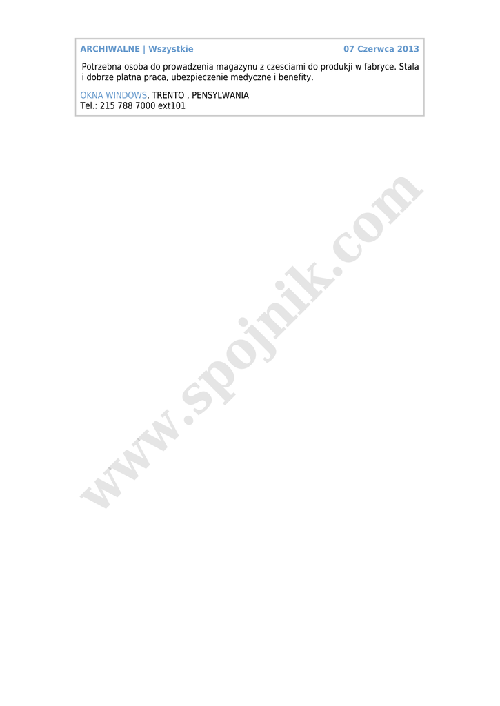 ARCHIWALNE | Wszystkie 07 Czerwca 2013 Potrzebna osoba do prowadzenia magazynu z czesciami do produkji w fabryce. Stala i dobrze platna praca, ubezpieczenie medyczne i benefity. w w w .s po jn ik .c o m OKNA WINDOWS, TRENTO , PENSYLWANIA Tel.: 215 788 7000 ext101