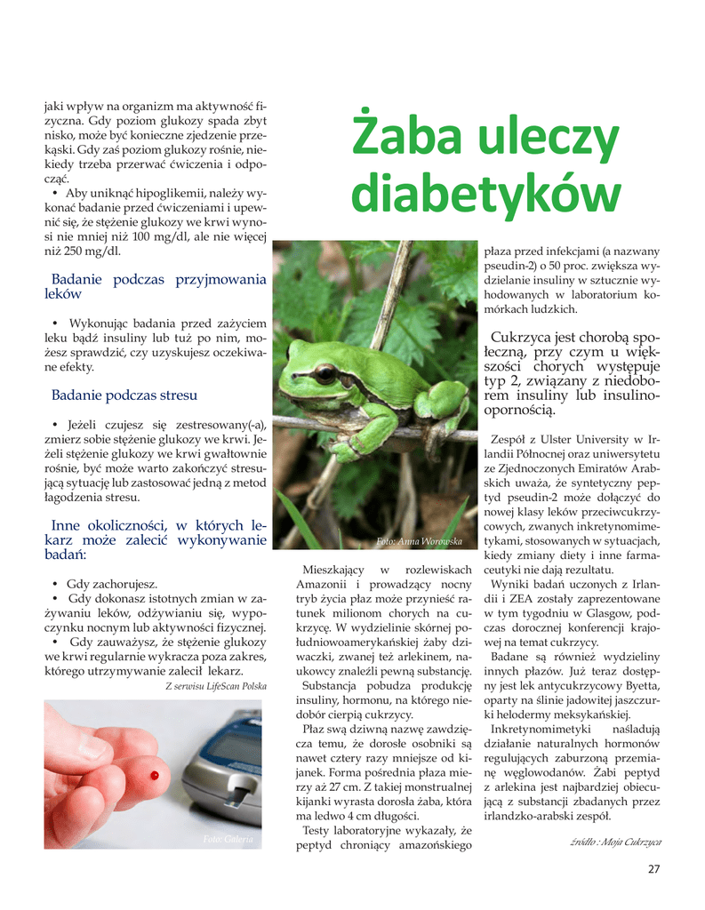 jaki wpływ na organizm ma aktywność fizyczna. Gdy poziom glukozy spada zbyt nisko, może być konieczne zjedzenie przekąski. Gdy zaś poziom glukozy rośnie, niekiedy trzeba przerwać ćwiczenia i odpocząć. • Aby uniknąć hipoglikemii, należy wykonać badanie przed ćwiczeniami i upewnić się, że stężenie glukozy we krwi wynosi nie mniej niż 100 mg/dl, ale nie więcej niż 250 mg/dl. Żaba uleczy diabetyków płaza przed infekcjami (a nazwany pseudin-2) o 50 proc. zwiększa wydzielanie insuliny w sztucznie wyhodowanych w laboratorium komórkach ludzkich. Badanie podczas przyjmowania leków • Wykonując badania przed zażyciem leku bądź insuliny lub tuż po nim, możesz sprawdzić, czy uzyskujesz oczekiwane efekty. Cukrzyca jest chorobą społeczną, przy czym u większości chorych występuje typ 2, związany z niedoborem insuliny lub insulinoopornością. Badanie podczas stresu • Jeżeli czujesz się zestresowany(-a), zmierz sobie stężenie glukozy we krwi. Jeżeli stężenie glukozy we krwi gwałtownie rośnie, być może warto zakończyć stresującą sytuację lub zastosować jedną z metod łagodzenia stresu. Inne okoliczności, w których lekarz może zalecić wykonywanie badań: • Gdy zachorujesz. • Gdy dokonasz istotnych zmian w zażywaniu leków, odżywianiu się, wypoczynku nocnym lub aktywności fizycznej. • Gdy zauważysz, że stężenie glukozy we krwi regularnie wykracza poza zakres, którego utrzymywanie zalecił lekarz. Z serwisu LifeScan Polska Foto: Galeria Foto: Anna Worowska Mieszkający w rozlewiskach Amazonii i prowadzący nocny tryb życia płaz może przynieść ratunek milionom chorych na cukrzycę. W wydzielinie skórnej południowoamerykańskiej żaby dziwaczki, zwanej też arlekinem, naukowcy znaleźli pewną substancję. Substancja pobudza produkcję insuliny, hormonu, na którego niedobór cierpią cukrzycy. Płaz swą dziwną nazwę zawdzięcza temu, że dorosłe osobniki są nawet cztery razy mniejsze od kijanek. Forma pośrednia płaza mierzy aż 27 cm. Z takiej monstrualnej kijanki wyrasta dorosła żaba, która ma ledwo 4 cm długości. Testy laboratoryjne wykazały, że peptyd chroniący amazońskiego Zespół z Ulster University w Irlandii Północnej oraz uniwersytetu ze Zjednoczonych Emiratów Arabskich uważa, że syntetyczny peptyd pseudin-2 może dołączyć do nowej klasy leków przeciwcukrzycowych, zwanych inkretynomimetykami, stosowanych w sytuacjach, kiedy zmiany diety i inne farmaceutyki nie dają rezultatu. Wyniki badań uczonych z Irlandii i ZEA zostały zaprezentowane w tym tygodniu w Glasgow, podczas dorocznej konferencji krajowej na temat cukrzycy. Badane są również wydzieliny innych płazów. Już teraz dostępny jest lek antycukrzycowy Byetta, oparty na ślinie jadowitej jaszczurki helodermy meksykańskiej. Inkretynomimetyki naśladują działanie naturalnych hormonów regulujących zaburzoną przemianę węglowodanów. Żabi peptyd z arlekina jest najbardziej obiecującą z substancji zbadanych przez irlandzko-arabski zespół. źródło : Moja Cukrzyca 27