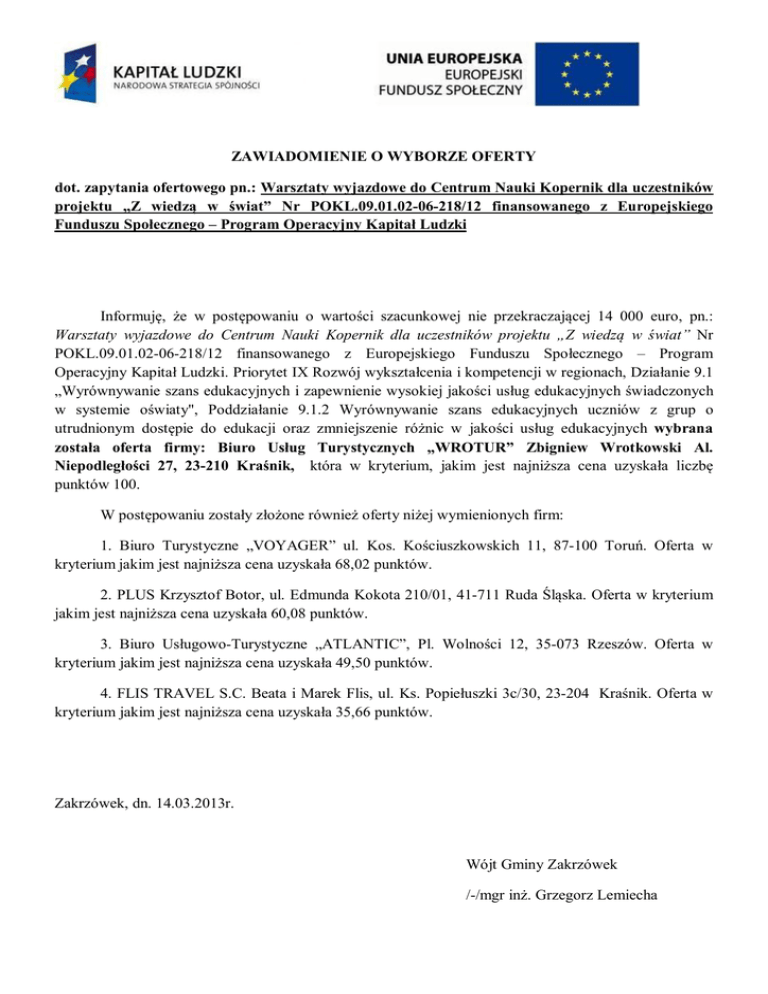 ZAWIADOMIENIE O WYBORZE OFERTY dot. zapytania ofertowego pn.: Warsztaty wyjazdowe do Centrum Nauki Kopernik dla uczestników projektu „Z wiedzą w świat” Nr POKL.09.01.02-06-218/12 finansowanego z Europejskiego Funduszu Społecznego – Program Operacyjny Kapitał Ludzki Informuję, że w postępowaniu o wartości szacunkowej nie przekraczającej 14 000 euro, pn.: Warsztaty wyjazdowe do Centrum Nauki Kopernik dla uczestników projektu „Z wiedzą w świat” Nr POKL.09.01.02-06-218/12 finansowanego z Europejskiego Funduszu Społecznego – Program Operacyjny Kapitał Ludzki. Priorytet IX Rozwój wykształcenia i kompetencji w regionach, Działanie 9.1 „Wyrównywanie szans edukacyjnych i zapewnienie wysokiej jakości usług edukacyjnych świadczonych w systemie oświaty", Poddziałanie 9.1.2 Wyrównywanie szans edukacyjnych uczniów z grup o utrudnionym dostępie do edukacji oraz zmniejszenie różnic w jakości usług edukacyjnych wybrana została oferta firmy: Biuro Usług Turystycznych „WROTUR” Zbigniew Wrotkowski Al. Niepodległości 27, 23-210 Kraśnik, która w kryterium, jakim jest najniższa cena uzyskała liczbę punktów 100. W postępowaniu zostały złożone również oferty niżej wymienionych firm: 1. Biuro Turystyczne „VOYAGER” ul. Kos. Kościuszkowskich 11, 87-100 Toruń. Oferta w kryterium jakim jest najniższa cena uzyskała 68,02 punktów. 2. PLUS Krzysztof Botor, ul. Edmunda Kokota 210/01, 41-711 Ruda Śląska. Oferta w kryterium jakim jest najniższa cena uzyskała 60,08 punktów. 3. Biuro Usługowo-Turystyczne „ATLANTIC”, Pl. Wolności 12, 35-073 Rzeszów. Oferta w kryterium jakim jest najniższa cena uzyskała 49,50 punktów. 4. FLIS TRAVEL S.C. Beata i Marek Flis, ul. Ks. Popiełuszki 3c/30, 23-204 Kraśnik. Oferta w kryterium jakim jest najniższa cena uzyskała 35,66 punktów. Zakrzówek, dn. 14.03.2013r. Wójt Gminy Zakrzówek /-/mgr inż. Grzegorz Lemiecha