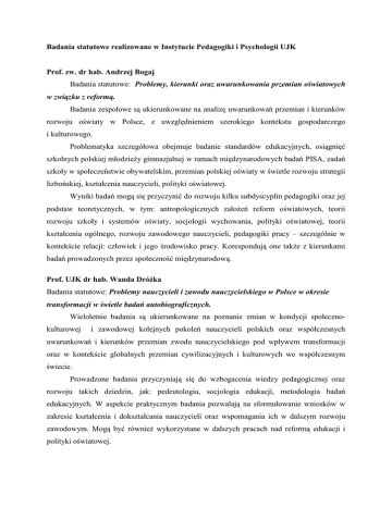 Badania statutowe realizowane w Instytucie Pedagogiki i Psychologii UJK Prof. zw. dr hab. Andrzej Bogaj Badania statutowe: Problemy, kierunki oraz uwarunkowania przemian oświatowych w związku z reformą. Badania zespołowe są ukierunkowane na analizę uwarunkowań przemian i kierunków rozwoju oświaty w Polsce, z uwzględnieniem szerokiego kontekstu gospodarczego i kulturowego. Problematyka szczegółowa obejmuje badanie standardów edukacyjnych, osiągnięć szkolnych polskiej młodzieŜy gimnazjalnej w ramach międzynarodowych badań PISA, zadań szkoły w społeczeństwie obywatelskim, przemian polskiej oświaty w świetle rozwoju strategii lizbońskiej, kształcenia nauczycieli, polityki oświatowej. Wyniki badań mogą się przyczynić do rozwoju kilku subdyscyplin pedagogiki oraz jej podstaw teoretycznych, w tym: antropologicznych załoŜeń reform oświatowych, teorii rozwoju szkoły i systemów oświaty, socjologii wychowania, polityki oświatowej, teorii kształcenia ogólnego, rozwoju zawodowego nauczycieli, pedagogiki pracy – szczególnie w kontekście relacji: człowiek i jego środowisko pracy. Korespondują one takŜe z kierunkami badań prowadzonych przez społeczność międzynarodową. Prof. UJK dr hab. Wanda DróŜka Badania statutowe: Problemy nauczycieli i zawodu nauczycielskiego w Polsce w okresie transformacji w świetle badań autobiograficznych. Wieloletnie badania są ukierunkowane na poznanie zmian w kondycji społecznokulturowej i zawodowej kolejnych pokoleń nauczycieli polskich oraz współczesnych uwarunkowań i kierunków przemian zwodu nauczycielskiego pod wpływem transformacji oraz w kontekście globalnych przemian cywilizacyjnych i kulturowych we współczesnym świecie. Prowadzone badania przyczyniają się do wzbogacenia wiedzy pedagogicznej oraz rozwoju takich dziedzin, jak: pedeutologia, socjologia edukacji, metodologia badań edukacyjnych. W aspekcie praktycznym badania pozwalają na sformułowanie wniosków w zakresie kształcenia i dokształcania nauczycieli oraz wspomagania ich w dalszym rozwoju zawodowym. Mogą być równieŜ wykorzystane w dalszych pracach nad reformą edukacji i polityki oświatowej. Prof. UJK dr hab. BoŜena Matyjas Badania statutowe: Dzieciństwo we współczesnej rodzinie polskiej. Dzieciństwo w rodzinie bezrobotnej Badania dotyczą róŜnych wymiarów Ŝycia dziecka w okresie średniego dzieciństwa w rodzinie na wsi i w mieście. Celem badań jest poznanie sytuacji wychowawczej i edukacyjnej dzieci z róŜnych środowisk, a następnie wypracowanie strategii pomocy i wsparcia rodzin w prawidłowym wypełnianiu funkcji i zadań opiekuńczo – wychowawczych. Prowadzone badania przyczyniają się do rozwoju teorii i praktyki w zakresie wielu dyscyplin pedagogicznych, a zwłaszcza w dziedzinie pedagogiki społecznej, pedagogiki rodziny, pracy socjalnej. Prof. UJK dr hab. Irena Pufal-Struzik Badania statutowe: Psychologiczne podstawy aktywności zawodowej kobiet i męŜczyzn w róŜnych dziedzinach. Wieloletnie badania empiryczne ludzi twórczych i przedsiębiorczych są skoncentrowane na poszukiwaniu uwarunkowań zachowań twórczych, zaradnych i przedsiębiorczych, takich jak: dyspozycje psychiczne, umiejętność planowania i realizacji kariery zawodowej, przejawiania inicjatywy, rozwijania kompetencji, otwartości wobec zmian, postawy twórczej. Problematyka badań jest podyktowana potrzebami poznawczymi i społecznymi. Badania przyczyniają się do rozwoju takich dziedzin wiedzy, jak: psychologia twórczości i psychologia ekonomiczna. Wyniki badań mogą być szeroko wykorzystywane w praktyce edukacyjnej. Prof. UJK dr hab. Henryk Cudak Badania statutowe: Zaburzenia procesu socjalizacji dzieci i młodzieŜy we współczesnej rodzinie. W badaniach zespołowych podjęto problematykę wpływu na socjalizację dzieci i młodzieŜy następujących czynników: kultury pedagogicznej rodziców, postaw rodzicielskich, metod wychowawczych, atmosfery domu rodzinnego, osłabionych bądź zerwanych więzi rodzinnych. Przyjęto równieŜ, iŜ na zjawisko zaburzeń w procesie socjalizacji oddziałują pozarodzinne czynniki makrospołeczne, jak szkoła, grupa rówieśnicza, środki masowego przekazu, środowisko lokalne. Prowadzone badania mają istotne znaczenie poznawcze, społeczne i praktyczne. Przyczyniają się do wzbogacenia teoretycznej i praktycznej wiedzy z zakresu pedagogiki oraz wielu subdyscyplin pedagogicznych, w tym zwłaszcza pedagogiki społecznej oraz pedagogiki rodziny.