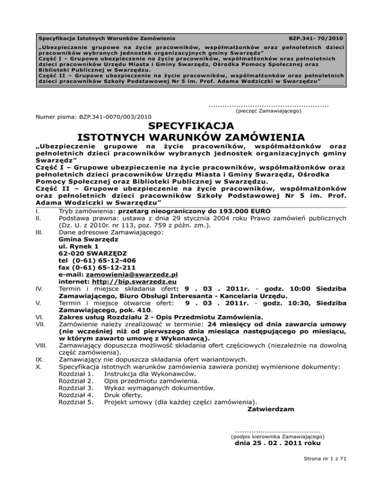 Specyfikacja Istotnych Warunków Zamówienia BZP.341- 70/2010 „Ubezpieczenie grupowe na życie pracowników, współmałżonków oraz pełnoletnich dzieci pracowników wybranych jednostek organizacyjnych gminy Swarzędz” Część I – Grupowe ubezpieczenie na życie pracowników, współmałżonków oraz pełnoletnich dzieci pracowników Urzędu Miasta i Gminy Swarzędz, Ośrodka Pomocy Społecznej oraz Biblioteki Publicznej w Swarzędzu. Część II – Grupowe ubezpieczenie na życie pracowników, współmałżonków oraz pełnoletnich dzieci pracowników Szkoły Podstawowej Nr 5 im. Prof. Adama Wodziczki w Swarzędzu” .................................................... Numer pisma: BZP.341-0070/003/2010 (pieczęć Zamawiającego) SPECYFIKACJA ISTOTNYCH WARUNKÓW ZAMÓWIENIA „Ubezpieczenie grupowe na życie pracowników, współmałżonków oraz pełnoletnich dzieci pracowników wybranych jednostek organizacyjnych gminy Swarzędz” Część I – Grupowe ubezpieczenie na życie pracowników, współmałżonków oraz pełnoletnich dzieci pracowników Urzędu Miasta i Gminy Swarzędz, Ośrodka Pomocy Społecznej oraz Biblioteki Publicznej w Swarzędzu. Część II – Grupowe ubezpieczenie na życie pracowników, współmałżonków oraz pełnoletnich dzieci pracowników Szkoły Podstawowej Nr 5 im. Prof. Adama Wodziczki w Swarzędzu” I. Tryb zamówienia: przetarg nieograniczony do 193.000 EURO II. Podstawa prawna: ustawa z dnia 29 stycznia 2004 roku Prawo zamówień publicznych (Dz. U. z 2010r. nr 113, poz. 759 z późn. zm.). III. Dane adresowe Zamawiającego: Gmina Swarzędz ul. Rynek 1 62-020 SWARZĘDZ tel (0-61) 65-12-406 fax (0-61) 65-12-211 e-mail: [email protected] internet: http://bip.swarzedz.eu IV. Termin i miejsce składania ofert: 9 . 03 . 2011r. - godz. 10:00 Siedziba Zamawiającego, Biuro Obsługi Interesanta - Kancelaria Urzędu. V. Termin i miejsce otwarcie ofert: 9 . 03 . 2011r. - godz. 10:30, Siedziba Zamawiającego, pok. 410. VI. Zakres usług Rozdziału 2 - Opis Przedmiotu Zamówienia. VII. Zamówienie należy zrealizować w terminie: 24 miesięcy od dnia zawarcia umowy (nie wcześniej niż od pierwszego dnia miesiąca następującego po miesiącu, w którym zawarto umowę z Wykonawcą). VIII. Zamawiający dopuszcza możliwość składania ofert częściowych (niezależnie na dowolną część zamówienia). IX. Zamawiający nie dopuszcza składania ofert wariantowych. X. Specyfikacja istotnych warunków zamówienia zawiera poniżej wymienione dokumenty: Rozdział 1. Instrukcja dla Wykonawców. Rozdział 2. Opis przedmiotu zamówienia. Rozdział 3. Wykaz wymaganych dokumentów. Rozdział 4. Druk oferty. Rozdział 5. Projekt umowy (dla każdej części zamówienia). Zatwierdzam ............…………………………… (podpis kierownika Zamawiającego) dnia 25 . 02 . 2011 roku Strona nr 1 z 71 Specyfikacja Istotnych Warunków Zamówienia BZP.341- 70/2010 „Ubezpieczenie grupowe na życie pracowników, współmałżonków oraz pełnoletnich dzieci pracowników wybranych jednostek organizacyjnych gminy Swarzędz” Część I – Grupowe ubezpieczenie na życie pracowników, współmałżonków oraz pełnoletnich dzieci pracowników Urzędu Miasta i Gminy Swarzędz, Ośrodka Pomocy Społecznej oraz Biblioteki Publicznej w Swarzędzu. Część II – Grupowe ubezpieczenie na życie pracowników, współmałżonków oraz pełnoletnich dzieci pracowników Szkoły Podstawowej Nr 5 im. Prof. Adama Wodziczki w Swarzędzu” Rozdział 1 INSTRUKCJA DLA WYKONAWÓW 1. Opis sposobu porozumiewania Zamawiającego z Wykonawcami oraz przygotowania i złożenia ofert. 1.1. Zamawiający oraz Wykonawcy przekazują sobie wnioski, oświadczenia, zawiadomienia oraz informacje drogą pisemną i faksem. Na żądanie drugiej strony należy niezwłocznie potwierdzić fakt otrzymania faksem wniosku, oświadczenia, zawiadomienia lub informacji. 1.2.Wykonawca przedstawia ofertę zgodnie z wymaganiami określonymi w niniejszej specyfikacji: a) Wykonawca ponosi wszelkie ryzyko związane ze złożeniem oferty w niewłaściwej formie lub terminie. b) Wykonawca jest zobowiązany do zdobycia wszelkich informacji, które będą konieczne do przygotowania oferty. 1.3.Wykonawca ponosi wszelkie koszty związane z przygotowaniem i złożeniem oferty. A ponadto: 1.4.Niniejsza specyfikacja oraz wszystkie dokumenty do niej załączone mogą być wykorzystane jedynie w celu sporządzenia oferty. 1.5.Oferta musi dotyczyć danej części zamówienia lub obu części – zamawiający dopuszcza możliwość złożenia ofert częściowych na każdą część niezależnie. 1.6.Wykonawca może złożyć tylko jedną ofertę. 1.7.Forma oferty. a) Wykonawca składa ofertę w formie pisemnej pod rygorem nieważności. b) Oferta musi być napisana czytelnie (odręcznie, na maszynie, komputerze lub inna trwałą techniką) w języku polskim. Wszystkie dokumenty sporządzone w języku obcym muszą być załączone do oferty wraz z tłumaczeniami w języku polskim sporządzonymi przez tłumaczy przysięgłych. c) Treść oferty musi być podpisana przez osobę upoważnioną do reprezentowania Wykonawcy. d) Wszystkie zapisane strony oferty (w tym wszystkie zapisane strony jej załączników) muszą być: – kolejno ponumerowane (błędy w numeracji nie powodują odrzucenia oferty); – zaparafowane przez osobę wymienioną w odpisie z właściwego rejestru lub ewidencji, upoważnioną przez wyżej wymienioną osobę do podpisania oferty; w tym ostatnim przypadku do oferty należy dołączyć upoważnienie do podpisania oferty – podpisane przez osoby figurujące w rejestrze lub ewidencji; (uchybienia w parafowaniu nie powodują odrzucenia oferty), – oświadczenia wykonawcy (tj. formularz ofertowy, załączone do niego wykazy i oświadczenia) muszą być podpisane przez osobę wymienioną w odpisie z właściwego rejestru lub ewidencji, lub upoważnioną przez wyżej wymienioną osobę do podpisania oferty