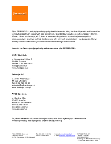 Płyta FERMACELL jest płytą nadającą się do okleinowania folią, fornirami i powłokami laminatów termoutwardzalnych sklejanych pod ciśnieniem. Standardowe grubości płyt wynoszą: 12,5mm, 15mm, 18mm z tolerancją +/- 0,3mm w stosunku do grubości nominalnej we wszystkich miejscach płyty. Możliwe jest też dostarczenie płyt o innych grubościach – na życzenie. Ceny i terminy dostaw ustalane są w zależności od konkretnego zamówienia. Kontakt do firm zajmujących się okleinowaniem płyt FERMACELL Multi. Sp. z o.o. ul. Morawska 28 lok. 7 61-614 Poznań Tel/fax: 0 61 813 42 51 [email protected] www.multipanel.pl Sekwoja S.C. ul. Armii Krajowej 37 41-506 Chorzów Tel.: 0 32 729 80 63 [email protected] www.sekwoja.com.pl ATOS Sp. z o.o. ul. Skośna 12A 30-383 Kraków tel/fax: 012 633-60-97 tel 012 262-14-54 [email protected] www.atos.com.pl Za jakość sklejenia odpowiedzialna jest wyłącznie firma wykonująca okleinowanie! W razie potrzeby nasi specjaliści chętnie służą pomocą. FELS-WERKE Sp. z o.o. Tel: 022-645 13 38 (9) Oddział w Polsce Fax: 022-645 15 59 02-796 Warszawa, ul. Migdałowa 4 Internet: www.fermacell.pl e-mail: [email protected] NIP:526-17-63-461 Regon 12317963 KRS 0000072241 Sąd Rej. dla Miasta St. Warszawy XX Wydział Gospodarczy KRS