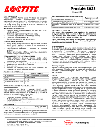 Arkusz danych technicznych Produkt 8023 Sierpień 2003 OPIS PRODUKTU Produkt LOCTITE® Marine Grade Anti-Seize jest specjalnie opracowanym smarem zapobiegającym zatarciom i zapieczeniom, przeznaczonym do zabezpieczania elementów narażonych na bezpośrednie lub pośrednie działanie świeżej lub słonej wody oraz sprzętu i urządzeń pracujących w warunkach wysokiej wilgotności. WŁAŚCIWOŚCI PRODUKTU • Zalecany zakres temperatur pracy od -29ºC do 1,315ºC (-20°F to 2,400°F) • Znakomita odporność na wypłukiwanie wodą • Doskonała odporność na działanie mgły wodnej • Znakomite właściwości smarne • Zabezpiecza przed korozją galwaniczną TYPOWE ZASTOSOWANIA • Śruby, wkręty, śruby dwustronne, złącza rurowe, nakrętki, wałki, tulejki, wypusty, łańcuchy i liny stosowane w przemyśle stoczniowym • Zabezpieczanie uszczelek i kołnierzy w pompach wodnych • Zakłady produkujące celulozę, papiernie, oczyszczalnie ścieków i stacje uzdatniania wody WSKAZÓWKI DOTYCZĄCE STOSOWANIA 1. Przed nałożeniem produktu łączone części należy starannie oczyścić (Użyj szczotki drucianej by usunąć pozostałości starego smaru). 2. Nanieś cienką warstwę na powierzchnie montowanych elementów; nie używaj rozpuszczalnika. 3. Zmontuj części. 4. Pojemnik ze smarem należy po użyciu zamknąć aby zabezpieczyć przed zanieczyszczeniem. WŁASNOŚCI MATERIAŁU Typ chemiczny Wygląd Ciężar właściwy Temperatura zapłonu (CC), °C Typowe wartości Smar z sulfonianem wapniowym Czarna pasta 1.25 >100 TYPOWE WŁASNOŚCI FUNKCJONALNE Moment dociągania Smar nałożono na śruby i nakrętki 3/8x16, próby przeprowadzono na stanowisku testowym Skidmore-Wilhelm. Podane wartości współczynnika K uzyskano przy momencie dociągania wynoszącym 22 kN (5000 lbs). T=KxFxD • • • • T = Moment dociągania (N·m, in-lb, ft-lb) K = Doświadczalny współczynnik tarcia złącza gwintowego F = Siła zacisku (N, lb) D = Nominalna średnica śruby (m, in, ft) Współczynnik K: Doświadczalny współczynnik tarcia Typowa wartość 0.18 Loctite nie daje żadnych gwarancji na specyficzne własności poszczególnych elementów złącznych. W trudnych aplikacjach konieczne jest niezależne określenie wartości K. Typowe własności funkcjonalne materiału Wypłukiwanie wodą, ASTM D1264, % Korozja na miedzi, ASTM D130-94 Separacja oleju, FTM 791, Metoda 321.3, % Zacieranie i zapiekanie, PRF 907E Metoda 4.5.2.1 Odporność na korozję, Mgła solna, ASTM B117 ROCKY HILL, CT FAX: +1 (860)-571-5473 DUBLIN, IRLANDIA FAX: +353-(1)-451 - 9959 Brak widocznych zmian Magazynowanie O ile na etykiecie produktu nie ma innych wskazań, idealnym sposobem jego przechowywania będzie pozostawienie go w zamkniętych pojemnikach w chłodnym i suchym pomieszczeniu w temperaturze pomiędzy 8°C a 28°C (46°F do 82°F). Optymalna temperatura magazynowania to dolna połowa tego zakresu. Resztek materiału nie należy umieszczać z powrotem w jego oryginalnym pojemniku, gdyż mogłoby dojść do zanieczyszczenia produktu. Dalsze informacje na temat okresu przydatności produktu można uzyskać w lokalnym ośrodku obsługi technicznej. Zakresy danych Przytoczone tutaj dane mogą służyć jako typowe wartości i/lub jako ich zakres. Wartości oparte są na danych uzyskanych z aktualnie przeprowadzonych badań i są okresowo weryfikowane. Uwaga Materiał zawarty w niniejszym opracowaniu został przygotowany w oparciu o najlepszą wiedzę i służy jedynie celom informacyjnym. Henkel Loctite nie ponosi odpowiedzialności za wybraną przez użytkownika metodę lub sposób jej zastosowania, a w konsekwencji za uzyskane przez niego rezultaty. Sprawą użytkownika jest także podjęcie odpowiednich środków ostrożności, aby uniknąć ewentualnego ryzyka dla produkcji i osób, wiążącego się z użytkowaniem produktu. Korporacja Henkel Loctite nie uwzględnia żadnych roszczeń związanych z uszkodzeniem, zniszczeniem produkcji czy utratą zysku. Stanowisko to wynika z faktu, że Korporacja Henkel Loctite nie ma kontroli nad sposobami korzystania z produktu przez poszczególnych użytkowników, nie możemy zatem współuczestniczyć w konsekwencjach ewentualnych błędów czy niedopatrzeń. Opisane tutaj procesy nie muszą być wyłącznie patentami lub licencjami Korporacji Henkel Loctite. Radzimy, aby każdy użytkownik, przed zastosowaniem produktu, przeprowadził własną próbę posługując się przedstawionymi tu danymi jako przewodnikiem. Ten produkt może być objęty jednym lub większą liczbą patentów lub opatentowanych aplikacji amerykańskich lub innych krajów. PRZYTOCZONE TUTAJ DANE TECHNICZNE MAJĄ JEDYNIE SŁUŻYĆ JAKO PUNKTY ODNIESIENIA. PROSZĘ ZWRÓCIĆ SIĘ DO DZIAŁU JAKOŚCI KORPORACJI LOCTITE. Brak widocznych zmian 0.21 Brak widocznych zmian INFORMACJA OGÓLNA Nie poleca się stosowania tego produktu do urządzeń z czystym tlenem i/lub bogatych w tlen; nie powinien też być używany jako uszczelniacz do instalacji z chlorem i innych materiałów silnie utleniających. Pełna informacja dotycząca bezpiecznego obchodzenia się z tym produktem znajduje się w Arkuszu Bezpieczeństwa dotyczącym materiału (MSDS). NIE DOTYCZY WYMOGÓW TECHNICZNYCH. PO POMOC I WSKAZÓWKI DOTYCZĄCE WARUNKÓW TECHNICZNYCH TEGO PRODUKTU Typowe wartości 0.0