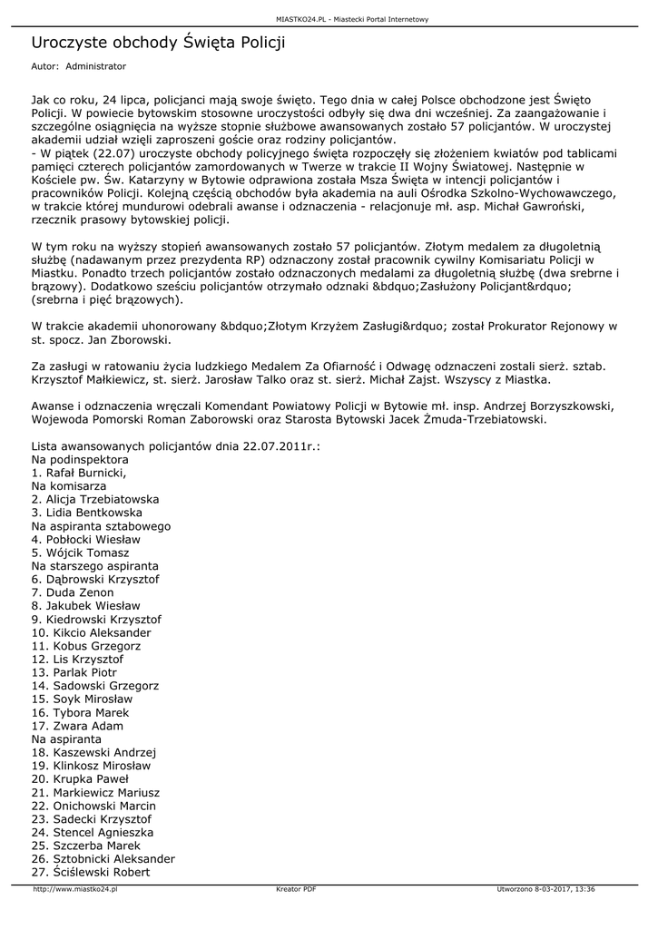 MIASTKO24.PL - Miastecki Portal Internetowy Uroczyste obchody Święta Policji Autor: Administrator Jak co roku, 24 lipca, policjanci mają swoje święto. Tego dnia w całej Polsce obchodzone jest Święto Policji. W powiecie bytowskim stosowne uroczystości odbyły się dwa dni wcześniej. Za zaangażowanie i szczególne osiągnięcia na wyższe stopnie służbowe awansowanych zostało 57 policjantów. W uroczystej akademii udział wzięli zaproszeni goście oraz rodziny policjantów. - W piątek (22.07) uroczyste obchody policyjnego święta rozpoczęły się złożeniem kwiatów pod tablicami pamięci czterech policjantów zamordowanych w Twerze w trakcie II Wojny Światowej. Następnie w Kościele pw. Św. Katarzyny w Bytowie odprawiona została Msza Święta w intencji policjantów i pracowników Policji. Kolejną częścią obchodów była akademia na auli Ośrodka Szkolno-Wychowawczego, w trakcie której mundurowi odebrali awanse i odznaczenia - relacjonuje mł. asp. Michał Gawroński, rzecznik prasowy bytowskiej policji. W tym roku na wyższy stopień awansowanych zostało 57 policjantów. Złotym medalem za długoletnią służbę (nadawanym przez prezydenta RP) odznaczony został pracownik cywilny Komisariatu Policji w Miastku. Ponadto trzech policjantów zostało odznaczonych medalami za długoletnią służbę (dwa srebrne i brązowy). Dodatkowo sześciu policjantów otrzymało odznaki „Zasłużony Policjant” (srebrna i pięć brązowych). W trakcie akademii uhonorowany „Złotym Krzyżem Zasługi” został Prokurator Rejonowy w st. spocz. Jan Zborowski. Za zasługi w ratowaniu życia ludzkiego Medalem Za Ofiarność i Odwagę odznaczeni zostali sierż. sztab. Krzysztof Małkiewicz, st. sierż. Jarosław Talko oraz st. sierż. Michał Zajst. Wszyscy z Miastka. Awanse i odznaczenia wręczali Komendant Powiatowy Policji w Bytowie mł. insp. Andrzej Borzyszkowski, Wojewoda Pomorski Roman Zaborowski oraz Starosta Bytowski Jacek Żmuda-Trzebiatowski. Lista awansowanych policjantów dnia 22.07.2011r.: Na podinspektora 1. Rafał Burnicki, Na komisarza 2. Alicja Trzebiatowska 3. Lidia Bentkowska Na aspiranta sztabowego 4. Pobłocki Wiesław 5. Wójcik Tomasz Na starszego aspiranta 6. Dąbrowski Krzysztof 7. Duda Zenon 8. Jakubek Wiesław 9. Kiedrowski Krzysztof 10. Kikcio Aleksander 11. Kobus Grzegorz 12. Lis Krzysztof 13. Parlak Piotr 14. Sadowski Grzegorz 15. Soyk Mirosław 16. Tybora Marek 17. Zwara Adam Na aspiranta 18. Kaszewski Andrzej 19. Klinkosz Mirosław 20. Krupka Paweł 21. Markiewicz Mariusz 22. Onichowski Marcin 23. Sadecki Krzysztof 24. Stencel Agnieszka 25. Szczerba Marek 26. Sztobnicki Aleksander 27. Ściślewski Robert http://www.miastko24.pl Kreator PDF Utworzono 8-03-2017, 13:36 MIASTKO24.PL - Miastecki Portal Internetowy 28. Wolski Rafał Na młodszego aspiranta 29. Koliński Sebastian 30. Lipka Paweł 31. Synak Anna 32. Błażejewicz Marcin 33. Gawroński Michał 34. Kafliński Bartłomiej Na sierżanta sztabowego 35. Baliński Radosław 36. Borys Robert 37. Bucewka Adam 38. Chadacz Daniel 39. Jaśniak Wojciech 40. Treder Grzegorz 41. Wirkus Marcin 42. Zelewski Wiesław 43. Żwirek Bartłomiej 44. Małkiewicz Krzysztof Na starszego sierżanta 45. Jóźwiak Rafał 46. Kaczmarek Ilona 47. Kuryło Bartosz 48. Prądzyńska Irena 49. Wiczk Antoni 50. Zajst Michał 51. Talko Jarosław Na sierżanta 52. Gostomczyk Piotr 53. Klój Artur 54. Piechowski Grzegorz 55. Warsiński Paweł Na starszego posterunkowego 56. Myszkowski Paweł 57. Wicher MagdalenaNa zakończenie akademii zagrał policyjny zespół EMO. http://www.miastko24.pl Kreator PDF Utworzono 8-03-2017, 13:36