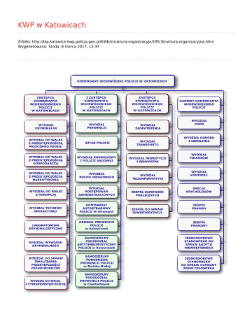 KWP w Katowicach Źródło: http://bip.katowice.kwp.policja.gov.pl/KWK/struktura-organizacyjn/195,Struktura-organizacyjna.html Wygenerowano: Środa, 8 marca 2017, 13:37 Ogólny stan etatowy Komendy Wojewódzkiej Policji w Katowicach wynosi na dzień 1 kwietnia 2016 r.: - 1357 stanowiska policyjne, - 420 stanowisk pracowniczych korpusu służby cywilnej, - 297 stanowisk pracowniczych nieobjętych mnożnikowymi systemami wynagrodzeń; stan etatowy Komisariatu Autostradowego Policji w Gliwicach: - 55 stanowiska policyjne, - 3 stanowiska pracownicze nieobjęte mnożnikowymi systemami wynagrodzeń. WYKAZ STANOWISK POLICYJNYCH WYSTĘPUJĄCYCH W STRUKTURZE ORGANIZACYJNEJ KOMENDY WOJEWÓDZKIEJ POLICJI W KATOWICACH Nazwa stanowiska Stopień etatowy Komendant Wojewódzki Policji I Zastępca Komendanta Wojewódzkiego Policji Zastępca Komendanta Wojewódzkiego Policji Główny ksiegowy - naczelnik wydziału Zastępca głównego księgowego - naczelnika wydziału Radca Prawny Radca Naczelnik wydziału, inspektoratu, laboratorium Rzecznik prasowy Zastępca naczelnika wydziału, laboratorium Komendant komisariatu Policji Ekspert Dyżurny Kierownik Sekcji Kierownik izby dziecka Kapelmistrz Kierownik referatu Zastępca dyżurnego Specjalista Kierownik ogniwa Dyżurny Asystent Detektyw Instruktor nadinspektor inspektor inspektor młodszy inspektor młodszy inspektor młodszy inspektor młodszy inspektor młodszy inspektor podinspektor podinspektor podinspektor podinspektor podinspektor podinspektor podinspektor podinspektor nadkomisarz nadkomisarz nadkomisarz aspirant sztabowy aspirant sztabowy aspirant sztabowy aspirant sztabowy aspirant sztabowy Grupa uposażenia zasadniczego 14a 13a 13a 12 11 11 11 11 10 10 9 9 9 9 7 8 7 7 6 6 6 5 5 5 Kontroler ruchu drogowego Referent Policjant aspirant sztabowy sierżant sztabowy starszy sierżant 4 3 2 WYKAZ STANOWISK PRACOWNICZYCH KORPUSU SŁUŻBY CYWILNEJ WYSTĘPUJĄCYCH W STRUKTURZE ORGANIZACYJNEJ KOMENDY WOJEWÓDZKIEJ POLICJI W KATOWICACH Nazwa stanowiska Audytor wewnętrzny Zastępca głównego księgowego Zastępca naczelnika wydziału Radca Prawny Główny specjalista Starszy specjalista Kierownik kancelarii tajnej Psycholog Specjalista Starszy inspektor Inspektor Starszy referent Księgowy WYKAZ STANOWISK PRACOWNICZYCH NIEOBJĘTYCH MNOŻNIKOWYM SYSTEMEM WYNAGRODZEŃ WYSTĘPUJĄCYCH W STRUKTURZE ORGANIZACYJNEJ KOMENDY WOJEWÓDZKIEJ POLICJI W KATOWICACH Nazwa stanowiska Kategoria zaszeregowania Mechanik elektronik Sekretarka Starszy mistrz Starszy technik Kierowca autobusu Kierownik obiektu Starszy kontroler techniczny Starszy dyspozytor Technik Mistrz Elektromechanik Ślusarz-tokarz Diagnosta samochodowy Elektryk samochodowy Kierowca samochodu specjalnego Blacharz samochodowy Lakiernik samochodowy XI-XIII IX-XIII XI-XII X-XII X-XI X-XI X-XI X-XI IX-XI IX-XI IX-XI IX-XI IX-XI IX-XI IX-XI IX-XI IX-XI Dyspozytor Mechanik -rusznikarz Mechanik maszyn biurowych Malarz-murarz Monter-kons. urz. i sieci wod.-kan. c.o. i gaz. Kierownik magazynu Mechanik samochodowy Kierowca samochodu ciężarowego Kierowca samochodu dostawczego Kserografista Sekretarka - maszynistka Zaopatrzeniowiec Konserwator Starszy magazynier Ślusarz-spawacz Elektryk Stolarz Tapicer Gospodarz obiektu Starsza telefonistka Magazynier Kierowca samochodu osobowego Archiwista Recepcjonista Robotnik magazynowy Robotnik transportowy Operator urządzeń powielających Robotnik gospodarczy Pracownik obsługi gospodarczej Portier Dozorca Sprzątaczka IX-X IX-X IX-X IX-X IX-X IX-X IX-X IX-X IX-X IX-X IX-X VIII-XI VIII-IX VIII-IX VIII-IX VIII-IX VIII-IX VIII-IX VII-VIII VII-VIII VII-VIII VII-VIII VII-VIII VII-VIII VI-VIII VI-VIII VI-VIII V-VII V-VI IV-V IV-V III-IV Metryczka Data publikacji 09.03.2007 Data modyfikacji 01.04.2016 Rejestr zmian Podmiot udostępniający informację: Biuletyn Informacji Publicznej Osoba wytwarzająca/odpowiadająca za informację: KWP w Katowicach Osoba udostępniająca informację: Jacek Nowojski Osoba modyfikująca informację: Jacek Nowojski
