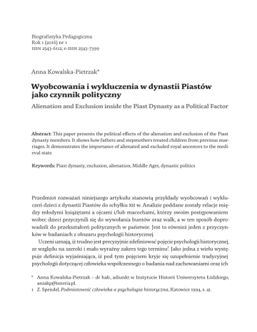 Biografistyka Pedagogiczna Rok 1 (2016) nr 1 issn 2543-6112; e-issn 2543-7399 Anna Kowalska-Pietrzak* Wyobcowania i wykluczenia w dynastii Piastów jako czynnik polityczny Alienation and Exclusion inside the Piast Dynasty as a Political Factor Abstract: This paper presents the political effects of the alienation and exclusion of the Piast dynasty members. It shows how fathers and stepmothers treated children from previous marriages. It demonstrates the importance of alienated and excluded royal ancestors to the medieval state. Keywords: Piast dynasty, exclusion, alienation, Middle Ages, dynastic politics Przedmiot rozważań niniejszego artykułu stanowią przykłady wyobcowań i wykluczeń dzieci z dynastii Piastów do schyłku xii w. Analizie poddane zostały relacje między młodymi książętami a ojcami i/lub macochami, którzy swoim postępowaniem wobec dzieci przyczynili się do wywołania buntów oraz walk, a w ten sposób doprowadzili do przekształceń politycznych w państwie. Jest to również jeden z przyczynków w badaniach z obszaru psychologii historycznej. Uczeni uznają, iż trudno jest precyzyjnie zdefiniować pojęcie psychologii historycznej, ze względu na szeroki i mało wyraźny zakres tego terminu1. Jako jedna z wielu występuje definicja wyjaśniająca, iż pod tym pojęciem kryje się uzupełnienie tradycyjnej psychologii dotyczącej człowieka współczesnego o badania nad zachowaniami oraz ich * Anna Kowalska-Pietrzak – dr hab., adiunkt w Instytucie Historii Uniwersytetu Łódzkiego, [email protected]. 1 Z. Spendel, Podmiotowość człowieka a psychologia historyczna, Katowice 1994, s. 41. 164 Anna Kowalska-Pietrzak źródłami u człowieka w przeszłości2. Psychohistoria jest też definiowana: „Jako nauka o motywacji w historii, psychohistoria może koncentrować się na tych samych wydarzeniach dziejowych, którymi zajmuje się historia, ale jej celem nie będzie przedstawienie tego, co zdarzyło się dzień po dniu”, a jako przedmiot badań uwzględnia również takie elementy jak choćby historię dzieciństwa3. Jest też „nie tyle odkrywaniem, ile odkrywaniem ponownym – to proces stwierdzania, co faktycznie już wiemy”4. Definiując w ten sposób przedmiot badań psychohistorii, stwierdzić można, iż już na początku dziejów pierwszej polskiej dynastii rysuje się wizerunek macochy, która chce zapewnić swoim synom, przychodzącym na świat w latach ok. 979–9865, panowanie po śmierci ich ojca, zabezpieczając swoich potomków przed przyrodnim bratem. W rodzinie książęcej można byłoby w ten sposób dostrzec podziały na „starą” i „nową” rodzinę księcia Mieszka i, który darząc ciepłymi uczuciami swoich młodszych potomków, zrodzonych z drugiej żony Ody, mógłby posunąć się do wydzielenia im, jako przyszłego władztwa, terenów tzw. civitas Schinesghe. Jego syn Bolesław urodzony z pierwszego małżeństwa z czeską Dobrawą, pominięty w dokumencie Dagome iudex, panowałby wówczas w Krakowie. Historycy, interpretując pominięcie Chrobrego w Dagome iudex jako jego wydziedziczenie, dopatrywali się często wpływów Ody na zapewne już pragnącego spokoju i podstarzałego męża. Czy jednak taka interpretacja nie wymagałaby spojrzenia na Mieszka jako władcę, który zmęczony panowaniem, stracił ostrość umysłu i przewidywania, iż taka sytuacja może mieć zdecydowanie negatywny wpływ na przyszłość jego państwa?6 Czy faktycznie książę nie przewidział, podobnie jak żyjący 150 lat później Bolesław Krzywousty, że jego potom- 2 Tamże, s. 44 i nast. O zagadnieniach związanych z psychohistorią, dyskusją wokół jej definiowania i przedmiocie badań zob. również: Z. Barbu, Problems of Historical Psychology, London 1960; M. Dymkowski, Między psychologią a historią. O roli złudzeń w dziejach, Warszawa 2000; tenże, Wprowadzenie do psychologii historycznej, Gdańsk 2003; T. Pawelec, Wprowadzenie: psychohistoria w poszukiwaniu tożsamości, w: Psyche i Klio. Historia w oczach psychohistoryków, wybór, przekład i wstęp T. Pawelec, Lublin 2002, s. 11–31; B. Mazlish, Podejście psychohistoryczne, w: Psyche i Klio, s. 35–50; Th. A. Kohut, Psychohistoria jako historia, w: Psyche i Klio, s. 73–94; P.C. Hoffer, Czy psychohistoria jest naprawdę historią?, w: Psyche i Klio, s. 95–110. 3 L. de Mause, Niezależność psychohistorii, w: Psyche i Klio, s. 52. 4 Tamże, s. 72. 5 K. Jasiński, Rodowód pierwszych Piastów, Poznań 2004, s. 100, 101, 104. 6 J. Strzelczyk, Mieszko Pierwszy, Poznań 1999, s. 181–182. Przypuszczenia o roli Ody jako doradczyni męża w ostatnich latach jego panowania wysuwał m.in. S. Zakrzewski, Mieszko i jako budowniczy państwa polskiego, Kraków 2006, s. 117. Wyobcowania i wykluczenia w dynastii Piastów jako czynnik polityczny kowie nie poprzestaną na przydzielonych sobie władztwach? Patrząc z perspektywy czasu, Mieszko mógł mieć do tego większe prawo niż jego prapraprawnuk Bolesław, który znał dzieje dynastii i sam brał udział w rywalizacjach politycznych i militarnych w ramach sporów dynastycznych. Nie można też wykluczyć, że Bolesław Chrobry, który miał mniej niż 15 lat, gdy został pasierbem i przyrodnim bratem, wewnętrznie przygotowywał się do mającej nastąpić w przyszłości rozgrywki. Czy zachowanie jego ojca mogło wskazywać na okazywanie większego zainteresowania młodszym synom niż jemu – pierworodnemu, który widział się w roli dziedzica? Czy Bolesław po powtórnym ożenku księcia czuł się odsunięty, czy też jego relacje z ojcem nie uległy zmianie? Tego ze źródeł nie wiemy. Wiemy natomiast, że po śmierci ojca i wypędzeniu macochy objął panowanie na terenach całego państwa. Swemu pierworodnemu synowi Bolesław zgotował trudny los, jeśli pozostaniemy przy tradycyjnej interpretacji dziejów Bezpryma. Frapująca jest bowiem historia życia najstarszego syna Chrobrego, który przez kolejne stulec