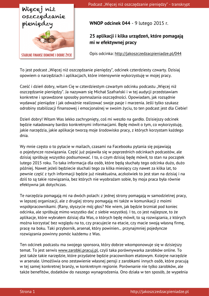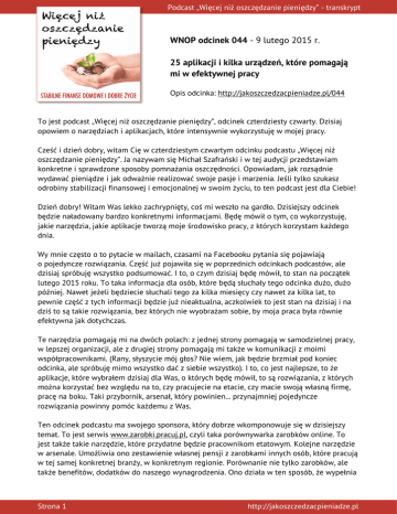 Podcast „Więcej niż oszczędzanie pieniędzy” - transkrypt ae WNOP odcinek 044 - 9 lutego 2015 r. 25 aplikacji i kilka urządzeń, które pomagają mi w efektywnej pracy Opis odcinka: http://jakoszczedzacpieniadze.pl/044 To jest podcast „Więcej niż oszczędzanie pieniędzy”, odcinek czterdziesty czwarty. Dzisiaj opowiem o narzędziach i aplikacjach, które intensywnie wykorzystuję w mojej pracy. Cześć i dzień dobry, witam Cię w czterdziestym czwartym odcinku podcastu „Więcej niż oszczędzanie pieniędzy”. Ja nazywam się Michał Szafrański i w tej audycji przedstawiam konkretne i sprawdzone sposoby pomnażania oszczędności. Opowiadam, jak rozsądnie wydawać pieniądze i jak odważnie realizować swoje pasje i marzenia. Jeśli tylko szukasz odrobiny stabilizacji finansowej i emocjonalnej w swoim życiu, to ten podcast jest dla Ciebie! Dzień dobry! Witam Was lekko zachrypnięty, coś mi weszło na gardło. Dzisiejszy odcinek będzie naładowany bardzo konkretnymi informacjami. Będę mówił o tym, co wykorzystuję, jakie narzędzia, jakie aplikacje tworzą moje środowisko pracy, z których korzystam każdego dnia. Wy mnie często o to pytacie w mailach, czasami na Facebooku pytania się pojawiają o pojedyncze rozwiązania. Część już pojawiła się w poprzednich odcinkach podcastów, ale dzisiaj spróbuję wszystko podsumować. I to, o czym dzisiaj będę mówił, to stan na początek lutego 2015 roku. To taka informacja dla osób, które będą słuchały tego odcinka dużo, dużo później. Nawet jeżeli będziecie słuchali tego za kilka miesięcy czy nawet za kilka lat, to pewnie część z tych informacji będzie już nieaktualna, aczkolwiek to jest stan na dzisiaj i na dziś to są takie rozwiązania, bez których nie wyobrażam sobie, by moja praca była równie efektywna jak dotychczas. Te narzędzia pomagają mi na dwóch polach: z jednej strony pomagają w samodzielnej pracy, w lepszej organizacji, ale z drugiej strony pomagają mi także w komunikacji z moimi współpracownikami. (Rany, słyszycie mój głos? Nie wiem, jak będzie brzmiał pod koniec odcinka, ale spróbuję mimo wszystko dać z siebie wszystko). I to, co jest najlepsze, to że aplikacje, które wybrałem dzisiaj dla Was, o których będę mówił, to są rozwiązania, z których można korzystać bez względu na to, czy pracujecie na etacie, czy macie swoją własną firmę, pracę na boku. Taki przybornik, arsenał, który powinien... przynajmniej pojedyncze rozwiązania powinny pomóc każdemu z Was. Ten odcinek podcastu ma swojego sponsora, który dobrze wkomponowuje się w dzisiejszy temat. To jest serwis www.zarobki.pracuj.pl, czyli taka porównywarka zarobków online. To jest także takie narzędzie, które przydatne będzie pracownikom etatowym. Kolejne narzędzie w arsenale. Umożliwia ono zestawienie własnej pensji z zarobkami innych osób, które pracują w tej samej konkretnej branży, w konkretnym regionie. Porównanie nie tylko zarobków, ale także benefitów, dodatków do naszego wynagrodzenia. Ono działa w ten sposób, że wypełnia Strona 1 http://jakoszczedzacpieniadze.pl Podcast „Więcej niż oszczędzanie pieniędzy” - transkrypt się na stronie www.zarobki.pracuj.pl prosty formularz, dzięki temu możemy się dosyć łatwo i szybko przekonać, czy zarabiamy dużo czy mało w porównaniu do innych osób pracujących na podobnych stanowiskach. Atutem tego serwisu jest to, że pozwala rzetelnie przygotować się do negocjacji wysokości pensji. Korzystanie z samego serwisu jest bezpłatne, a przygotowywany tam dla Was indywidualny raport zarobków powstaje w oparciu o dane pochodzące od ponad 900 000 Polaków, którzy już z tego serwisu skorzystali. Te dane są zweryfikowane, wiarygodne. Tak że warto na pewno zajrzeć i sprawdzić, ile naprawdę jesteście warci na rynku pracy. Ja mam jeszcze jedno zastrzeżenie dotyczące tego odcinka podcastu, nie chciałem go przeładowywać informacjami, więc będę mówić tylko o tych narzędziach, które mogą się przydać każdemu z Was. W ogóle nie będę dotykał narzędzi dotyczących blogowania i mojej aktywności blogowej. Drugie zastrzeżenie: to nie jest tak, że ja mam dobre patenty na wszystko. Jest na pewno kilka takich obszarów, w których dobrych narzędzi jeszcze nie znalazłem, nie dopracowałem się ich. Ja cały czas eksperymentuję, poszukuję takiego optymalnego zestawu. Tak że miejcie to również na uwadze, pod koniec odcinka powiem, w których obszarach czuję się bardzo niepewnie i gdzie jeszcze nie znalazłem satysfakcjonujących mnie rozwiązań. Całą treść tego odcinka podzieliłem na kilka obszarów tematycznych. Najpierw Wam powiem o sprzęcie, później Wam trochę powiem o miejscach, w których wykonuję moją pracę, a dopiero później przejdę do aplikacji i sposobu organizacji współpracy ze współpracownikami. Zacznę od sprzętu. Sprzęt, z którego dzisiaj korzystam, to nie jest sprzęt najtańszy, wręcz można powiedzieć, że jest drogi. Ale z drugiej strony zdążył ten sprzęt udowodnić, że jego cena jest ceną uzasadniającą jej poniesienie. I teraz tak: mój podstawowy komputer do pracy to jest MacBook Pro. Trzynastocalowy ekran Retina, czyli wersja o wysokiej rozdzielczości, która powoduje, że to, co jest wyświetlane na ekranie, jest pozbawione jakichkolwiek pikseli. Bardzo przyjemnie mi się na nim pracuje z tekstem, z tabelami. Można by się zastanawiać, czemu ten ekran nie jest większy, piętnastocalowy. Ja nie potrzebuję większego ekranu. Za chwilę powiemy, dlaczego nie potrzebuję. Przede wszystkim dla mnie istotne było to, żeby urządzenie było małe. Poręczne, przenośne, bo zdarza mi się pracować również na nim poza domem. A jeżeli chodzi o duży ekran, to mam do niego zewnętrzny monitor. Monitor Apple Thunderbolt Display, dwudziestosiedmiocalowy. Olbrzym w porównaniu z monitorami, które dotychczas wykorzystywałem, pracuj