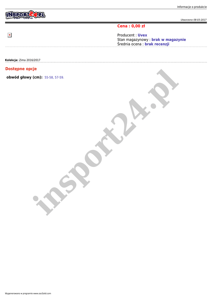 Informacje o produkcie Utworzono 08-03-2017 Cena : 0,00 zł Producent : Uvex Stan magazynowy : brak w magazynie Średnia ocena : brak recenzji Kolekcja: Zima 2016/2017 Dostępne opcje in sp or t2 4. p l obwód głowy (cm): 55-58, 57-59. Wygenerowano w programie www.oscGold.com