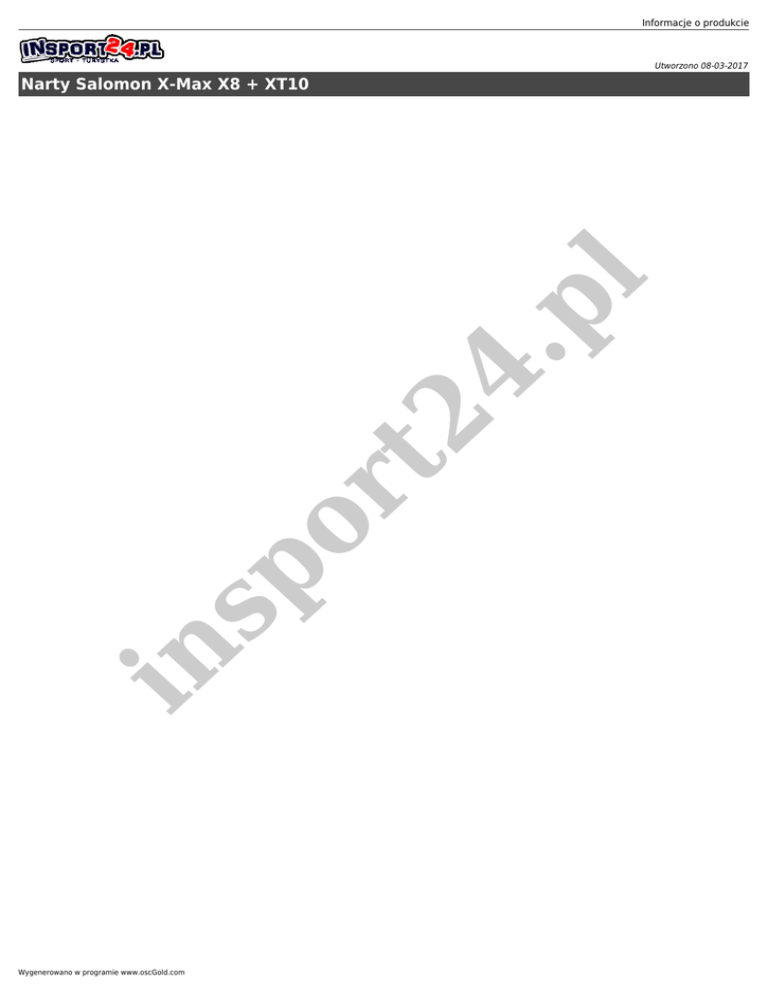 Informacje o produkcie Utworzono 08-03-2017 in sp or t2 4. p l Narty Salomon X-Max X8 + XT10 Wygenerowano w programie www.oscGold.com l 4. p sp or t2 Cena : 1.999,00 zł Cena promocyjna : 1.399,00 zł in Nr katalogowy : 391547 Producent : Salomon Dostępność : Dostępny Stan magazynowy : poniżej średniego Średnia ocena : brak recenzji Informacje o produkcie Narty firmy Salomon model X8 + XT10 . Odkryj własne możliwości na stoku dzięki stabilności i kontroli . Kontrukcja Powerframe z warstwami bazaltowymi o zoptymalizowanym kształcie zapewnia nadzwyczajną moc w dowolnej chwili podczas jazdy po przygotowanych trasach . Zastosowanie w nartax X-Max X8 rdzenia drewnianego zapewnia optymalną stabilność i dużą sprężystość przy maksymalnym kontakcie narty ze śniegiem oraz zwiększonej amortyzacji . Ścianki boczne z tworzywa ABS wspomagają przystosowanie do warunków terenowych , poprawiając kontakt narty ze śniegiem . Profil Carve Rocker zapewnia szybkie i precyzyjne pokonywanie zakrętów z mniejszym wysiłkiem , a także podnosi szybkość przechodzenia z krawędzi na krawędź . ● ● ● ● ● ● ● ● ● ● WOODCORE TIP PROTECTOR PULSE PAD SEMI TWIN TAIL CARVE ROCKER TAIL PROTECTOR X-TRACK GLOSSY Wiązania XT 10 OVERSIZE ACTIVE CONTACT SIDEWALLS PROGRESSIVE RADIUS SIZING POWERFRAME BASALT Kolekcja: Zima 2016/2017 in długość: 162, 169. sp or t2 Dostępne opcje Narty Salomon X-Max X8 + XT10 4. p ● l Technologie : Wygenerowano w programie www.oscGold.com