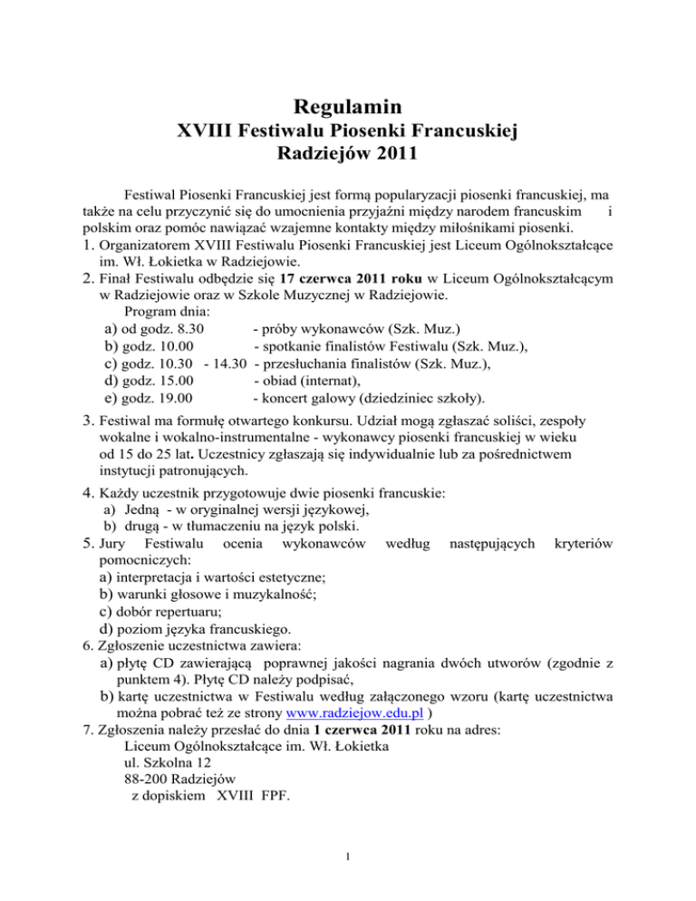 Regulamin XVIII Festiwalu Piosenki Francuskiej Radziejów 2011 Festiwal Piosenki Francuskiej jest formą popularyzacji piosenki francuskiej, ma także na celu przyczynić się do umocnienia przyjaźni między narodem francuskim i polskim oraz pomóc nawiązać wzajemne kontakty między miłośnikami piosenki. 1. Organizatorem XVIII Festiwalu Piosenki Francuskiej jest Liceum Ogólnokształcące im. Wł. Łokietka w Radziejowie. 2. Finał Festiwalu odbędzie się 17 czerwca 2011 roku w Liceum Ogólnokształcącym w Radziejowie oraz w Szkole Muzycznej w Radziejowie. Program dnia: a) od godz. 8.30 - próby wykonawców (Szk. Muz.) b) godz. 10.00 - spotkanie finalistów Festiwalu (Szk. Muz.), c) godz. 10.30 - 14.30 - przesłuchania finalistów (Szk. Muz.), d) godz. 15.00 - obiad (internat), e) godz. 19.00 - koncert galowy (dziedziniec szkoły). 3. Festiwal ma formułę otwartego konkursu. Udział mogą zgłaszać soliści, zespoły wokalne i wokalno-instrumentalne - wykonawcy piosenki francuskiej w wieku od 15 do 25 lat. Uczestnicy zgłaszają się indywidualnie lub za pośrednictwem instytucji patronujących. 4. Każdy uczestnik przygotowuje dwie piosenki francuskie: a) Jedną - w oryginalnej wersji językowej, b) drugą - w tłumaczeniu na język polski. 5. Jury Festiwalu ocenia wykonawców według następujących kryteriów pomocniczych: a) interpretacja i wartości estetyczne; b) warunki głosowe i muzykalność; c) dobór repertuaru; d) poziom języka francuskiego. 6. Zgłoszenie uczestnictwa zawiera: a) płytę CD zawierającą poprawnej jakości nagrania dwóch utworów (zgodnie z punktem 4). Płytę CD należy podpisać, b) kartę uczestnictwa w Festiwalu według załączonego wzoru (kartę uczestnictwa można pobrać też ze strony www.radziejow.edu.pl ) 7. Zgłoszenia należy przesłać do dnia 1 czerwca 2011 roku na adres: Liceum Ogólnokształcące im. Wł. Łokietka ul. Szkolna 12 88-200 Radziejów z dopiskiem XVIII FPF. 1 8. Organizatorzy powołują Radę Artystyczną Festiwalu, która dokona weryfikacji nadesłanych materiałów, kwalifikując wykonawców do przesłuchań finałowych, które odbędą się dnia 17 czerwca 2011 roku. 9. W terminie do 6 czerwca 2011 roku każdy uczestnik otrzyma informację dotyczącą zakwalifikowania się do finału Festiwalu. Lista finalistów zamieszczona też będzie na stronie internetowej szkoły. 10.Organizatorzy przewidują następujące nagrody: -) I miejsce - wycieczka do Francji dla jednej osoby (wartość ok. 1500 zł), -) II, III miejsce - nagrody rzeczowe, -) wyróżnienia i nagrody specjalne, które organizatorzy przekażą do dyspozycji jury. Postanowienia końcowe 1. Decyzje Rady Artystycznej oraz Jury Festiwalu są ostateczne. 2. Jury Festiwalu zastrzega sobie prawo odstąpienia od przyznawania nagród zgodnie z punktem 10 regulaminu. 3. Organizatorzy zobowiązują wszystkich finalistów do uczestnictwa w koncercie galowym a laureatów do wykonania w czasie tego koncertu utworów wskazanych przez przewodniczącego jury. 4. Organizatorzy zapewniają sprzęt nagłaśniający i odtwarzający. 5. Uczestnicy korzystający z podkładów muzycznych zobowiązani są przygotować jedną płytę CD, na której nagrane są wyłącznie dwa podkłady w kolejności takiej, w jakiej wykonywane będą w czasie przesłuchań konkursowych. Płytę należy podpisać. 6. Organizatorzy nie zwracają płyt CD nadesłanych przez wykonawców. 7. Uczestnicy i ich opiekunowie mają możliwość zakwaterowania i wyżywienia w internacie Liceum Ogólnokształcącego (po zadeklarowaniu w karcie zgłoszenia). Koszty z tym związane pokrywają uczestnicy. 8. Organizatorzy nie zwracają kosztów przejazdu. Pytania i korespondencje kierować na adres: Liceum Ogólnokształcące im. Wł. Łokietka ul. Szkolna 12 88-200 Radziejów tel./fax. 54 285 3228 [email protected], www.radziejow.edu.pl Zapraszamy Organizatorzy 2