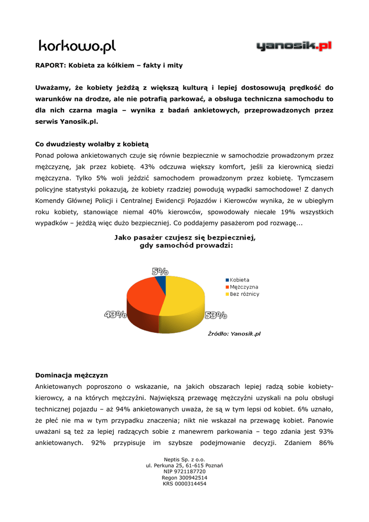 RAPORT: Kobieta za kółkiem – fakty i mity Uważamy, że kobiety jeżdżą z większą kulturą i lepiej dostosowują prędkość do warunków na drodze, ale nie potrafią parkować, a obsługa techniczna samochodu to dla nich czarna magia – wynika z badań ankietowych, przeprowadzonych przez serwis Yanosik.pl. Co dwudziesty wolałby z kobietą Ponad połowa ankietowanych czuje się równie bezpiecznie w samochodzie prowadzonym przez mężczyznę, jak przez kobietę. 43% odczuwa większy komfort, jeśli za kierownicą siedzi mężczyzna. Tylko 5% woli jeździć samochodem prowadzonym przez kobietę. Tymczasem policyjne statystyki pokazują, że kobiety rzadziej powodują wypadki samochodowe! Z danych Komendy Głównej Policji i Centralnej Ewidencji Pojazdów i Kierowców wynika, że w ubiegłym roku kobiety, stanowiące niemal 40% kierowców, spowodowały niecałe 19% wszystkich wypadków – jeżdżą więc dużo bezpieczniej. Co poddajemy pasażerom pod rozwagę... Dominacja mężczyzn Ankietowanych poproszono o wskazanie, na jakich obszarach lepiej radzą sobie kobietykierowcy, a na których mężczyźni. Największą przewagę mężczyźni uzyskali na polu obsługi technicznej pojazdu – aż 94% ankietowanych uważa, że są w tym lepsi od kobiet. 6% uznało, że płeć nie ma w tym przypadku znaczenia; nikt nie wskazał na przewagę kobiet. Panowie uważani są też za lepiej radzących sobie z manewrem parkowania – tego zdania jest 93% ankietowanych. 92% przypisuje im szybsze podejmowanie Neptis Sp. z o.o. ul. Perkuna 25, 61-615 Poznań NIP 9721187720 Regon 300942514 KRS 0000314454 decyzji. Zdaniem 86% respondentów również dobra orientacja w terenie jest domeną mężczyzn – tylko 5% przyznaje tu wyższość pań. Silne strony kobiet-kierowców Płeć nie ma większego znaczenia, jeśli chodzi o znajomość przepisów ruchu drogowego – uważa ponad połowa ankietowanych. W czym zaś lepsze są kobiety? Zdaniem respondentów, panie lepiej dostosowują prędkość do warunków panujących na drodze – wynika z 41% odpowiedzi. 56% respondentów przypisuje kobietom wyższą kulturę jazdy (31% nie wyróżnia pod tym względem żadnej z płci; tylko 13% sądzi, że wysoka kultura jazdy cechuje raczej panów). Męskim okiem Zdecydowaną większość, bo aż 93% ankietowanych stanowili mężczyźni. Śmiało można więc przyjąć, że wyniki badania oddają raczej męski punkt widzenia. Ogromna większość osób udzielających odpowiedzi to czynni kierowcy, przy czym 69% posiada prawo jazdy dłużej niż 5 lat, 25% od 1 roku do 5 lat, a 5% krócej niż rok. Neptis Sp. z o.o. ul. Perkuna 25, 61-615 Poznań NIP 9721187720 Regon 300942514 KRS 0000314454 Badanie ankietowe przeprowadzono w Internecie w dniach 1-15 sierpnia 2011r. Wzięło w nim udział 426 osób. Źródło: Yanosik.pl ------------------------------Dystrybucja materiałów: Piotr Rubaj [email protected] kom./+48/ 519-181-900 Neptis Sp. z o.o. ul. Perkuna 25, 61-615 Poznań NIP 9721187720 Regon 300942514 KRS 0000314454