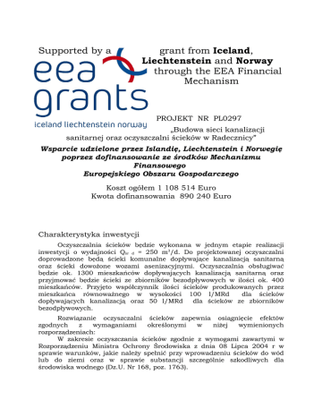 Supported by a grant from Iceland, Liechtenstein and Norway through the EEA Financial Mechanism PROJEKT NR PL0297 „Budowa sieci kanalizacji sanitarnej oraz oczyszczalni ścieków w Radecznicy” Wsparcie udzielone przez Islandię, Liechtenstein i Norwegię poprzez dofinansowanie ze środków Mechanizmu Finansowego Europejskiego Obszaru Gospodarczego Koszt ogółem 1 108 514 Euro Kwota dofinansowania 890 240 Euro Charakterystyka inwestycji Oczyszczalnia ścieków będzie wykonana w jednym etapie realizacji inwestycji o wydajności Qśr d = 250 m3/d. Do projektowanej oczyszczalni doprowadzone będą ścieki komunalne dopływające kanalizacją sanitarną oraz ścieki dowożone wozami asenizacyjnymi. Oczyszczalnia obsługiwać będzie ok. 1300 mieszkańców dopływających kanalizacją sanitarną oraz przyjmować będzie ścieki ze zbiorników bezodpływowych w ilości ok. 400 mieszkańców. Przyjęto współczynnik ilości ścieków produkowanych przez mieszkańca równoważnego w wysokości 100 l/MRd dla ścieków dopływających kanalizacją oraz 50 l/MRd dla ścieków ze zbiorników bezodpływowych. Rozwiązanie oczyszczalni ścieków zapewnia osiągnięcie efektów zgodnych z wymaganiami określonymi w niżej wymienionych rozporządzeniach: W zakresie oczyszczania ścieków zgodnie z wymogami zawartymi w Rozporządzeniu Ministra Ochrony Środowiska z dnia 08 Lipca 2004 r w sprawie warunków, jakie należy spełnić przy wprowadzeniu ścieków do wód lub do ziemi oraz w sprawie substancji szczególnie szkodliwych dla środowiska wodnego (Dz.U. Nr 168, poz. 1763). W zakresie przeróbki osadów zgodnie z wymaganiami zawartymi w Ustawie o odpadach z dnia 27 Kwietnia 2001 r. Dz. U. Nr 62, poz. 628 w sprawie warunków, jakie muszą być spełnione przy wykorzystaniu osadów na cele nieprzemysłowe. Ilość mieszkańców równoważnych, które obsługiwać będzie oczyszczalnia wynosi: RLM = 100 kgBZT5/d : 0,06 kg/MRd = ok. 1700 MR, Q d = 250 m3/d Jakość ścieków oczyszczonych: Odczyn CHZT BZT5 Zawiesina ogólna 6,5 – 9,0 pH < 150 mgO2/dm3 < 40 mgO2/dm3 < 50 mg/dm3 5. Opis technologiczny oczyszczania ścieków Podstawowe elementy oczyszczalni: 1. Punkt zlewny ścieków dowożonych · Szybkozłącze do odbioru ścieków · Wstępne mechaniczne podczyszczenie ścieków · Pomiar przepływu ścieków · Zbiornik rozprężny ścieków dowożonych · Dozowanie ścieków 2. Oczyszczanie mechaniczne ścieków połączonych: · Automatyczne sito skratkowe · Piaskownik pionowy 3. Oczyszczanie biologiczne ścieków połączonych: · Dwukomorowy selektor – warunki beztlenowe stosowane dla procesu. Dzięki temu osad odwodniony posiada znacznie lepsze parametry dla celów rolniczego wykorzystania · Komora denitryfikacji/nitryfikacji · Osadnik wtórny pionowy – separacja osadu od ścieków 4. Mechaniczne odwadnianie osadów nadmiernych w budynku technicznym oczyszczalni 5. Działanie oczyszczalni będzie całkowicie zautomatyzowane poprzez zastosowanie sterowania z możliwością zdalnej kontroli pracy poprzez złącze telefoniczne (GSM lub TP S.A. – opcja) np. sterownie BT-autoeco lub równoważne. 5.1. PUNKT ZLEWNY ŚCIEKÓW DOWOŻONYCH Punkt zlewny służy do odbioru ścieków dowożonych ze zbiorników bezodpływowych gospodarstw domowych. Służy również do wstępnego oddzielenia skratek od ścieków. Ścieki odprowadzone będą grawitacyjnie do pompowni ścieków. W skład punktu zlewnego wchodzi: · Taca najazdowa z szybkozłączem do podłączenia wozu asenizacyjnego · Krata ręczna 5.2. POMIAR PRZEPŁYWU ŚCIEKÓW DOWOŻONYCH Ścieki dowożone mechanicznie podczyszczone na kracie ręcznej grawitacyjnie dopływają do studzienki uśredniającej, w której zainstalowane będzie urządzenie pomiarowe ilości ścieków dowożonych. 5.3. ZBIORNIK UŚREDNIAJĄCY ŚCIEKÓW DOWOŻONYCH Ścieki ze stacji odbioru ścieków dowożonych dopływają grawitacyjnie do zbiornika uśredniającego ścieków. W celu mieszania zawartości zbiornika, zbiornik wyposażony w system napowietrzania (eliminacja ew. zapachów). Ścieki uśrednione podawane będą równomiernie do pompowni głównej ścieków surowych a następnie do reaktora osadu czynnego. W tym celu zbiornik wyposażony będzie w pompę zatapialną. Cykl pracy pompy ustalony będzie w trakcie rozruchu technologicznego uzależniony będzie od aktualnej ilości ścieków komunalnych. 5.4. POMPOWNIA ŚCIEKÓW SUROWYCH Zadaniem pompowni będzie podawanie ścieków surowych (sanitarne + dowożone) do węzła oczyszczania mechanicznego a następnie do reaktora osadu czynnego. W pompowni na dopływie ścieków sanitarnych zainstalowana będzie rzadka ręczna krata koszowa, której zadaniem jest zatrzymanie większych zanieczyszczeń i ochrona wirników pomp. Skratki będą magazynowane w pojemniku i wywożone na składowisko odpadów. 5.5. MECHANICZNE PODCZYSZCZANIE ŚCIEKÓW SUROWYCH 5.5.1. Sito skratkowe Wstępne oczyszczanie ścieków połączonych odbywa się w stacji mechanicznego podczyszczania ścieków, poprzez zastosowanie zestawu sita skratkowego zainstalowanego w budynku technicznym. Skratki zatrzymane na sicie są workowane i magazynowane w pojemniku, i wywożone na wysypisko odpadów. Projektowana stacja mechanicznego podczyszczania ścieków dzięki hermetyzacji oraz swoim cechom użytkowym nie stwarza uciążliwości eksploatacyjnych. 5.5.2. Piaskownik pionowy W zbiorniku reaktora wydzielony został piaskownik pionowy, którego zadaniem jest usunięcie piasku ze ścieków surowych. Piasek wybierany będzie pompą mamut, magazynowany w zbiorniku osadu nadmiernego i razem z osadem odwodnionym wywożony będzie do zagospodarowania. 5.6. OCZYSZCZANIE BIOLOGICZNE W REAKTORZE Ścieki mechanicznie podczyszczone odpływają do stopnia biologicznego oczyszczania, które odbywa się w reaktorze osadu czynnego. Nominalna przepustowość reaktora wynosi 250 m3/dobę. Reaktor zapewnia prawidłową pracę w granicach 100 – 330 m3/dobę. Re