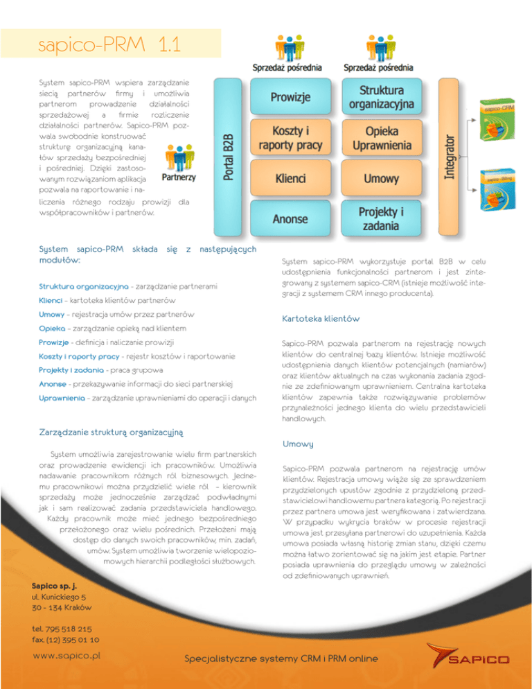 sapico-PRM 1.1 System sapico-PRM wspiera zarządzanie siecią partnerów firmy i umożliwia partnerom prowadzenie działalności sprzedażowej a firmie rozliczenie działalności partnerów. Sapico-PRM pozwala swobodnie konstruować strukturę organizacyjną kanałów sprzedaży bezpośredniej i pośredniej. Dzięki zastosowanym rozwiązaniom aplikacja pozwala na raportowanie i naliczenia różnego rodzaju prowizji dla współpracowników i partnerów. System sapico-PRM składa się z następujących modułów: Struktura organizacyjna - zarządzanie partnerami Klienci – kartoteka klientów partnerów Umowy – rejestracja umów przez partnerów System sapico-PRM wykorzystuje portal B2B w celu udostępnienia funkcjonalności partnerom i jest zintegrowany z systemem sapico-CRM (istnieje możliwość integracji z systemem CRM innego producenta). Kartoteka klientów Opieka – zarządzanie opieką nad klientem Prowizje - definicja i naliczanie prowizji Koszty i raporty pracy - rejestr kosztów i raportowanie Projekty i zadania - praca grupowa Anonse - przekazywanie informacji do sieci partnerskiej Uprawnienia – zarządzanie uprawnieniami do operacji i danych Sapico-PRM pozwala partnerom na rejestrację nowych klientów do centralnej bazy klientów. Istnieje możliwość udostępnienia danych klientów potencjalnych (namiarów) oraz klientów aktualnych na czas wykonania zadania zgodnie ze zdefiniowanym uprawnieniem. Centralna kartoteka klientów zapewnia także rozwiązywanie problemów przynależności jednego klienta do wielu przedstawicieli handlowych. Zarządzanie strukturą organizacyjną Umowy System umożliwia zarejestrowanie wielu firm partnerskich oraz prowadzenie ewidencji ich pracowników. Umożliwia nadawanie pracownikom różnych ról biznesowych. Jednemu pracownikowi można przydzielić wiele ról – kierownik sprzedaży może jednocześnie zarządzać podwładnymi jak i sam realizować zadania przedstawiciela handlowego. Każdy pracownik może mieć jednego bezpośredniego przełożonego oraz wielu pośrednich. Przełożeni mają dostęp do danych swoich pracowników, min. zadań, umów. System umożliwia tworzenie wielopoziomowych hierarchii podległości służbowych. Sapico-PRM pozwala partnerom na rejestrację umów klientów. Rejestracja umowy wiąże się ze sprawdzeniem przydzielonych upustów zgodnie z przydzieloną przedstawicielowi handlowemu partnera kategorią. Po rejestracji przez partnera umowa jest weryfikowana i zatwierdzana. W przypadku wykrycia braków w procesie rejestracji umowa jest przesyłana partnerowi do uzupełnienia. Każda umowa posiada własną historię zmian stanu, dzięki czemu można łatwo zorientować się na jakim jest etapie. Partner posiada uprawnienia do przeglądu umowy w zależności od zdefiniowanych uprawnień. Sapico sp. j. ul. Kunickiego 5 30 - 134 Kraków tel. 795 518 215 fax. (12) 395 01 10 www.sapico.pl Specjalistyczne systemy CRM i PRM online Prowizje i zdarzenia prowizyjne Aplikacja zawiera zestaw raportów do analizy sprzedaży przez partnerów i wykorzystuje autorski mechanizm do naliczeń prowizji. Naliczenia mogą uwzględniać różnorodne zdarzenia prowizyjne – począwszy od aktywacji usług, poprzez zapłacone faktury klienta skończywszy na różnorodnych parametrach z raportów pracy. System udostępnia możliwość definiowania kalkulacji prowizji, z wykorzystaniem przygotowanych danych źródłowych. Dla każdego pracownika w strukturze organizacyjnej własnej lub partnera można zdefiniować jakie prowizje go dotyczą i jakie posiada stawki dla każdej z prowizji. Rejestr kosztów i raportowanie pracy System umożliwia także rejestrowanie kosztów związanych z realizacją zadań przez pracowników lub partnerów, dotyczących np. paliwa, ubezpieczenia samochodu itp. Koszty powiązane są z rejestrem wyposażenia przekazywanego do użytkowania pracownikom i partnerom. Raportowanie pracy umożliwia szybką rejestrację parametrów dotyczących dziennej aktywności przedstawicieli handlowych i ich prezentację w postaci raportów i analiz. Projekty i zadania Sapico-PRM udostępnia Partnerom Klienta mechanizmy pracy grupowej, w skład których wchodzi możliwość realizacji wspólnych projektów i zadań. Zadania mogą dotyczyć różnych aspektów wspólnej działalności (np. przeciwdziałanie rezygnacji, propozycja przy kontynuacji umowy przez klienta) i wiązać się z ewidencjonowaniem określonych rezultatów (np. umów), czy planowaniem kolejnych zadań. Zarządzający sprzedażą pośrednią mogą analizować realizację zadań przez Partnerów. Anonse i ogłoszenia Dzięki mechanizmowi anonsów możliwe jest przekazanie informacji poprzez portal B2B lub maila do określonych firm partnerskich lub pracowników pełniących określone role w systemie. Możliwe jest np. adresowanie informacji do przedstawicieli handlowych w kanale sprzedaży pośredniej z kilku wybranych firm. Ogłoszenia są prezentowane do określonego w ogłoszeniu dnia i godziny zakończenia publikacji. Istnieje możliwość dołączenia do ogłoszenia plików – np. z informacjami o promocji czy sprzedawanym produkcie. Uprawnienia System odznacza się elastyczną organizacją uprawnień zarówno do wykonywania operacji jak i do danych. Przydzielenie użytkownikowi określonej roli udostępnia mu zestaw operacji, zaś dane które widzi zależą od źródła ich pochodzenia. System można skonfigurować tak, aby pracownik partnera dysponował minimalnymi uprawnieniami umożliwiającymi skuteczną pracę bez udostępniania wrażliwych informacji.