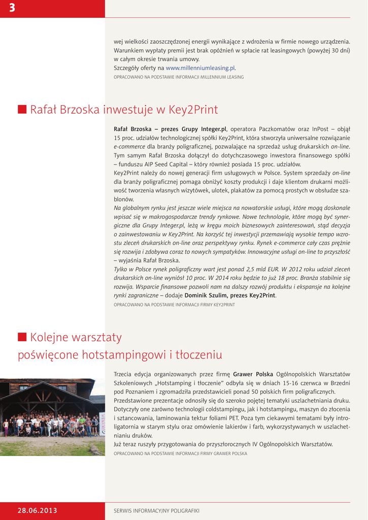 3 wej wielkości zaoszczędzonej energii wynikające z wdrożenia w firmie nowego urządzenia. Warunkiem wypłaty premii jest brak opóźnień w spłacie rat leasingowych (powyżej 30 dni) w całym okresie trwania umowy. Szczegóły oferty na www.millenniumleasing.pl. OPRACOWANO NA POdStAWIE INFORMACJI MILLENNIuM LEASING I Rafał Brzoska inwestuje w Key2Print Rafał Brzoska – prezes Grupy Integer.pl, operatora Paczkomatów oraz InPost – objął 15 proc. udziałów technologicznej spółki Key2Print, która stworzyła uniwersalne rozwiązanie e-commerce dla branży poligraficznej, pozwalające na sprzedaż usług drukarskich on-line. Tym samym Rafał Brzoska dołączył do dotychczasowego inwestora finansowego spółki – funduszu AIP Seed Capital – który również posiada 15 proc. udziałów. Key2Print należy do nowej generacji firm usługowych w Polsce. System sprzedaży on-line dla branży poligraficznej pomaga obniżyć koszty produkcji i daje klientom drukarni możliwość tworzenia własnych wizytówek, ulotek, plakatów za pomocą prostych w obsłudze szablonów. Na globalnym rynku jest jeszcze wiele miejsca na nowatorskie usługi, które mogą doskonale wpisać się w makrogospodarcze trendy rynkowe. Nowe technologie, które mogą być synergiczne dla Grupy Integer.pl, leżą w kręgu moich biznesowych zainteresowań, stąd decyzja o zainwestowaniu w Key2Print. Na korzyść tej inwestycji przemawiają wysokie tempo wzrostu zleceń drukarskich on-line oraz perspektywy rynku. Rynek e-commerce cały czas prężnie się rozwija i zdobywa coraz to nowych sympatyków. Innowacyjne usługi on-line to przyszłość – wyjaśnia Rafał Brzoska. Tylko w Polsce rynek poligraficzny wart jest ponad 2,5 mld EUR. W 2012 roku udział zleceń drukarskich on-line wyniósł 10 proc. W 2014 roku będzie to już 18 proc. Branża stabilnie się rozwija. Wsparcie finansowe pozwoli nam na dalszy rozwój produktu i ekspansje na kolejne rynki zagraniczne – dodaje Dominik Szulim, prezes Key2Print. OPRACOWANO NA POdStAWIE INFORMACJI FIRMY KEY2PRINt I Kolejne warsztaty poświęcone hotstampingowi i tłoczeniu Trzecia edycja organizowanych przez firmę Grawer Polska Ogólnopolskich Warsztatów Szkoleniowych „Hotstamping i tłoczenie” odbyła się w dniach 15-16 czerwca w Brzedni pod Poznaniem i zgromadziła przedstawicieli ponad 50 polskich firm poligraficznych. Przedstawione prezentacje odnosiły się do szeroko pojętej tematyki uszlachetniania druku. Dotyczyły one zarówno technologii coldstampingu, jak i hotstampingu, maszyn do złocenia i sztancowania, laminowania tektur foliami PET. Poza tym ciekawymi tematami były introligatornia w starym stylu oraz omówienie lakierów i farb, wykorzystywanych w uszlachetnianiu druków. Już teraz ruszyły przygotowania do przyszłorocznych IV Ogólnopolskich Warsztatów. OPRACOWANO NA POdStAWIE INFORMACJI FIRMY GRAWER POLSKA 28.06.2013 SERWIS INFORMACYJNY POLIGRAFIKI