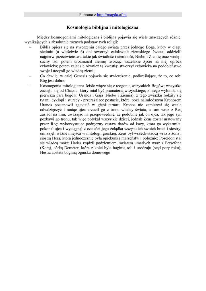 Pobrano z http://magda.of.pl Kosmologia biblijna i mitologiczna. Między kosmogoniami mitologiczną i biblijną pojawia się wiele znaczących róŜnic, wynikających z absolutnie róŜnych podstaw tych religii: − Biblia opiera się na stworzeniu całego świata przez jednego Boga, który w ciągu siedmiu (a właściwie 6) dni stworzył całokształt ziemskiego świata: oddzielił najpierw przeciwieństwa takie jak światłość i ciemność, Niebo i Ziemię oraz wodę i suchy ląd; potem urozmaicił ziemię tworząc wszelakie Ŝycie na niej oprócz człowieka; potem zajął się równieŜ tą kwestią: stworzył człowieka na podobieństwo swoje i uczynił go władcą ziemi; − Co chwilę, w całej Genesis pojawia się stwierdzenie, podkreślające, Ŝe to, co robi Bóg jest dobre; − Kosmogonia mitologiczna ściśle wiąŜe się z teogonią wszystkich Bogów; wszystko zaczęło się od Chaosu, który miał być pramaterią wszystkiego; z niego wyłoniła się pierwsza para bogów: Uranos i Gaja (Niebo i Ziemia); z tego związku rodziły się tytani, cyklopi i sturęcy - przeraŜające postacie, które, poza najmłodszym Kronosem Uranos postanowił zgładzić w głębi tartaru; Kronos nie zamierzał się wcale odwdzięczyć i raniąc ojca zrzucił go z tronu władcy świata, a sam wraz z Reą zasiadł na nim; uwaŜając na przepowiednię, Ŝe podobnie jak on ojca, tak jego syn pozbawi go tronu, tak więc połykał wszystkie dzieci, jednak Zeus został uratowany przez Reę; wykorzystując podręczny zestaw darów od kozy, która go wykarmiła, pokonał ojca i wyciągnął z czeluści jego Ŝołądka wszystkich swoich braci i siostry; oni zajęli waŜne miejsca w mitologii greckiej: Zeus był wszechwładcą wraz z Ŝoną i siostrą Herą, która jednocześnie była opiekunką małŜeństw i połoŜnic; Posejdon stał się władcą mórz; Hades rządził podziemiem, światem umarłych wraz z Persefoną (Korą), córką Demeter, która z kolei była boginią roli i urodzaju (stąd pory roku); Hestia została boginią ogniska domowego