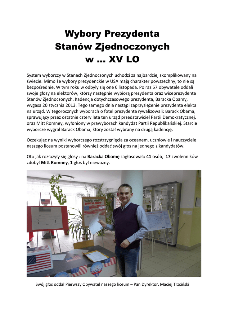 Wybory Prezydenta Stanów Zjednoczonych w ... XV LO System wyborczy w Stanach Zjednoczonych uchodzi za najbardziej skomplikowany na świecie. Mimo że wybory prezydenckie w USA mają charakter powszechny, to nie są bezpośrednie. W tym roku w odbyły się one 6 listopada. Po raz 57 obywatele oddali swoje głosy na elektorów, którzy następnie wybiorą prezydenta oraz wiceprezydenta Stanów Zjednoczonych. Kadencja dotychczasowego prezydenta, Baracka Obamy, wygasa 20 stycznia 2013. Tego samego dnia nastąpi zaprzysiężenie prezydenta elekta na urząd. W tegorocznych wyborach o fotel prezydenta rywalizowali: Barack Obama, sprawujący przez ostatnie cztery lata ten urząd przedstawiciel Partii Demokratycznej, oraz Mitt Romney, wyłoniony w prawyborach kandydat Partii Republikańskiej. Starcie wyborcze wygrał Barack Obama, który został wybrany na drugą kadencję. Oczekując na wyniki wyborczego rozstrzygnięcia za oceanem, uczniowie i nauczyciele naszego liceum postanowili również oddać swój głos na jednego z kandydatów. Oto jak rozłożyły się głosy : na Baracka Obamę zagłosowało 41 osób, 17 zwolenników zdobył Mitt Romney, 1 głos był nieważny. Swój głos oddał Pierwszy Obywatel naszego liceum – Pan Dyrektor, Maciej Trzciński Podpis na liście wyborców – kartę można było otrzymać tylko raz Wybieram Prezydenta USA, zmieniam losy świata – od razu jest mi weselej A czego tam szuka ta dziewczyna? Sprawdza program wyborczy swojego kandydata? Ciekawe, na kogo głosowała?