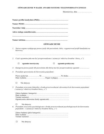 OŚWIADCZENIE W RAZIE AWARII SYSTEMU TELEINFORMATYCZNEGO Skierniewice, dnia …………………. Numer profilu kandydata (PKK)……………………………………… Numer PESEL …………………………………………………………. Nazwisko i imię ………………………………………………………… Adres stałego zameldowania…………………………………………... …………………………………………………………………………… Numer telefonu………………………………………………………… OŚWIADCZENIE 1. Nazwa organu wydającego prawo jazdy lub pozwolenie, który wygenerował profil kandydata na kierowcę: ……………………………………………………………………………………………………… 2. Część egzaminu jaka ma być przeprowadzona ( zaznaczyć właściwy kwadrat literą „x”) □ egzamin teoretyczny □ egzamin praktyczny 3. Kategoria prawa jazdy lub pozwolenia dla której ma być przeprowadzony egzamin …………….. 4. Posiadam uprawnienia do kierowania pojazdami: Prawo jazdy kat………………Nr …………………………Nr druku……………………………… Data wydania…………………………Organ wydający…………………………………………… □ Nie dotyczy 5. Posiadam orzeczenie lekarskie o braku przeciwwskazań zdrowotnych do kierowania pojazdami: ( zaznaczyć właściwy kwadrat literą „x”) Zakres badania ( kategorie)…………………………………………… Data wydania…………………………………………………………. Termin ważności……………………………………………………… Ograniczenia zdrowotne (kody ograniczeń)………………………….. □ Nie dotyczy 6. Posiadam orzeczenie psychologiczne o braku przeciwwskazań psychologicznych do kierowania pojazdami : ( zaznaczyć właściwy kwadrat literą „x”) Zakres badania (jakie kategorie)…………………………………….. Data wydania ……………………………………………………….. Termin ważności ……………………………………………………. □ Nie dotyczy 7. Ukończyłam(-em) szkolenie dla osób ubiegających się o uprawnienia do kierowania pojazdami: ( zaznaczyć właściwy kwadrat literą „x”) Data rozpoczęcia szkolenia………………………………………….. Data zakończenia szkolenia…………………………………………. Kategoria(-e) prawa jazdy lub pozwolenia………………………….. Numer ośrodka szkolenia kierowców……………………………….. Numer instruktora…………………………………………………… □ Nie dotyczy 8. Zostałem skierowany(-a) na kontrolne sprawdzenie kwalifikacji w trybie: ……………………………………………………………………………………………………… □ Nie dotyczy 9. Posiadam zgodę, o której mowa w art. 11 ust. 2 ustawy z dnia 5 stycznia 2011r. o kierujących pojazdami – pisemną zgodę rodziców lub opiekunów w przypadku osób, które nie ukończyły 18 roku życia ( zaznaczyć właściwy kwadrat literą „x”) □ □ Tak Nie dotyczy 10. Oświadczam, że na dzień złożenia oświadczenia spełniam wymagana o których mowa w art. 11 ust.1 pkt 5 ustawy z dnia 5 stycznia 2011r. tj. ( zaznaczyć właściwy kwadrat literą „x”) □ Przebywam na terytorium Rzeczpospolitej Polskiej co najmniej przez 185 dnia w każdym roku kalendarzowym ze względu na swoje więzi osobiste lub zawodowe albo przedstawię zaświadczenie, że studiuję co najmniej od 6 miesięcy. 11. Oświadczam, że na dzień złożenia oświadczenia nie występują przesłanki, o których mowa w art. 12 ust. 1 pkt 1-5 ustawy z dnia 5 stycznia 2011 r. tj. ( zaznaczyć właściwy kwadrat literą „x”) □ □ □ □ □ nie stwierdzono u mnie aktywnej formy uzależnienia od alkoholu lub podobnie działającego środka, nie został orzeczony w stosunku do mnie – prawomocnym wyrokiem sądu – zakaz prowadzenia pojazdów samochodowych, nie mam cofniętego uprawnienia do kierowania pojazdami lub zatrzymanego prawa jazy – w okresie i zakresie obowiązywania decyzji, nie posiadam innego dokumentu stwierdzającego uprawnienia do kierowania pojazdami, nie uzyskałem(-am) za granicą prawa jazdy, które zostało zatrzymane lub uprawnienie do kierowania pojazdami które zostało cofnięte- w okresie obowiązywania zatrzymania prawa jazdy lub cofnięcia uprawnienia. Potwierdzam prawidłowość danych własnoręcznym podpisem i jestem świadomy(-a) odpowiedzialności karnej za składanie fałszywych zeznań, zgodnie z art. 233 k.k. ……………………………………… ( Podpis osoby składającej)