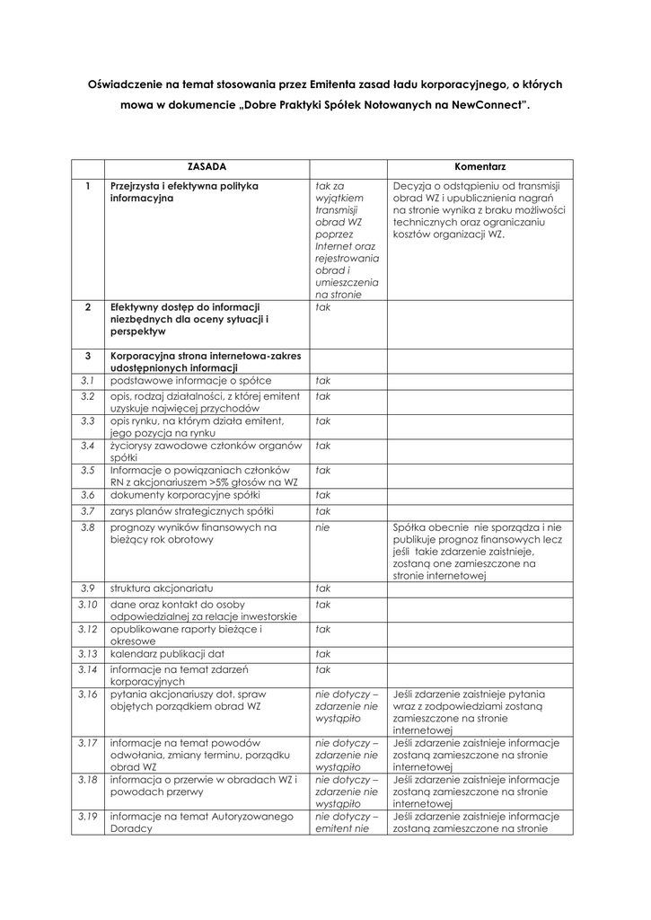 Oświadczenie na temat stosowania przez Emitenta zasad ładu korporacyjnego, o których mowa w dokumencie „Dobre Praktyki Spółek Notowanych na NewConnect”. ZASADA 1 Przejrzysta i efektywna polityka informacyjna 2 Efektywny dostęp do informacji niezbędnych dla oceny sytuacji i perspektyw 3 Korporacyjna strona internetowa-zakres udostępnionych informacji podstawowe informacje o spółce 3.1 3.2 Komentarz tak za wyjątkiem transmisji obrad WZ poprzez Internet oraz rejestrowania obrad i umieszczenia na stronie tak tak tak 3.6 opis, rodzaj działalności, z której emitent uzyskuje najwięcej przychodów opis rynku, na którym działa emitent, jego pozycja na rynku życiorysy zawodowe członków organów spółki Informacje o powiązaniach członków RN z akcjonariuszem >5% głosów na WZ dokumenty korporacyjne spółki 3.7 zarys planów strategicznych spółki tak 3.8 prognozy wyników finansowych na bieżący rok obrotowy nie 3.9 struktura akcjonariatu tak 3.10 dane oraz kontakt do osoby odpowiedzialnej za relacje inwestorskie opublikowane raporty bieżące i okresowe kalendarz publikacji dat tak informacje na temat zdarzeń korporacyjnych pytania akcjonariuszy dot. spraw objętych porządkiem obrad WZ tak informacje na temat powodów odwołania, zmiany terminu, porządku obrad WZ informacja o przerwie w obradach WZ i powodach przerwy nie dotyczy – zdarzenie nie wystąpiło nie dotyczy – zdarzenie nie wystąpiło nie dotyczy – emitent nie 3.3 3.4 3.5 3.12 3.13 3.14 3.16 3.17 3.18 3.19 informacje na temat Autoryzowanego Doradcy Decyzja o odstąpieniu od transmisji obrad WZ i upublicznienia nagrań na stronie wynika z braku możliwości technicznych oraz ograniczaniu kosztów organizacji WZ. tak tak tak tak Spółka obecnie nie sporządza i nie publikuje prognoz finansowych lecz jeśli takie zdarzenie zaistnieje, zostaną one zamieszczone na stronie internetowej tak tak nie dotyczy – zdarzenie nie wystąpiło Jeśli zdarzenie zaistnieje pytania wraz z zodpowiedziami zostaną zamieszczone na stronie internetowej Jeśli zdarzenie zaistnieje informacje zostaną zamieszczone na stronie internetowej Jeśli zdarzenie zaistnieje informacje zostaną zamieszczone na stronie internetowej Jeśli zdarzenie zaistnieje informacje zostaną zamieszczone na stronie 3.20 3.21 4 5 6 informacje na temat Animatora akcji emitenta dokument informacyjny (prospekt emisyjny) Strona internetowa w języku polskim lub angielskim Wykorzystanie sekcji relacji inwestorskich na stronie GPWInfoStrefa Utrzymywanie kontaktów z przedstawicielami AD korzysta z usług AD tak internetowej tak tak tak Niezwłoczne informowanie AD o istotnym zdarzeniu Zapewnienie dostępu AD do dokumentów i niezbędnych informacji Zakres treściowy raportu rocznego nie dotyczy Zgodnie z RB 24/2012 z dnia 04.10.2012 r. Emitent zakończył współpracę z AD. Decyzja wynikała z faktu, iż poprzez zdobyte doświadczenie Spółka we własnym zakresie jest w stanie realizować obowiązki informacyjne. j.w. nie dotyczy j.w. Uczestnictwo członków zarządu i rady nadzorczej w obradach WZ Publicznie dostępne spotkanie z inwestorami, analitykami, mediami tak 12 Informacje zawarte w uchwale w sprawie emisji akcji z prawem poboru 13 Zapewnienie odpowiedniego odstępu czasowego pomiędzy decyzjami nie dotyczy – zdarzenie nie wystąpiło tak 7 8 9 10 11 13a Zwołanie NWZ przez akcjonariuszy 15 Wymogi dot. uchwały w sprawie wypłaty dywidendy warunkowej 16 Raporty miesięczne 16a Uzasadnienie naruszenia obowiązku informacyjnego nie tak nie dotyczy nie dotyczy – zdarzenie nie wystąpiło nie dotyczy – zdarzenie nie wystąpiło nie nie dotyczy – zdarzenie nie wystąpiło Zgodnie z RB 24/2012 z dnia 04.10.2012 r. Emitent zakończył współpracę z AD. Jeśli zdarzenie zaistnieje zasada będzie respektowana. WZ podejmuje uchwały w poszanowaniu praw i potrzeb informacyjnych Akcjonariuszy zapewniając niezbędne odstępy czasowe. Jeśli zdarzenie zaistnieje zasada będzie respektowana. Jeśli zdarzenie zaistnieje zasada będzie respektowana. Emitent nie sporządza raportów miesięcznych. Jeśli zdarzenie zaistnieje zasada będzie respektowana.