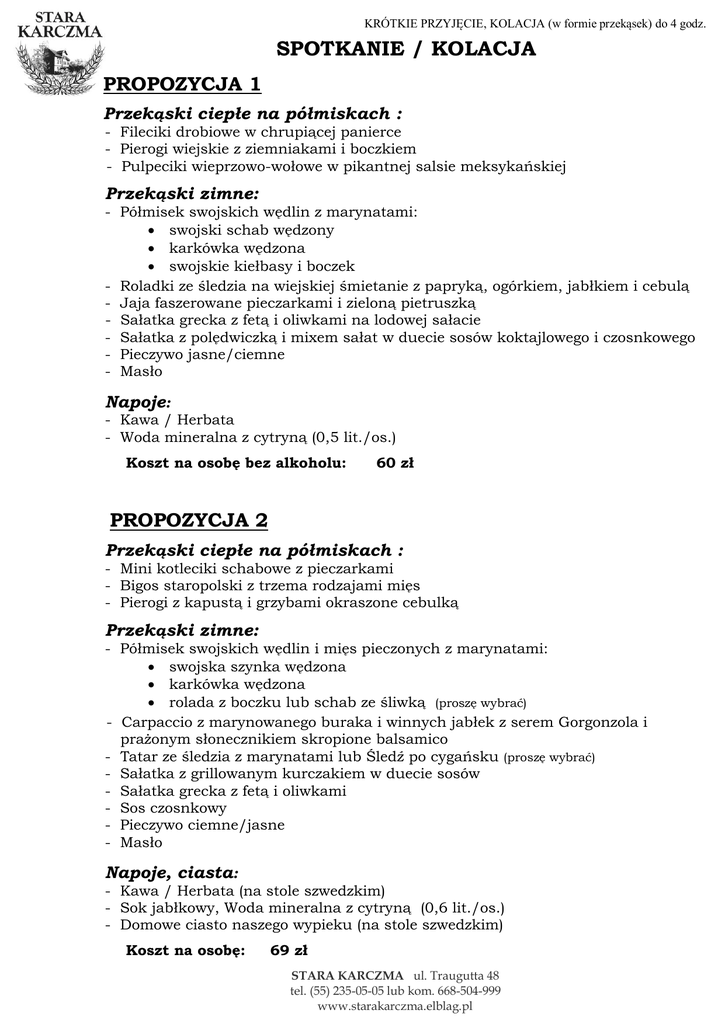 KRÓTKIE PRZYJĘCIE, KOLACJA (w formie przekąsek) do 4 godz. SPOTKANIE / KOLACJA PROPOZYCJA 1 Przekąski ciepłe na półmiskach : - Fileciki drobiowe w chrupiącej panierce - Pierogi wiejskie z ziemniakami i boczkiem - Pulpeciki wieprzowo-wołowe w pikantnej salsie meksykańskiej Przekąski zimne: - Półmisek swojskich wędlin z marynatami: swojski schab wędzony karkówka wędzona swojskie kiełbasy i boczek - Roladki ze śledzia na wiejskiej śmietanie z papryką, ogórkiem, jabłkiem i cebulą - Jaja faszerowane pieczarkami i zieloną pietruszką - Sałatka grecka z fetą i oliwkami na lodowej sałacie - Sałatka z polędwiczką i mixem sałat w duecie sosów koktajlowego i czosnkowego - Pieczywo jasne/ciemne - Masło Napoje: - Kawa / Herbata - Woda mineralna z cytryną (0,5 lit./os.) Koszt na osobę bez alkoholu: 60 zł PROPOZYCJA 2 Przekąski ciepłe na półmiskach : - Mini kotleciki schabowe z pieczarkami - Bigos staropolski z trzema rodzajami mięs - Pierogi z kapustą i grzybami okraszone cebulką Przekąski zimne: - Półmisek swojskich wędlin i mięs pieczonych z marynatami: swojska szynka wędzona karkówka wędzona rolada z boczku lub schab ze śliwką (proszę wybrać) - Carpaccio z marynowanego buraka i winnych jabłek z serem Gorgonzola i prażonym słonecznikiem skropione balsamico - Tatar ze śledzia z marynatami lub Śledź po cygańsku (proszę wybrać) - Sałatka z grillowanym kurczakiem w duecie sosów - Sałatka grecka z fetą i oliwkami - Sos czosnkowy - Pieczywo ciemne/jasne - Masło Napoje, ciasta: - Kawa / Herbata (na stole szwedzkim) - Sok jabłkowy, Woda mineralna z cytryną (0,6 lit./os.) - Domowe ciasto naszego wypieku (na stole szwedzkim) Koszt na osobę: 69 zł STARA KARCZMA ul. Traugutta 48 tel. (55) 235-05-05 lub kom. 668-504-999 www.starakarczma.elblag.pl KRÓTKIE PRZYJĘCIE, KOLACJA (w formie przekąsek) do 4 godz. PROPOZYCJA 3 Przekąski ciepłe na półmiskach : - Grillowane szaszłyki drobiowe z bekonem i warzywami Mini kotleciki schabowe z pieczarkami Uda z kurczaka faszerowane mięsem z morelami Opiekane cząstki ziemniaka Przekąski zimne: - Półmisek swojskich wędlin z marynatami: Swojska szynka wędzona karkówka wędzona swojski schab wędzony - Roladki z szynki nadziewane pastą jajeczno-serową w delikatnej glazurze - Łosoś marynowany w ginie z orientalnymi sosami - Caprese – pomidory z mozarellą podane z pesto i świeżą bazylią - Śledź z brzoskwiniami w śmietanie lub Śledź po wiejsku - Sałatka z grillowanym kurczakiem w duecie sosów - Sos czosnkowy, salsa meksykańska - Pieczywo jasne/ciemne - Masło Napoje, ciasta: - Kawa / Herbata (na stole szwedzkim) - Sok jabłkowy, Coca-cola, Woda mineralna z cytryną (0,7 lit./os.) - Domowe ciasto naszego wypieku (na stole szwedzkim) Koszt na osobę bez alkoholu: 75 zł Propozycja napojów i alkoholi na przyjęcie/spotkanie Dodatkowe napoje rozliczane wg spożycia serwowane w dzbankach: Woda mineralna z cytryną 1 litr - 7 zł Soki jabłkowy, pomarańczowy 1litr - 8 zł Napoje gazowane typu Coca-Cola, Sprite 1 litr - 8 zł Dodatkowy alkohol: Wódka czysta Krupnik 39 zł/ 0,5l Wódka czysta Wyborowa 45 zł/ 0,5l Wino czerwone/białe Cervantes 26 zł/but. W cenie przyjęcia ujęte jest wynajęcie Sali, dekoracja stołów (obrusy, serwetki, organza, świece, kielichy), przygotowanie przyjęcia, obsługa kelnerska, obsługa przyjęcia do 4 godzin. Kompozycje kwiatowe z żywych kwiatów dodatkowo płatne lub we własnym zakresie. W przypadku wniesienia własnych ciast lub tortu należy doliczyć usługę serwisową w wysokości 2zł/os. W tej ofercie nie ma możliwości wniesienia własnego alkoholu. Propozycja przygotowana dla min. 15 osób. Przy mniejszej ilości gości koszt +(2-6)zł STARA KARCZMA ul. Traugutta 48 tel. (55) 235-05-05 lub kom. 668-504-999 www.starakarczma.elblag.pl
