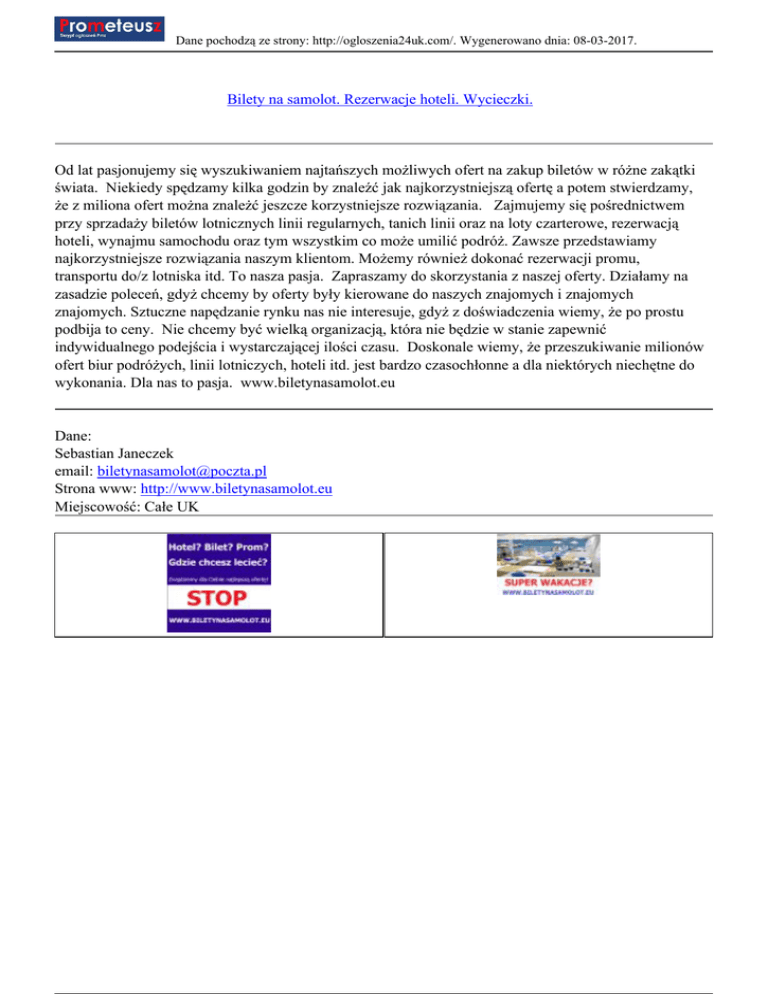 Dane pochodzą ze strony: http://ogloszenia24uk.com/. Wygenerowano dnia: 08-03-2017. Bilety na samolot. Rezerwacje hoteli. Wycieczki. Od lat pasjonujemy się wyszukiwaniem najtańszych możliwych ofert na zakup biletów w różne zakątki świata. Niekiedy spędzamy kilka godzin by znaleźć jak najkorzystniejszą ofertę a potem stwierdzamy, że z miliona ofert można znależć jeszcze korzystniejsze rozwiązania. Zajmujemy się pośrednictwem przy sprzadaży biletów lotnicznych linii regularnych, tanich linii oraz na loty czarterowe, rezerwacją hoteli, wynajmu samochodu oraz tym wszystkim co może umilić podróż. Zawsze przedstawiamy najkorzystniejsze rozwiązania naszym klientom. Możemy również dokonać rezerwacji promu, transportu do/z lotniska itd. To nasza pasja. Zapraszamy do skorzystania z naszej oferty. Działamy na zasadzie poleceń, gdyż chcemy by oferty były kierowane do naszych znajomych i znajomych znajomych. Sztuczne napędzanie rynku nas nie interesuje, gdyż z doświadczenia wiemy, że po prostu podbija to ceny. Nie chcemy być wielką organizacją, która nie będzie w stanie zapewnić indywidualnego podejścia i wystarczającej ilości czasu. Doskonale wiemy, że przeszukiwanie milionów ofert biur podróżych, linii lotniczych, hoteli itd. jest bardzo czasochłonne a dla niektórych niechętne do wykonania. Dla nas to pasja. www.biletynasamolot.eu Dane: Sebastian Janeczek email: [email protected] Strona www: http://www.biletynasamolot.eu Miejscowość: Całe UK