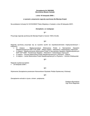 Zarządzenie Nr 296/2008 Burmistrza Miasta Czeladź z dnia 18 listopada 2008 r. w sprawie: przyznania nagrody sportowej dla Macieja Krężel Na podstawie Uchwały Nr XXVIII/299/07 Rady Miejskiej w Czeladzi z dnia 29 listopada 2007r. Zarządzam, co następuje: §1 Przyznaję nagrodę sportową dla Macieja Krężel w kwocie 1500 zł brutto. §2 Nagrodę sportową przyznaje się za wysokie wyniki we współzawodnictwie międzynarodowym i krajowym: • III miejsce – Międzynarodowe Mistrzostwa Polski w Narciarstwie Alpejskim Niepełnosprawnych EDF CUP 2008 – Slalom Gigant – Niewidomi i niedowidzący mężczyźni • II miejsce - Międzynarodowe Mistrzostwa Polski w Narciarstwie Alpejskim Niepełnosprawnych EDF CUP 2008 – Kombinacja Alpejska – Niewidomi i niedowidzący mężczyźni • II miejsce – Zimowe Mistrzostwa Polski Niepełnosprawnych w Pływaniu - Dębica • II miejsce – Letnie Mistrzostwa Polski Niepełnosprawnych w Pływaniu – Gorzów Wielkopolski §3 Nagroda wypłacona będzie: • 25 listopada 2008 r. §4 Wykonanie Zarządzenia powierzam Kierownikowi Wydziału Polityki Społecznej i Edukacji. §5 Zarządzenie wchodzi w życie z dniem podpisania. Zastępca Burmistrza mgr Anna Ślagórska