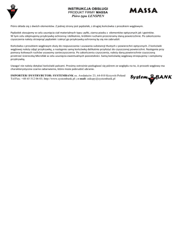 INSTRUKCJA OBSŁUGI PRODUKT FIRMY MASSA Pióro typu LENSPEN Pióro składa się z dwóch elementów. Z jednej strony jest pędzelek, z drugiej końcówka z proszkiem węglowym. Pędzelek stosujemy w celu usunięcia ciał materialnych typu: pyłki, ziarna piasku z elementów optycznych jak i gwintów. W tym celu zdejmujemy przykrywkę ochronną i delikatnie, krótkimi ruchami przecieramy daną powierzchnie. Po zakończeniu czyszczenia należy strzepnąć pędzelek i zakryć go przykrywką ochronną by się nie zabrudził. Końcówka z proszkiem węglowym służy do rozpuszczania i usuwania substancji tłustych z powierzchni optycznych. Z końcówki węglowej należy zdjęć przykrywkę, a następnie samą końcówkę delikatnie przyłożyć do czyszczonej powierzchni. Następnie przy pomocy kołowych ruchów usuwamy zanieczyszczenia. Po zakończeniu czyszczenia, należy daną powierzchnie czyszczoną przetrzeć ściereczką Microfab w celu usunięcia ewentualnych pozostałości. Samą końcówkę węglową strzepujemy i zamykamy przykrywką. Uwaga! nie należy dotykać końcówki palcami. Prosimy ostrożnie posługiwać się piórem ze względu na to, iż proszek węglowy ma charakterystyczne czarne zabarwienie, które może pobrudzić ubranie. IMPORTER/ DYSTRYBUTOR: SYSTEMBANK os. Awdańców 23, 64-010 Krzywiń Poland Tel/Fax: +48 65 512 06 03; http://www.systembank.pl ; e-mail: [email protected]