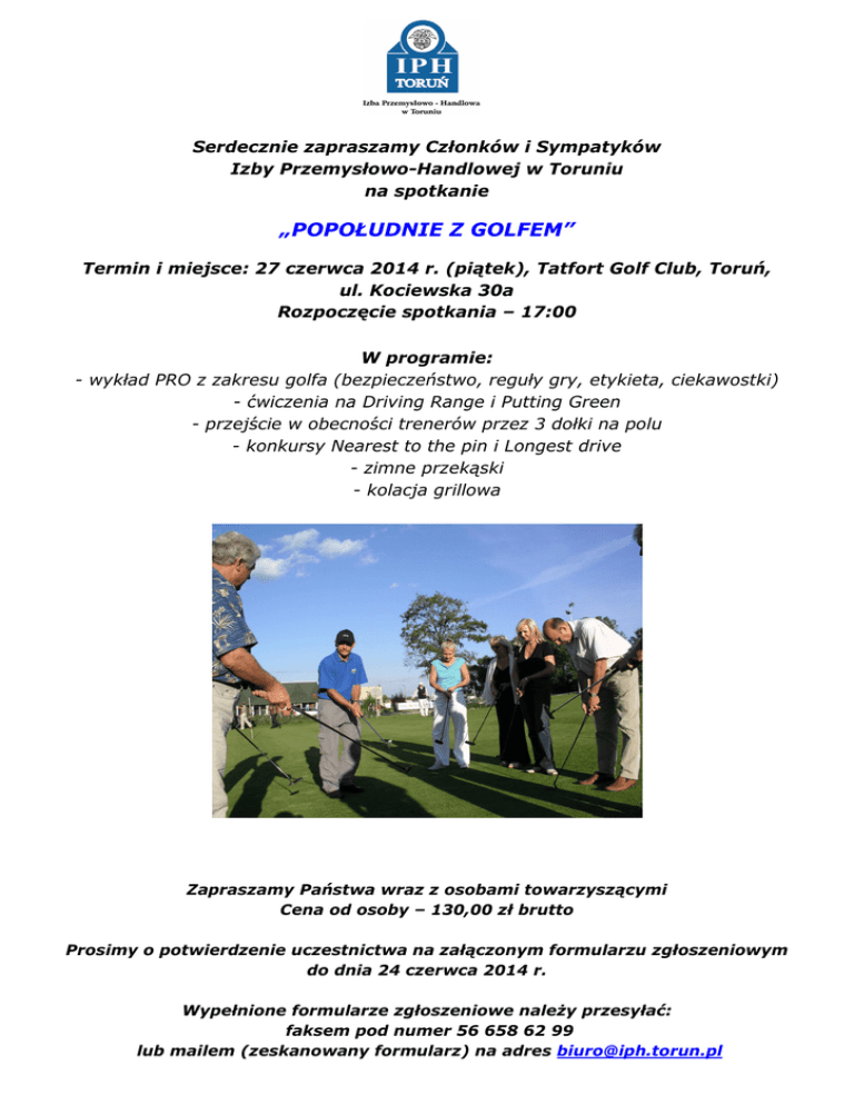 Serdecznie zapraszamy Członków i Sympatyków Izby Przemysłowo-Handlowej w Toruniu na spotkanie „POPOŁUDNIE Z GOLFEM” Termin i miejsce: 27 czerwca 2014 r. (piątek), Tatfort Golf Club, Toruń, ul. Kociewska 30a Rozpoczęcie spotkania – 17:00 W programie: - wykład PRO z zakresu golfa (bezpieczeństwo, reguły gry, etykieta, ciekawostki) - ćwiczenia na Driving Range i Putting Green - przejście w obecności trenerów przez 3 dołki na polu - konkursy Nearest to the pin i Longest drive - zimne przekąski - kolacja grillowa Zapraszamy Państwa wraz z osobami towarzyszącymi Cena od osoby – 130,00 zł brutto Prosimy o potwierdzenie uczestnictwa na załączonym formularzu zgłoszeniowym do dnia 24 czerwca 2014 r. Wypełnione formularze zgłoszeniowe naleŜy przesyłać: faksem pod numer 56 658 62 99 lub mailem (zeskanowany formularz) na adres [email protected]
