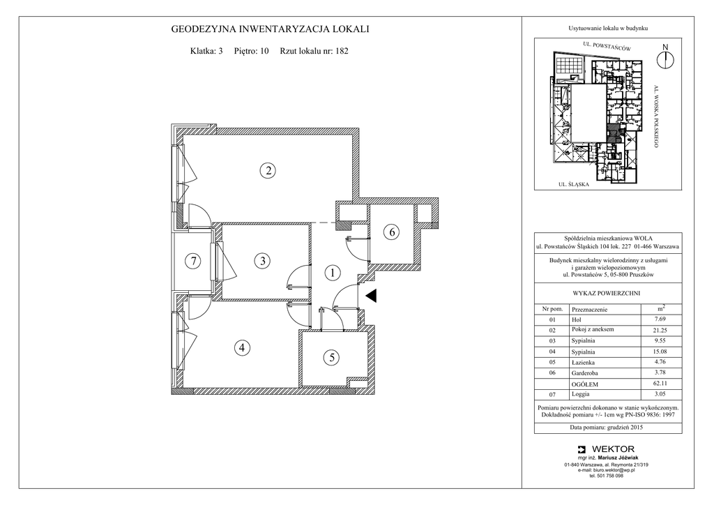GEODEZYJNA INWENTARYZACJA LOKALI Piętro: 10 UL. POWST Rzut lokalu nr: 182 AŃCÓW AL. WOJSKA POLSKIEGO F Klatka: 3 Usytuowanie lokalu w budynku 2 UL. ŚLĄSKA 6 3 7 1 Spółdzielnia mieszkaniowa WOLA ul. Powstańców Śląskich 104 lok. 227 01-466 Warszawa Budynek mieszkalny wielorodzinny z usługami i garażem wielopoziomowym ul. Powstańców 5, 05-800 Pruszków WYKAZ POWIERZCHNI Nr pom. 4 5 Przeznaczenie m2 01 Hol 7.69 02 Pokoj z aneksem 21.25 03 Sypialnia 9.55 04 Sypialnia 15.08 05 Łazienka 4.76 06 Garderoba 3.78 OGÓŁEM 62.11 Loggia 3.05 07 Pomiaru powierzchni dokonano w stanie wykończonym. Dokładność pomiaru +/- 1cm wg PN-ISO 9836: 1997 Data pomiaru: grudzień 2015 WEKTOR mgr inż. Mariusz Jóźwiak 01-840 Warszawa, al. Reymonta 21/319 e-mail: [email protected] tel. 501 758 098
