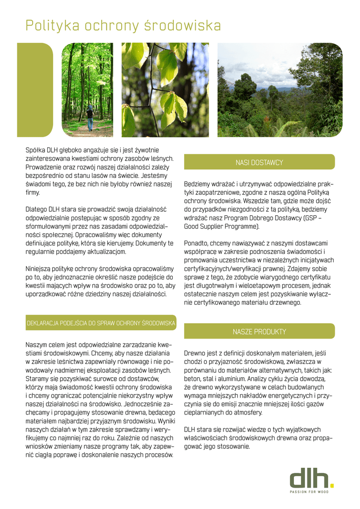 Polityka ochrony środowiska Spółka DLH głęboko angażuje się i jest żywotnie zainteresowana kwestiami ochrony zasobów leśnych. Prowadzenie oraz rozwój naszej działalności zależy bezpośrednio od stanu lasów na świecie. Jesteśmy świadomi tego, że bez nich nie byłoby również naszej firmy. Dlatego DLH stara się prowadzić swoją działalność odpowiedzialnie postępując w sposób zgodny ze sformułowanymi przez nas zasadami odpowiedzialności społecznej. Opracowaliśmy więc dokumenty definiujące politykę, którą się kierujemy. Dokumenty te regularnie poddajemy aktualizacjom. Niniejszą politykę ochrony środowiska opracowaliśmy po to, aby jednoznacznie określić nasze podejście do kwestii mających wpływ na środowisko oraz po to, aby uporządkować różne dziedziny naszej działalności. Nasi dostawcy Będziemy wdrażać i utrzymywać odpowiedzialne praktyki zaopatrzeniowe, zgodne z naszą ogólną Polityką ochrony środowiska. Wszędzie tam, gdzie może dojść do przypadków niezgodności z tą polityką, będziemy wdrażać nasz Program Dobrego Dostawcy (GSP Good Supplier Programme). Ponadto, chcemy nawiązywać z naszymi dostawcami współpracę w zakresie podnoszenia świadomości i promowania uczestnictwa w niezależnych inicjatywach certyfikacyjnych/weryfikacji prawnej. Zdajemy sobie sprawę z tego, że zdobycie wiarygodnego certyfikatu jest długotrwałym i wieloetapowym procesem, jednak ostatecznie naszym celem jest pozyskiwanie wyłącznie certyfikowanego materiału drzewnego. Deklaracja podejścia do spraw ochrony środowiska Nasze produkty Naszym celem jest odpowiedzialne zarządzanie kwestiami środowiskowymi. Chcemy, aby nasze działania w zakresie leśnictwa zapewniały równowagę i nie powodowały nadmiernej eksploatacji zasobów leśnych. Staramy się pozyskiwać surowce od dostawców, którzy mają świadomość kwestii ochrony środowiska i chcemy ograniczać potencjalnie niekorzystny wpływ naszej działalności na środowisko. Jednocześnie zachęcamy i propagujemy stosowanie drewna, będącego materiałem najbardziej przyjaznym środowisku. Wyniki naszych działań w tym zakresie sprawdzamy i weryfikujemy co najmniej raz do roku. Zależnie od naszych wniosków zmieniamy nasze programy tak, aby zapewnić ciągłą poprawę i doskonalenie naszych procesów. Drewno jest z definicji doskonałym materiałem, jeśli chodzi o przyjazność środowiskową, zwłaszcza w porównaniu do materiałów alternatywnych, takich jak: beton, stal i aluminium. Analizy cyklu życia dowodzą, że drewno wykorzystywane w celach budowlanych wymaga mniejszych nakładów energetycznych i przyczynia się do emisji znacznie mniejszej ilości gazów cieplarnianych do atmosfery. DLH stara się rozwijać wiedzę o tych wyjątkowych właściwościach środowiskowych drewna oraz propagować jego stosowanie. Jesteśmy również zdania, że najlepszym sposobem na dbanie o przyjazność środowiskową drewna jest pozyskanie odpowiednich certyfikatów wydawanych przez władze leśne, oraz że niezależna weryfikacja przeprowadzana przez organizacje zewnętrzne jest najlepszym sposobem na zagwarantowanie statusu prawnego produktów drzewnych oraz pierwszym krokiem w stronę zrównoważonej gospodarki leśnej. Nasi klienci Staramy się utrzymywać ścisły dialog z naszymi klientami, a poprzez szkolenia i inspirowanie, promować i zwiększać popyt rynkowy na odpowiedzialnie wytwarzane produkty drzewne. Wśród naszych klientów będziemy również propagować idee stosowania mniej eksploatowanych gatunków, co pozwoli na zapewnienie jak najefektywniejszego wykorzystania zasobów leśnych. Decydenci Będziemy utrzymywać ścisły dialog z wszystkimi decydentami, którym bliska jest problematyka ochrony środowiska, w tym z organizacjami pozarządowymi i instytucjami rządowymi. Aktywny dialog zagwarantuje nam znajomość oczekiwań dotyczących naszych działań mających wpływ na środowisko. Wszelkie informacje dotyczące niewłaściwych zachowań nas samych lub naszych dostawców będą traktowane z najwyższą powagą i będą powodować wszczęcie stosownych działań. Jako grupa, DLH będzie aktywnie starać się uczestniczyć w dyskusjach na forach międzynarodowych poświęconych sprawom wiążącym się z naszą działal- nością oraz dzielić się naszą wiedzą i doświadczeniami w zakresie certyfikacji i weryfikacji prawnej. Troska o klimat Produkty drzewne wytwarzane w procesach produkcji zrównoważonej są przyjazne dla klimatu, zarówno dzięki wyjątkowej zdolności drewna do ograniczania emisji CO2, jak również dzięki zdolności roślin do magazynowania węgla usuwanego z atmosfery. Produkcja i stosowanie drewna odgrywa zatem istotną rolę w procesach łagodzenia zmian klimatycznych. Jako duża firma branży drzewnej jesteśmy świadomi roli, jaką możemy odegrać w walce ze zmianami klimatu. Nasz Good Supplier Programme w połączeniu z projektami naszych partnerów oraz naszym wspólnym celem ciągłego zwiększania udziału drewna weryfikowanego i certyfikowanego w sprzedaży, są motorem napędowym naszych działań, którymi wnosimy swój wkład w ochronę środowiska. Ponadto: • Składamy raport roczny w ramach Carbon Disclosure Project • Składamy raport roczny w ramach Forest Footprint Disclosure Project. podpis Kent Arentoft Prezes i Dyrektor Generalny Dowiedz się więcej o naszych celach i osiągnięciach na www.dlh.com Dalhoff Larsen & Horneman A/S – Skagensgade 66, Box 136, DK-2630 Taastrup – VAT 34 41 19 13 – Tel +45 4350 0100 – Fax +45 4350 0199