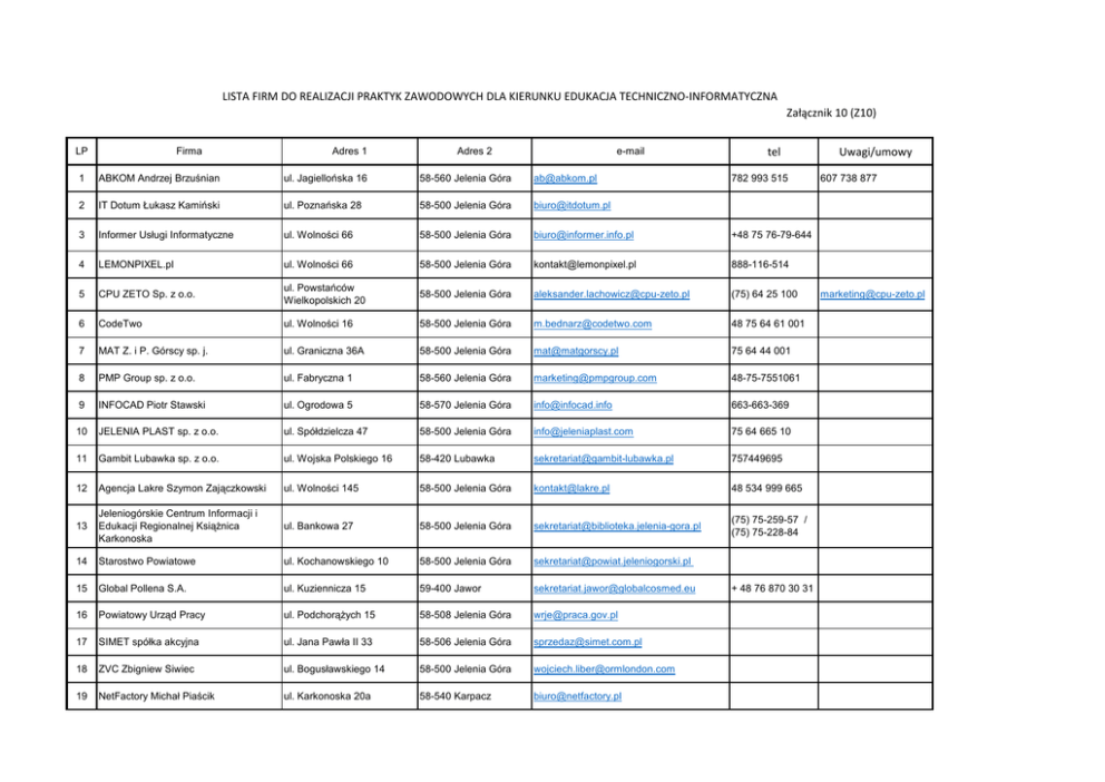 LISTA FIRM DO REALIZACJI PRAKTYK ZAWODOWYCH DLA KIERUNKU EDUKACJA TECHNICZNO-INFORMATYCZNA Załącznik 10 (Z10) LP Firma Adres 1 Adres 2 e-mail tel 1 ABKOM Andrzej Brzuśnian ul. Jagiellońska 16 58-560 Jelenia Góra [email protected] 2 IT Dotum Łukasz Kamiński ul. Poznańska 28 58-500 Jelenia Góra [email protected] 3 Informer Usługi Informatyczne ul. Wolności 66 58-500 Jelenia Góra [email protected] +48 75 76-79-644 4 LEMONPIXEL.pl ul. Wolności 66 58-500 Jelenia Góra [email protected] 888-116-514 5 CPU ZETO Sp. z o.o. ul. Powstańców Wielkopolskich 20 58-500 Jelenia Góra [email protected] (75) 64 25 100 6 CodeTwo ul. Wolności 16 58-500 Jelenia Góra [email protected] 48 75 64 61 001 7 MAT Z. i P. Górscy sp. j. ul. Graniczna 36A 58-500 Jelenia Góra [email protected] 75 64 44 001 8 PMP Group sp. z o.o. ul. Fabryczna 1 58-560 Jelenia Góra [email protected] 48-75-7551061 9 INFOCAD Piotr Stawski ul. Ogrodowa 5 58-570 Jelenia Góra [email protected] 663-663-369 10 JELENIA PLAST sp. z o.o. ul. Spółdzielcza 47 58-500 Jelenia Góra [email protected] 75 64 665 10 11 Gambit Lubawka sp. z o.o. ul. Wojska Polskiego 16 58-420 Lubawka [email protected] 757449695 12 Agencja Lakre Szymon Zajączkowski ul. Wolności 145 58-500 Jelenia Góra [email protected] 48 534 999 665 13 Jeleniogórskie Centrum Informacji i Edukacji Regionalnej Książnica Karkonoska ul. Bankowa 27 58-500 Jelenia Góra [email protected] (75) 75-259-57 / (75) 75-228-84 14 Starostwo Powiatowe ul. Kochanowskiego 10 58-500 Jelenia Góra [email protected] 15 Global Pollena S.A. ul. Kuziennicza 15 59-400 Jawor [email protected] 16 Powiatowy Urząd Pracy ul. Podchorążych 15 58-508 Jelenia Góra [email protected] 17 SIMET spółka akcyjna ul. Jana Pawła II 33 58-506 Jelenia Góra [email protected] 18 ZVC Zbigniew Siwiec ul. Bogusławskiego 14 58-500 Jelenia Góra [email protected] 19 NetFactory Michał Piaścik ul. Karkonoska 20a 58-540 Karpacz [email protected] 782 993 515 + 48 76 870 30 31 Uwagi/umowy 607 738 877 [email protected] 20 CONNECT ul. Sobieskiego 47 58-500 Jelenia Góra [email protected] 21 FUH Arena Karol Cyruliński ul. 1-go Maja 24a 58-530 Kowary [email protected] 757182760 22 INFO-serwis ul. Chałubińskiego 12 58-570 Jelenia Góra [email protected] 756199100 23 Dolfamex sp. z o.o. ul. Sobieskiego 51 58-500 Jelenia Góra [email protected]; [email protected] 75 752 28 11 24 Draexlmaier Group Jelenia Góra ul. Spółdzielcza 45 58-500 Jelenia Góra [email protected] 25 dr Schneider Automotive Polska Radomierz 1D 58-520 Janowice Wielkie [email protected] 26 FPHU Netcomp Pogotowie Komputerowe Serwis Janusz Wyspiański 7 Dywizji 4 59-800 Lubań [email protected] (75) 646-55-95 27 AllSenses Agencja iteraktywna ul. Krośnieńska 4/2 58-560 Jelenia Góra [email protected] 506 177 561 28 Zorka sp. z o.o. ul. Dworcowa 19 58-560 Jelenia Góra [email protected] (+48) 75 646 63 03 29 Elektromont ul. Waryńskiego 18 58-500 Jelenia Góra [email protected] 075 64-58-907 30 Leroy Merlin ul. Legnicka 3 58-500 Jelenia Góra [email protected] 31 Powiatowy Urząd Pracy 32 ORM London 33 NetFactory Michał Piaścik 34 Zorka sp z o.o. 35 Elektromont 36 Leroy Merlin 37 DWUP 607 833 423 Potwierdzony udział w projekcie