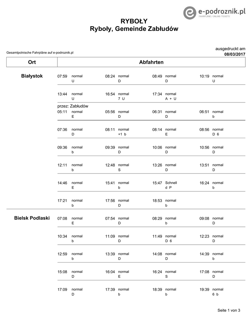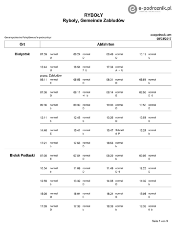 RYBOŁY Ryboły, Gemeinde Zabłudów ausgedruckt am 08/03/2017 Gesamtpolnische Fahrpläne auf e-podroznik.pl Ort Białystok Abfahrten 07:59 13:44 normal U 08:24 normal normal U 16:54 normal D 7 U 08:49 normal D 10:19 normal U 17:34 normal A + U przez: Zabłudów 05:11 07:36 09:36 12:11 14:46 17:21 Bielsk Podlaski 07:08 10:34 12:59 15:08 17:09 normal E 05:56 normal normal D 08:11 normal normal b 09:39 normal normal b 12:48 normal normal E 15:41 normal normal b 17:56 normal normal E 07:54 normal normal b 11:09 normal normal b 13:39 normal normal D 16:04 normal normal D 17:39 normal D +1 b D S b D D D D E b 06:31 normal D 08:14 normal E 10:06 normal D 13:26 normal D 15:47 Schnell d P 06:51 normal b 08:56 normal D 6 10:56 normal D 13:51 normal D 16:24 normal b 18:53 normal b 08:29 normal b 11:49 normal D 6 14:08 normal D 16:24 normal S 18:39 normal b 09:08 normal D 12:23 normal D 14:39 normal b 17:08 normal D 19:39 normal 6 b Seite 1 von 3 RYBOŁY Ryboły, Gemeinde Zabłudów ausgedruckt am 08/03/2017 Gesamtpolnische Fahrpläne auf e-podroznik.pl Ort Abfahrten 19:40 normal p b 20:34 normal b przez: Bielsk Podlaski, Brańsk, Pobikry Ciechanowiec 17:08 normal D przez: Bielsk Podlaski, Kleszczele Czeremcha 15:08 normal D przez: Siemiatycze, Łosice, Radzyń Podlaski, Lublin, Kraśnik Janów Lubelski 10:15 Schnell d P przez: Siemiatycze, Łosice, Radzyń Podlaski, Lublin Kraśnik 10:15 Schnell d P przez: Siemiatycze, Łosice, Radzyń Podlaski Lublin 10:15 Schnell d P przez: Siemiatycze Łosice 10:15 Schnell d P przez: Siemiatycze, Łosice Radzyń Podlaski 10:15 Schnell d P przez: Bielsk Podlaski, Brańsk, Olendy Rudka 19:40 normal p b przez: Siemiatycze, Łosice, Radzyń Podlaski, Lublin, Kraśnik, Janów Lubelski Rzeszów 10:15 Schnell d P Siemiatycze 10:15 Schnell d P 12:33 normal normal U 16:43 normal normal E 05:56 normal 15:43 Zabłudów 05:11 U D D 13:23 normal D 14:03 normal D 16:43 normal C U 06:31 normal D 06:51 normal b Seite 2 von 3 RYBOŁY Ryboły, Gemeinde Zabłudów ausgedruckt am 08/03/2017 Gesamtpolnische Fahrpläne auf e-podroznik.pl Ort Abfahrten 07:36 09:36 12:11 14:46 17:21 normal D 08:11 normal normal b 09:39 normal normal b 12:48 normal normal E 15:41 normal normal b 17:56 normal 08:14 normal +1 b 08:56 normal E 10:06 normal D D 6 10:56 normal D 13:26 normal S D 13:51 normal D 15:47 Schnell b D 16:24 normal d P b 18:53 normal D b przez: Ciełuszki, Aleksicze 07:20 normal S 13:59 normal 14:55 normal S S Bezeichnungen + Kursuje w dni wolne od pracy (niedziele i święta) +1 kursuje w dni świąteczne 6 kursuje w soboty 7 kursuje w niedziele A Kursuje od poniedziałku do piątku C kursuje w soboty, niedziele i święta D kursuje od poniedziałku do piątku oprócz świąt E kursuje od poniedziałku do soboty oprócz świąt P kurs pośpieszny S kursuje w dni nauki szkolnej U nie kursuje 25.XII, 1.I, 1-dzień Wielkanocy b nie kursuje w dniu 1.I, w pierwszy dzień Świąt Wielkanocnych i w dniu 25 XII d nie kursuje w dniu 01.I, w pierwszy i drugi dzień Świąt Wielkanocnych oraz w dniach p nie kursuje w soboty