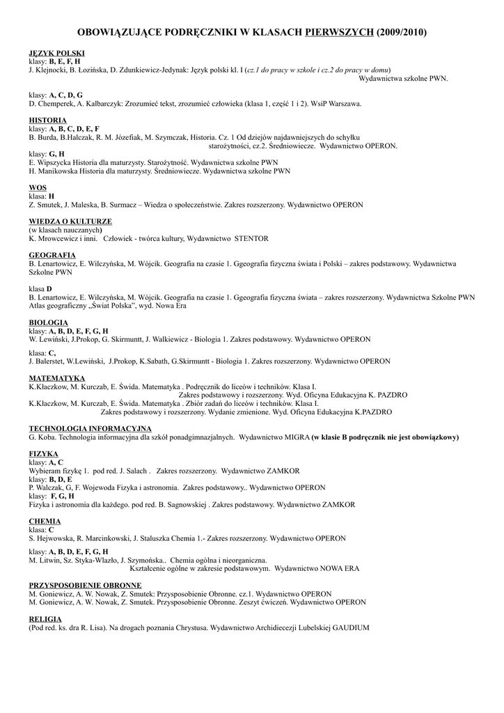 OBOWIĄZUJĄCE PODRĘCZNIKI W KLASACH PIERWSZYCH (2009/2010) JĘZYK POLSKI klasy: B, E, F, H J. Klejnocki, B. Łozińska, D. Zdunkiewicz-Jedynak: Język polski kl. I (cz.1 do pracy w szkole i cz.2 do pracy w domu) Wydawnictwa szkolne PWN. klasy: A, C, D, G D. Chemperek, A. Kalbarczyk: Zrozumieć tekst, zrozumieć człowieka (klasa 1, część 1 i 2). WsiP Warszawa. HISTORIA klasy: A, B, C, D, E, F B. Burda, B.Halczak, R. M. Józefiak, M. Szymczak, Historia. Cz. 1 Od dziejów najdawniejszych do schyłku starożytności, cz.2. Średniowiecze. Wydawnictwo OPERON. klasy: G, H E. Wipszycka Historia dla maturzysty. Starożytność. Wydawnictwa szkolne PWN H. Manikowska Historia dla maturzysty. Średniowiecze. Wydawnictwa szkolne PWN WOS klasa: H Z. Smutek, J. Maleska, B. Surmacz – Wiedza o społeczeństwie. Zakres rozszerzony. Wydawnictwo OPERON WIEDZA O KULTURZE (w klasach nauczanych) K. Mrowcewicz i inni. Człowiek - twórca kultury, Wydawnictwo STENTOR GEOGRAFIA B. Lenartowicz, E. Wilczyńska, M. Wójcik. Geografia na czasie 1. Ggeografia fizyczna świata i Polski – zakres podstawowy. Wydawnictwa Szkolne PWN klasa D B. Lenartowicz, E. Wilczyńska, M. Wójcik. Geografia na czasie 1. Ggeografia fizyczna świata – zakres rozszerzony. Wydawnictwa Szkolne PWN Atlas geograficzny „Świat Polska”, wyd. Nowa Era BIOLOGIA klasy: A, B, D, E, F, G, H W. Lewiński, J.Prokop, G. Skirmuntt, J. Walkiewicz - Biologia 1. Zakres podstawowy. Wydawnictwo OPERON klasa: C, J. Balerstet, W.Lewiński, J.Prokop, K.Sabath, G.Skirmuntt - Biologia 1. Zakres rozszerzony. Wydawnictwo OPERON MATEMATYKA K.Kłaczkow, M. Kurczab, E. Świda. Matematyka . Podręcznik do liceów i techników. Klasa I. Zakres podstawowy i rozszerzony. Wyd. Oficyna Edukacyjna K. PAZDRO K.Kłaczkow, M. Kurczab, E. Świda. Matematyka . Zbiór zadań do liceów i techników. Klasa I. Zakres podstawowy i rozszerzony. Wydanie zmienione. Wyd. Oficyna Edukacyjna K.PAZDRO TECHNOLOGIA INFORMACYJNA G. Koba. Technologia informacyjna dla szkół ponadgimnazjalnych. Wydawnictwo MIGRA (w klasie B podręcznik nie jest obowiązkowy) FIZYKA klasy: A, C Wybieram fizykę 1. pod red. J. Salach . Zakres rozszerzony. Wydawnictwo ZAMKOR klasy: B, D, E P. Walczak, G, F. Wojewoda Fizyka i astronomia. Zakres podstawowy.. Wydawnictwo OPERON klasy: F, G, H Fizyka i astronomia dla każdego. pod red. B. Sagnowskiej . Zakres podstawowy. Wydawnictwo ZAMKOR CHEMIA klasa: C S. Hejwowska, R. Marcinkowski, J. Staluszka Chemia 1.- Zakres rozszerzony. Wydawnictwo OPERON klasy: A, B, D, E, F, G, H M. Litwin, Sz. Styka-Wlazło, J. Szymońska.. Chemia ogólna i nieorganiczna. Kształcenie ogólne w zakresie podstawowym. Wydawnictwo NOWA ERA PRZYSPOSOBIENIE OBRONNE M. Goniewicz, A. W. Nowak, Z. Smutek: Przysposobienie Obronne. cz.1. Wydawnictwo OPERON M. Goniewicz, A. W. Nowak, Z. Smutek. Przysposobienie Obronne. Zeszyt ćwiczeń. Wydawnictwo OPERON RELIGIA (Pod red. ks. dra R. Lisa). Na drogach poznania Chrystusa. Wydawnictwo Archidiecezji Lubelskiej GAUDIUM PODRĘCZNIKI OBOWIĄZUJĄCE W KLASACH DRUGICH (2009/2010) JĘZYK POLSKI klasa: G M. Stala: Literatura polska. Romantyzm z antologią’ Wydawnictwo Literackie. Kraków. M. Nawrocki,M. Stala: Literatura polska. Pozytywizm z antologią’ Wydawnictwo Literackie. Kraków. M. Wyka: Młoda Polska z antologią. Wydawnictwo Literackie. klasy: A, B, C, D, E, F, H J. Klejnocki B. Łazińska. D. Zdunkiewicz-Jedynak,: Język polski 2. Wydawnictwa Szkolne PWN. HISTORIA klasy: A, B, C, D, E, F, B. Burda, B.Halczak, R. M. Józefiak, M. Szymczak, A. Roszak Historia 2. Czasy nowożytne klasy: G, H J. Czubaty A. Radziwiłł, W. Roszkowski Wydawnictwo OPERON Historia dla maturzysty. Nowożytność. Wydawnictwa szkolne PWN Historia dla maturzysty. Wiek XIX. Wydawnictwa szkolne PWN WOS klasa: H Z. Smutek, J. Maleska, B. Surmacz – Wiedza o społeczeństwie. Zakres rozszerzony. Wydawnictwo OPERON ELEMENTY HISTORII SZTUKI klasa: G B. Osińska. Sztuka i czas. Część I. WIEDZA O KULTURZE (w klasach nauczanych) K. Mrowcewicz i inni. Człowiek - twórca kultury. Wydawnictwo STENTOR GEOGRAFIA B. Lenartowicz, E. Wilczyńska, M. Wójcik. Geografia na czasie 2. Ggeografia społeczno-ekonomiczna świata i Polski – zakres podstawowy. Wydawnictwa Szkolne PWN PODSTAWY PRZEDSIĘBIORCZOŚCI (w klasach nauczanych) M. Biernacka, J. Korba, Z. Smutek. Podstawy Przedsiębiorczości, wyd. II zmienione Wydawnictwo OPERON BIOLOGIA klasy: A, B, D, E, F, G, H J. Balerstet i inni – Biologia 2. Zakres podstawowy. Wydawnictwo OPERON klasa: C W. Lewiński i inni. Biologia 2. Zakres rozszerzony. Wydawnictwo OPERON MATEMATYKA K.Kłaczkow, M. Kurczab, E. Świda. Matematyka . Podręcznik do liceów i techników. Klasa II. Zakres podstawowy i rozszerzony. Wyd. Oficyna Edukacyjna K. PAZDRO K.Kłaczkow, M. Kurczab, E. Świda. Matematyka. Zbiór zadań do liceów i techników. Klasa II. Zakres podstawowy i rozszerzony. Nowe opracowanie. Wyd. Oficyna Edukacyjna K. PAZDRO INFORMATYKA KLASA: B G.Koba. Informatyka dla liceum ogólnokształcącego. cz.1. Wydawnictwo MIGRA (podręcznik nie jest obowiązkowy) FIZYKA klasy: A, C Wybieram fizykę. pod red. J. Salach . Zakres rozszerzony. Wydawnictwo ZAMKOR klasy: B, D, E P. Walczak, G, F. Wojewoda Fizyka i astronomia. Zakres podstawowy.. Wydawnictwo OPERON klasy: F, G, H Fizyka i astronomia dla każdego. pod red. B. Sagnowskiej . Zakres podstawowy. Wydawnictwo ZAMKOR CHEMIA klasa: C S. Hejwowska, R. Marcinkowski, J. Staluszka: Chemia 2. Zakres rozszerzony Wydawnictwo OPERON klasy: A, B, D, E, F, G, H S. Hejwowska, R. Marcinkowski, J. Staluszko: Chemia 2. . Zakres podstawowy. Wydawnictwo OPERON PRZYSPOSOBIENIE OBRONNE M. Goniewicz, A. W. Nowak, Z. Smutek.: Przysposobienie Obronne.cz.2. Wydawnictwo OPERON M. Goniewicz, A. W. Nowak, Z. Smutek:. Przysposobienie Obronne. Zeszyt ćwiczeń. Wydawnictwo OPERON RELIGIA (pod red. ks.dra R. Lisa). W świetle Chrystusa: Prawdy. Podręcznik do klasy II L. O. Wydawnictwo Archidiecezji Lubelskiej