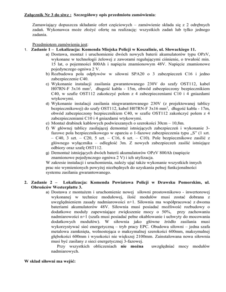 Załącznik Nr 3 do siwz : Szczegółowy opis przedmiotu zamówienia: Zamawiający dopuszcza składanie ofert częściowych – zamówienie składa się z 2 odrębnych zadań. Wykonawca może złożyć ofertę na realizację: wszystkich zadań lub tylko jednego zadania. 1. Przedmiotem zamówienia jest: Zadanie 1 – Lokalizacja: Komenda Miejska Policji w Koszalinie, ul. Słowackiego 11. a) Dostawa, montaż i uruchomienie dwóch nowych baterii akumulatorów typu OPzV, wykonane w technologii żelowej z zaworami regulującymi ciśnienie, o trwałość min. 15 lat, o pojemności 800Ah i napięciu znamionowym 48V. Napięcie znamionowe pojedynczego ogniwa 2 V. b) Rozbudowa pola odpływów w siłowni SPA20 o 3 zabezpieczeń C16 i jedno zabezpieczenie C40. c) Wykonanie instalacji zasilania gwarantowanego 230V do szafy OST112, kabel H07RN-F 3x16 mm2, długość kabla - 15m, obwód zabezpieczony bezpiecznikiem C40, w szafie OST112 zakończyć polem z 4 zabezpieczeniami C10 i 4 gniazdami wtykowymi. d) Wykonanie instalacji zasilania niegwarantowanego 230V (z projektowanej tablicy bezpiecznikowej) do szafy OST112, kabel H07RN-F 3x16 mm 2, długość kabla - 17m, obwód zabezpieczony bezpiecznikiem C40, w szafie OST112 zakończyć polem z 4 zabezpieczeniami C10 i 4 gniazdami wtykowymi. e) Montaż drabinek kablowych podwieszanych o szerokości 30cm – 10,8m. f) W głównej tablicy zasilającej demontaż istniejących zabezpieczeń i wykonanie 3fazowe pola bezpiecznikowego w oparciu o 1-fazowe zabezpieczenia typu „S” (1 szt. – C40, 3 szt. – C20, 5 szt. – C16, 6 szt. – C10). Pole bezpiecznikowe zasilić z głównego wyłącznika – odległość 3m. Z nowych zabezpieczeń zasilić istniejące odbiory oraz szafę OST112. g) Demontaż istniejących dwóch baterii akumulatorów OPzV 800Ah (napięcie znamionowe pojedynczego ogniwa 2 V) i ich utylizacja. W zakresie instalacji i uruchomienia, należy ująć także wykonanie wszystkich innych prac nie wymienionych powyżej niezbędnych do uzyskania pełnej funkcjonalności systemu zasilania gwarantowanego. 2. Zadanie 2 – Lokalizacja: Komenda Powiatowa Policji w Drawsku Pomorskim, ul. Obrońców Westerplatte 3. a) Dostawa z montażem i uruchomienie nowej siłowni prostownikowo - inwertorowej wykonanej w technice modułowej, ilość modułów musi zostać dobrana z uwzględnieniem zasady nadmiarowości n+1. Siłownia ma współpracować z dwoma bateriami akumulatorów 48V. Siłownia musi posiadać możliwość rozbudowy o dodatkowe moduły zapewniające zwiększenie mocy o 50%, przy zachowaniu nadmiarowości n+1 (szafa musi posiadać pełne okablowanie i uchwyty do mocowania dodatkowych modułów). W siłownia jako główne źródło zasilania musi wykorzystywać sieć energetyczną – tryb pracy EPC. Obudowa siłowni – jedna szafa metalowa zamknięta, wolnostojąca o maksymalnej szerokości 600mm, maksymalnej głębokości 600mm i wysokości nie większej 2100mm. Zainstalowana nowa siłownia musi być zasilany z sieci energetycznej 3-fazowej. Przy wszystkich obliczeniach nie można uwzględniać mocy modułów nadmiarowych. W skład siłowni ma wejść: I. Siłownia napięcia DC 48 V : obciążalność siłowni P musi uwzględniać założoną obciążalność siłowni inwertorowej, ładowanie baterii (C/10) oraz odbiory zewnętrzne o mocy 1000W, zrealizowana w oparciu o moduły prostownikowe o liczbie L wg zasady: L = n+1 gdzie n jest liczbą całkowitą <1,2,3,4> n - ilość prostowników potrzebna dla zapewnienia obciążalności P, ilość modułów prostownikowych – minimum 2 (dodatkowo moduł nadmiarowy), napięcie znamionowe wejściowe prostowników – 230 V 50 Hz, napięcie znamionowe wyjściowe prostowników – 48 V DC, równoległa praca modułów prostownikowych, aktywny podział prądu obciążenia zespołów prostownikowych, czujnik temperatury baterii do kompensacji napięcia buforowania, zasilanie wejściowe trójfazowe – moduły prostownikowe pracują na różnych fazach, praca w układzie buforowym z bateriami, charakterystyka wyjściowa modułów UPI, zabezpieczenie odpływu prądu stałego 48V do siłowni inwertorowej , 2 zabezpieczenia bateryjne, zabezpieczenia odbiorów DC 48V - 2 x C20, 2 x C6, 2 x C4, programowalny rozłącznik głębokiego rozładowania baterii, sprawność siłowni min. 91%, funkcja automatycznego testu baterii umożliwiająca oszacowanie pojemność baterii, sprawdza ich symetrii oraz określić różnicę w prądach poszczególnych stringów – test musi zapewnić ciągłość zasilania odbiorów przez co najmniej dwie godziny w przypadku wystąpienia zaniku zasilania zaraz po zakończeniu testu, możliwa rozbudowa o 50% mocy odbiorów zewnętrzne - po przez dołożenie modułów. II. Siłownia inwertorowa AC 230V: obciążalność siłowni min. Po= 12 000 W przy cosφ=0,9 zrealizowana w oparciu o moduły inwertorowe o liczbie L wg zasady: L = n+1 gdzie n jest liczbą całkowitą <1, 2> n - ilość modułów inwertorowych potrzebna dla zapewnienia obciążalności Po znamionowe napięcie wejściowe DC – 48 V, AC-230V, praca w trybie EPC przy obecności napięcia zasilającego AC-230V, równoległa praca modułów inwertorowych, elektroniczne urządzenie przełączające nie powodujące przerw w pracy odbiorów, ręczny przełącznik obejściowy, zabezpieczenia odbiorcze: - 2 szt. C6, - 8 szt. C10, - 6 szt. C16, - 1 szt. C40, sprawność siłowni w trybie EPC min. 95%, sprawność siłowni w trybie on-line min. 91%, przeciążalność min. 140%(5s), napięcie wyjściowe AC - 230V, Stabilizacja napięcia wyjściowego nie gorsza niż ±2% przy wszystkich stanach pracy, możliwa rozbudowa o 50% - po przez dołożenie modułów III. Sterownik mikroprocesorowy systemu zasilania gwarantowanego realizujący: sterownie pracą i konfigurowanie parametrów siłowni prostownikowo-inwertorowej, lokalne i zdalne kontrolowanie stanów alarmowych systemu zasilania, zmiana daty i czasu w monitorowanym obiekci