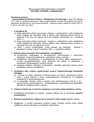 REGULAMIN PRZYJMOWANIA UCZNIÓW DO PSM I STOPNIA w SUWAŁKACH Podstawa prawna: - Rozporządzenie Ministra Kultury i Dziedzictwa Narodowego z dnia 16 czerwca 2011 roku w sprawie warunków i trybu przyjmowania uczniów do publicznych szkół i placówek artystycznych oraz przechodzenia z jednych typów szkół do innych /Dz. U. z 2011r. Nr 142, poz. 831/ 1. O przyjęcie do: a). klasy pierwszej szkoły muzycznej I stopnia o sześcioletnim cyklu kształcenia moŜe ubiegać się kandydat, który w danym roku kalendarzowym kończy co najmniej 5 lat oraz nie więcej niŜ 8 lat, /przepis obowiązuje od 1 września 2012 r./, b). klasy pierwszej szkoły muzycznej I stopnia o czteroletnim cyklu kształcenia moŜe ubiegać się kandydat, który w danym roku kalendarzowym kończy co najmniej 8 lat oraz nie więcej niŜ 16 lat c). klasy I „pionu oświatowego” moŜe ubiegać się kandydat, zgodnie z przepisami ustawy z dnia 7 września 1991 r. o systemie oświaty. 2. Szkoła moŜe prowadzić dla kandydatów nieodpłatnie: a). poradnictwo obejmujące w szczególności informowanie o warunkach rekrutacji, programie kształcenia i warunkach nauki w szkole, b). działalność konsultacyjna, w szczególności w formie zajęć praktycznych i kursów przygotowawczych, akcji otwartych dni szkoły, w połączeniu z koncertami propagującymi naukę w szkole, c). wstępne badanie uzdolnień kandydatów i określać celowość wyboru przez kandydata zakresu kształcenia. 3. Kandydaci albo rodzice /opiekunowie prawni/ niepełnoletniego kandydata składają: a). wniosek na druku szkolnym /umieszczonym na stronie internetowej szkoły/ wraz z opinią lekarza o braku przeciwwskazań zdrowotnych do podjęcia kształcenia w danej specjalności, b). w przypadku dziecka, które w danym roku kalendarzowym kończy 5 lat – opinię poradni psychologiczno – pedagogicznej o psychofizycznej dojrzałości dziecka do podjęcia nauki w szkole. 4. Podanie składa się w terminie ustalanym corocznie przez dyrektora szkoły 5. Kwalifikacja kandydatów do szkoły I stopnia odbywa się na podstawie badania przydatności. 6. Badanie przydatności odbywa się w terminie, który ustala dyrektor Szkoły. 7. Wyjątkowo, w wyniku powstania wolnych miejsc dyrektor Szkoły moŜe ustalić dodatkowy termin rekrutacji na określone instrumenty. 1 8. W celu przeprowadzenia badania przydatności Dyrektor Szkoły powołuje spośród nauczycieli szkoły Szkolną Komisję Rekrutacyjną, wyznacza jej skład i przewodniczącego oraz określa zadania członków Komisji. 9. Do zadań Komisji Rekrutacyjnej naleŜy w szczególności: a). podanie do wiadomości kandydatom informacji o warunkach rekrutacji, b). przeprowadzenie badania przydatności. 10. Badanie przydatności polega na sprawdzeniu uzdolnień muzycznych i predyspozycji do nauki gry na określonym instrumencie i stanowi zespół testów przeprowadzany w ciągu trzech kolejnych dni. 11. MoŜemy stosować dwie grupy testów: a. testy standaryzowane obejmujące tylko część kandydatów w wieku nie przekraczającym 10 roku Ŝycia – tzw. testy Gordona. Są to testy pisemne, wykonywane w grupach. Czas trwania badania jednej grupy wynosi ok. 25 minut. Wykonywane są w ciągu dwóch kolejnych dni. Kandydaci przynoszą przybory do pisania, ich zadaniem jest zaznaczanie odpowiedniego rysunku. Przed testem wykonywane są zadania próbne. b. testy szkolne dla wszystkich kandydatów przygotowane przez Szkolną Komisję Rekrutacyjną, obejmujące: - sprawdzian poziomu uzdolnień muzycznych. Są to testy indywidualne. Czas trwania badania jednego kandydata wynosi od 10 – 15 minut. Przed testem wszyscy kandydaci przygotowani do czekających ich zadań poprzez spotkania w grupach, w formie lekcji. - testy przydatności do instrumentu. Są to testy indywidualne. Czas trwania badania jednego kandydata wynosi ok. 15 minut. 12. Zakres badania przydatności muzycznej obejmuje: a. w grupie testów standaryzowanych Gordona: - badanie słuchu wysokościowego – test melodii, - badanie poczucia rytmu – test rytmu. b. w grupie testów szkolnych – test sprawdzający poziom uzdolnień muzycznych: - badanie słuchu wysokościowego poprzez powtórzenie głosem zaśpiewanego (zagranego) dźwięku oraz motywu, - badanie słuchu harmonicznego poprzez zaśpiewanie jednego, wybranego przez kandydata dźwięku z akordu zagranego na pianinie, - badanie poczucia rytmu poprzez wyklaskanie motywu lub frazy rytmicznej (zaklaskanej, zagranej), - badanie pamięci muzycznej poprzez zidentyfikowanie róŜnic w zagranych parach melodii, c. w grupie testów badających predyspozycje do gry na określonym instrumencie: - oględziny budowy fizycznej kandydata w aspektach: budowa ręki, postura ciała, uzębienie, - wykonanie prostych ćwiczeń o charakterze zabawowym na wybranym instrumencie. Cel ćwiczeń: zbadanie korelacji ruchowej kandydata, sposobu reagowania na polecenia nauczyciela, umiejętności kojarzenia, - dzieci, które uczyły się wcześniej gry na instrumencie mogą takŜe zaprezentować krótki utwór. Prezentacja ta nie ma wpływa na sumę punktów uzyskanych przez kandydata na tym teście. 2 13. Z przebiegu badania przydatności Komisja Rekrutacyjna sporządza protokół obejmujący w szczególności listę kandydatów, , którzy przystąpili do badania oraz uzyskane przez nich oceny. 14. Na podstawie ocen, o których mowa w pkt 13 Komisja Rekrutacyjna sporządza listę kandydatów, którzy uzyskali wynik kwalifikujący do przyjęcia do szkoły oraz przekazuje listę dyrektorowi szkoły. 15. Protokół, o którym mowa w pkt. 13 przechowywany jest w szkole przez okres kształcenia ucznia w szkole. Prace egzaminacyjne kandydatów z danego roku są przechowywane do końca roku kalendarzowego, w którym było przeprowadzane badanie przydatności. 16. Dyrektor Szkoły, na podstawie wyniku kwalifikującego, o którym mowa w pkt. 14 podejmuje decyzję o przyjęciu kandydata do szkoły. 17. W przypadku gdy liczba kan