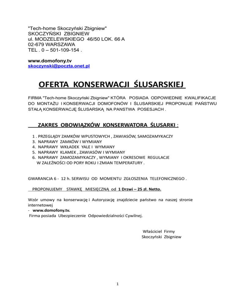 "Tech-home Skoczyński Zbigniew" SKOCZYŃSKI ZBIGNIEW ul. MODZELEWSKIEGO 46/50 LOK. 66 A 02-679 WARSZAWA TEL . 0 – 501-109-154 . www.domofony.tv [email protected] OFERTA KONSERWACJI ŚLUSARSKIEJ FIRMA F.H.U „ AGA „ KTÓRA Zbigniew" POSIADA KTÓRA ODPOWIEDNIE KWALIFIKACJE DO MONTAŻU I FIRMA "Tech-home Skoczyński POSIADA ODPOWIEDNIE KWALIFIKACJE KONSERWACJI I ŚLUSARSKIEJ PROPONUJE PAŃSTWU PROPONUJE STAŁĄ KONSERWACJĘ DO MONTAŻUDOMOFONÓW I KONSERWACJI DOMOFONÓW I ŚLUSARSKIEJ PAŃSTWU ŚLUSARSKĄ NA PANSTWA POSESJACH . STAŁĄ KONSERWACJĘ ŚLUSARSKĄ NA PANSTWA POSESJACH . ZAKRES OBOWIĄZKÓW KONSERWATORA ŚLUSARKI : 1 . PRZEGLĄDY ZAMKÓW WPUSTOWYCH , ZAWIASÓW, SAMOZAMYKACZY 3. NAPRAWY ZAMKÓW I WYMIANY 4. NAPRAWY WKŁADEK YALE I WYMIANY 5. NAPRAWY KLAMEK , ZAWIASÓW I WYMIANY 6. NAPRAWY ZAMOZAMYKACZY , WYMIANY I OKRESOWE REGULACJE W ZALEŻNOŚCI OD PORY ROKU I ZMIAN TEMPERATURY . GWARANCJA 6 - 12 h. SERWISU OD MOMENTU ZGŁOSZENIA TELEFONICZNEGO . PROPONUJEMY STAWKĘ MIESIĘCZNĄ od 1 Drzwi – 25 zł. Netto. Wzór umowy na konserwację i Autoryzację znajdziecie państwo na naszej stronie internetowej - www.domofony.tv. Firma posiada Ubezpieczenie Odpowiedzialności Cywilnej. Właściciel Firmy Skoczyński Zbigniew 1
