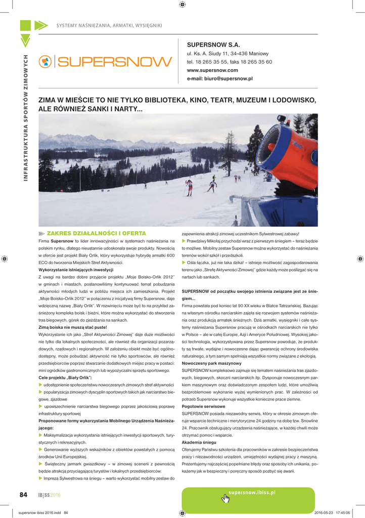 SYSTEMY NAŚNIEŻANIA, ARMATKI, WYSIĘGNIKI INFR ASTRUKTUR A SPORTÓW ZIMOWYCH SUPERSNOW S.A. ul. Ks. A. Siudy 11, 34-436 Maniowy tel. 18 265 35 55, faks 18 265 35 60 www.supersnow.com e-mail: [email protected] ZIMA W MIEŚCIE TO NIE TYLKO BIBLIOTEKA, KINO, TEATR, MUZEUM I LODOWISKO, ALE RÓWNIEŻ SANKI I NARTY... ZAKRES DZIAŁALNOŚCI I OFERTA zapewnienia atrakcji zimowej uczestnikom Sylwestrowej zabawy! Firma Supersnow to lider innowacyjności w systemach naśnieżania na X Prawdziwy Mikołaj przychodzi wraz z pierwszym śniegiem – teraz będzie polskim rynku, dlatego nieustannie udoskonala swoje produkty. Nowością to możliwe. Mobilny zestaw Supersnow można wykorzystać do naśnieżania w ofercie jest projekt Biały Orlik, który wykorzystuje hybrydę armatki 600 terenów wokół szkół i przedszkoli. ECO do tworzenia Miejskich Stref Aktywności. X Ośla łączka, już nie taka dzika! – istnieje możliwość zagospodarowania Wykorzystanie istniejących inwestycji terenu jako „Strefę Aktywności Zimowej” gdzie każdy może poślizgać się na Z uwagi na bardzo dobre przyjęcie projektu „Moje Boisko-Orlik 2012” nartach lub sankach. w gminach i miastach, postanowiliśmy kontynuować temat pobudzania aktywności młodych ludzi w pobliżu miejsca ich zamieszkania. Projekt SUPERSNOW od początku swojego istnienia związane jest ze śnie- „Moje Boisko-Orlik 2012” w połączeniu z inicjatywą firmy Supersnow, daje giem... wdzięczną nazwę „Biały Orlik”. W rozwinięciu może być to na przykład za- Firma powstała pod koniec lat 90 XX wieku w Białce Tatrzańskiej. Bazując śnieżony kompleks boisk i bieżni, które można wykorzystać do stworzenia na własnym ośrodku narciarskim zajęła się rozwojem systemów naśnieża- tras biegowych, górek do zjeżdżania na sankach. nia oraz produkcją armatek śnieżnych. Dziś armatki, wysięgniki i całe sys- Zimą boiska nie muszą stać puste! temy naśnieżania Supersnow pracują w ośrodkach narciarskich nie tylko Wykorzystanie ich jako „Stref Aktywności Zimowej” daje duże możliwości w Polsce – ale w całej Europie, Azji i Ameryce Południowej. Wysokiej jako- nie tylko dla lokalnych społeczności, ale również dla organizacji pozarzą- ści technologia, wykorzystywana przez Supersnow powoduje, że produk- dowych, rządowych i regionalnych. W założeniu obiekt może być ogólno- ty są trwałe, wydajne i nowoczesne dając gwarancję ochrony środowiska dostępny, może pobudzać aktywność nie tylko sportowców, ale również naturalnego, a tym samym spełniają wszystkie normy związane z ekologią. przedsiębiorców poprzez stwarzanie dodatkowych miejsc pracy w postaci: Nowoczesny park maszynowy mini ogródków gastronomicznych lub wypożyczalni sprzętu sportowego. SUPERSNOW kompleksowo zajmuje się tematem naśnieżania tras zjazdo- Cele projektu „Biały Orlik”: wych, biegowych, skoczni narciarskich itp. Dysponuje nowoczesnym par- X udostępnienie społeczeństwu nowoczesnych zimowych stref aktywności kiem maszynowym oraz doświadczonym zespołem ludzi, które umożliwią X popularyzacja zimowych dyscyplin sportowych takich jak narciarstwo bie- bezproblemowe wykonanie wyżej wymienionych prac. W zależności od gowe, zjazdowe potrzeb Supersnow wykonuje wszystkie konieczne prace ziemne. X upowszechnienie narciarstwa biegowego poprzez jakościową poprawę Pogotowie serwisowe infrastruktury sportowej SUPERSNOW posiada niezawodny serwis, który w okresie zimowym ofe- Proponowane formy wykorzystania Mobilnego Urządzenia Naśnieża- ruje wsparcie techniczne i merytoryczne 24 godziny na dobę tzw. Snowline jącego: 24. Pracownik obsługujący urządzenia naśnieżające, w każdej chwili może X Maksymalizacja wykorzystania istniejących inwestycji sportowych, tury- otrzymać pomoc i wsparcie. stycznych i rekreacyjnych. Akademia śniegu X Generowanie wyższych wskaźników z obiektów powstałych z pomocą Oferujemy Państwu szkolenia dla pracowników w zakresie bezpieczeństwa środków Unii Europejskiej. pracy i niezawodności urządzeń, umiejętności wydajnej pracy z maszyną. X Świąteczny jarmark gwiazdkowy – w zimowej scenerii z pewnością Prezentujemy najczęściej popełniane błędy oraz sposoby ich unikania, po- będzie atrakcją przyciągającą turystów i lokalnych przedsiębiorców. każemy jak w bezpieczny i poręczny sposób pozbyć się awarii. X Impreza Sylwestrowa na śniegu – warto wykorzystać mobilny zestaw do 84 2016 supersnow ibiss 2016.indd 84 supersnow.ibiss.pl 2016-05-23 17:45:06