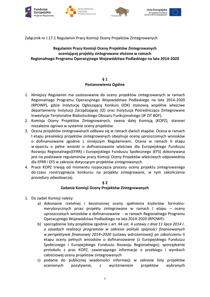 Załącznik nr I.17.1 Regulamin Pracy Komisji Oceny Projektów Zintegrowanych Regulamin Pracy Komisji Oceny Projektów Zintegrowanych oceniającej projekty zintegrowane złożone w ramach Regionalnego Programu Operacyjnego Województwa Podlaskiego na lata 2014-2020 §1 Postanowienia Ogólne 1. Niniejszy Regulamin ma zastosowanie do oceny projektów zintegrowanych w ramach Regionalnego Programu Operacyjnego Województwa Podlaskiego na lata 2014-2020 (RPOWP), gdzie Instytucję Ogłaszającą Konkurs (IOK) stanowią wspólnie właściwe departamenty Instytucji Zarządzającej (IZ) oraz Instytucja Pośrednicząca Zintegrowane Inwestycje Terytorialne Białostockiego Obszaru Funkcjonalnego (IP ZIT BOF). 2. Komisja Oceny Projektów Zintegrowanych, zwana dalej Komisją (KOPZ), stanowi niezależne ogniwo w systemie oceny projektów. 3. Ocena projektów zintegrowanych odbywa się w ramach dwóch etapów. Ocena w ramach I etapu preselekcji projektów zintegrowanych obejmuje ocenę uproszczonych wniosków o dofinansowanie zgodnie z niniejszym Regulaminem. Ocena w ramach II etapu w oparciu o pełne wnioski o dofinansowanie właściwe dla Europejskiego Funduszu Rozwoju Regionalnego(EFRR) i Europejskiego Funduszu Społecznego (EFS) dokonywana jest na podstawie regulaminów pracy Komisji Oceny Projektów właściwych odpowiednio dla EFRR i EFS w zakresie dotyczącym projektów zintegrowanych. 4. Prace KOPZ trwają od momentu rozpoczęcia procesu oceny projektu zintegrowanego do czasu rozstrzygnięcia konkursu na projekty zintegrowane, w tym zakończenia procedury odwoławczej. §2 Zadania Komisji Oceny Projektów Zintegrowanych 1. Do zadań Komisji należy: a) dokonanie rzetelnej i bezstronnej oceny spełnienia kryteriów formalnomerytorycznych przez projekty zintegrowane w ramach I etapu – oceny uproszczonych wniosków o dofinansowanie - w ramach Regionalnego Programu Operacyjnego Województwa Podlaskiego na lata 2014-2020 (RPOWP). b) sporządzenie listy projektów zgodnie z art. 44 ust. 4 ustawy z dnia 11 lipca 2014 r. o zasadach realizacji programów w zakresie polityki spójności finansowanych w perspektywie finansowej 2014–2020 (ustawy wdrożeniowej) po zakończeniu II etapu oceny pełnych wniosków o dofinansowanie (z Europejskiego Funduszu Społecznego i Europejskiego Funduszu Rozwoju Regionalnego); sporządzenie protokołu z prac KOPZ, zawierającego informacje o przebiegu i wynikach całościowej oceny projektów zintegrowanych c) podanie do publicznej wiadomości informacji w zakresie listy projektów ocenionych pozytywnie, z wyróżnieniem projektów wybranych 1 do dofinansowania oraz informacji, o której mowa w art. 44 ust. 5 ustawy wdrożeniowej, po rozstrzygnięciu konkursu projektów zintegrowanych. 2. Ocena formalno-merytoryczna, o której mowa w ust. 1 lit. a może być dokonywana przy użyciu Systemu Oceny Formalno - Merytorycznej (SOFM). §3 Skład Komisji Oceny Projektów Zintegrowanych 1. Skład KOPZ zatwierdzany jest przez Marszałka Województwa. Liczba członków Komisji w ramach danego konkursu na wybór projektów zintegrowanych powinna być adekwatna do liczby wniosków podlegających ocenie formalno-merytorycznej. 2. W skład KOPZ obligatoryjnie wchodzą: Przewodniczący/Zastępca Przewodniczącego oraz Sekretarz. 3. W szczególnie uzasadnionych przypadkach Przewodniczący może jednocześnie pełnić funkcję Sekretarza. 4. Komisję tworzą: 1) wyznaczeni w ramach Zespołu ds. przygotowania oraz przeprowadzenia naboru i wyboru projektów zintegrowanych: a) pracownicy Departamentu Wdrażania Regionalnego Programu Operacyjnego (DWRPO), Departamentu Europejskiego Funduszu Społecznego (DEFS) i Departamentu Rozwoju Regionalnego (DRR); b) fakultatywnie inni pracownicy departamentów merytorycznych Urzędu Marszałkowskiego Województwa Podlaskiego i jednostek podległych; 2) eksperci w rozumieniu art. 49 ustawy wdrożeniowej, tj. osoby nie będące pracownikami Instytucji Zarządzającej (IZ), Instytucji Pośredniczącej (IP ZIT BOF) ani żadnej innej instytucji wdrażającej RPOWP, dokonujące oceny projektów i wybrane w drodze otwartego naboru, według jawnych kryteriów, które: a) korzystają z pełni praw publicznych; b) mają pełną zdolność do czynności prawnych; c) nie zostały skazane prawomocnym wyrokiem za przestępstwo umyślne lub za umyślne przestępstwo skarbowe; d) posiadają wiedzę, umiejętności, doświadczenie lub wymagane uprawnienia w dziedzinie objętej programem operacyjnym, w ramach której jest dokonywany wybór projektów; e) posiadają wiedzę w zakresie celów i sposobu realizacji RPOWP; f) w obszarze właściwym dla EFS posiadają ważny certyfikat na lata 2014-2020; 3) pracownicy Instytucji Pośredniczącej ZIT BOF (IP ZIT BOF)1 w ramach Zespołu ds. przygotowania oraz przeprowadzenia naboru i wyboru projektów zintegrowanych. 5. W posiedzeniach KOPZ mogą uczestniczyć przedstawiciele instytucji nadrzędnych w stosunku do IZ/IP ZIT BOF w systemie wdrażania programu operacyjnego oraz partnerzy. Osoby te nie mogą dokonywać oceny projektów, uczestniczą w posiedzeniu w charakterze obserwatorów. Przed udziałem w posiedzeniu osoby te podpisują deklaracje poufności (Załącznik nr KOPZ-3). 6. Członkowie Komisji mogą być wykluczeni ze składu KOPZ w sytuacji, gdy naruszają postanowienia niniejszego Regulaminu. Decyzję o wykreśleniu danego członka ze składu 1 W przypadku konkursów ogłaszanych w ramach Strategii ZIT BOF IOK stanowią wspólnie właściwe departamenty IZ oraz IP ZIT BOF. 2 KOPZ podejmuje Marszałek Województwa na wniosek Przewodniczącego KOPZ w uzgodnieniu z dyrekcją właściwych departamentów IZ oraz IP ZIT BOF. Uwzględniając zasadę poufności i bezstronności, w sytuacji wykreślenia danego członka ze składu KOPZ, każdorazowo podejmowana jest decyzja dotycząca anulowania bądź nie, wszystkich ocen dokonanych przez danego członka w ramach niniejszego KOPZ. §4 Tryb prac Komisji Oceny Projektów Zi