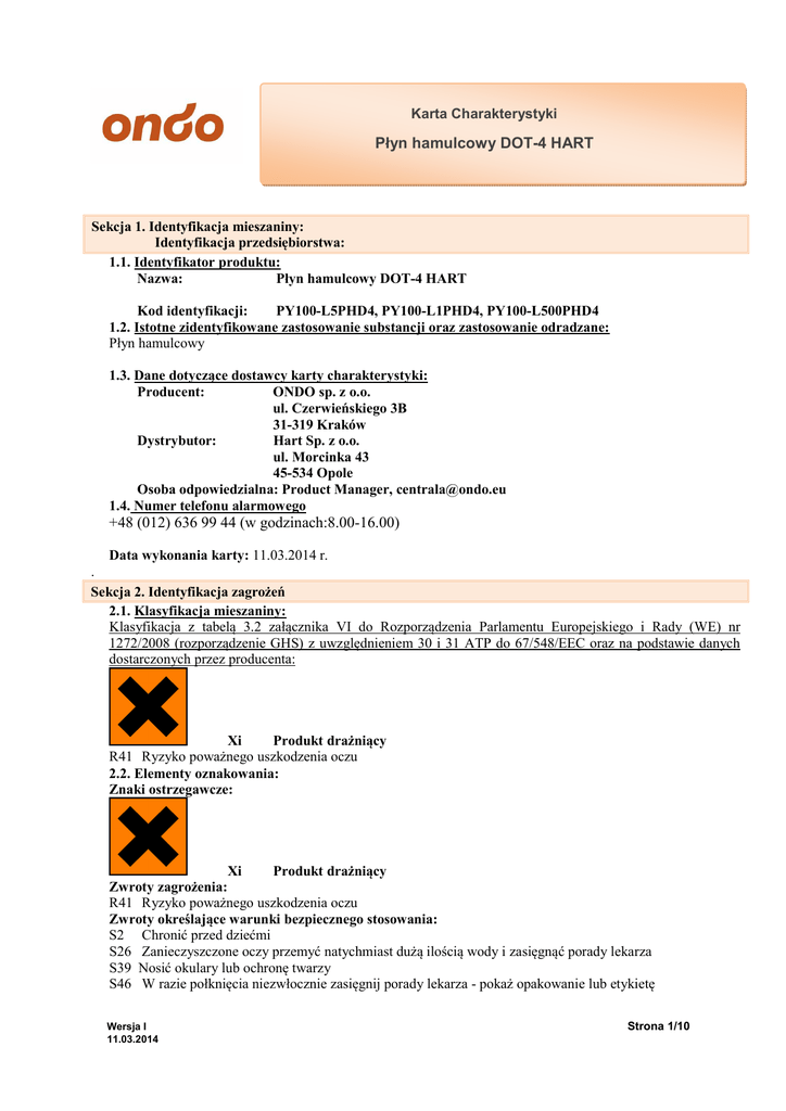 Karta Charakterystyki Płyn hamulcowy DOT-4 HART Sekcja 1. Identyfikacja mieszaniny: Identyfikacja przedsiębiorstwa: 1.1. Identyfikator produktu: Nazwa: Płyn hamulcowy DOT-4 HART Kod identyfikacji: PY100-L5PHD4, PY100-L1PHD4, PY100-L500PHD4 1.2. Istotne zidentyfikowane zastosowanie substancji oraz zastosowanie odradzane: Płyn hamulcowy 1.3. Dane dotyczące dostawcy karty charakterystyki: Producent: ONDO sp. z o.o. ul. Czerwieńskiego 3B 31-319 Kraków Dystrybutor: Hart Sp. z o.o. ul. Morcinka 43 45-534 Opole Osoba odpowiedzialna: Product Manager, [email protected] 1.4. Numer telefonu alarmowego +48 (012) 636 99 44 (w godzinach:8.00-16.00) Data wykonania karty: 11.03.2014 r. . Sekcja 2. Identyfikacja zagrożeń 2.1. Klasyfikacja mieszaniny: Klasyfikacja z tabelą 3.2 załącznika VI do Rozporządzenia Parlamentu Europejskiego i Rady (WE) nr 1272/2008 (rozporządzenie GHS) z uwzględnieniem 30 i 31 ATP do 67/548/EEC oraz na podstawie danych dostarczonych przez producenta: Xi Produkt drażniący R41 Ryzyko poważnego uszkodzenia oczu 2.2. Elementy oznakowania: Znaki ostrzegawcze: Xi Produkt drażniący Zwroty zagrożenia: R41 Ryzyko poważnego uszkodzenia oczu Zwroty określające warunki bezpiecznego stosowania: S2 Chronić przed dziećmi S26 Zanieczyszczone oczy przemyć natychmiast dużą ilością wody i zasięgnąć porady lekarza S39 Nosić okulary lub ochronę twarzy S46 W razie połknięcia niezwłocznie zasięgnij porady lekarza - pokaż opakowanie lub etykietę Wersja I 11.03.2014 Strona 1/10 Karta Charakterystyki Płyn hamulcowy DOT-4 HART 2.3. Inne zagrożenia: Brak Sekcja 3. Skład/informacja o składnikach 3.1. Substancje: Nie dotyczy. 3.2. Mieszaniny: Klasyfikację substancji zawartych w produkcie podano zgodnie z tabelą 3.1 oraz 3.2 załącznika VI do Rozporządzenia Parlamentu Europejskiego i Rady (WE) nr 1272/2008 (rozporządzenie GHS) z uwzględnieniem 30 i 31 ATP do 67/548/EEC oraz na podstawie danych dostarczonych przez producenta. Nazwa niebezpiecznej substancji Zakres stężeń Numer CAS Numer indeksowy Numer WE 2-[2-(2butoksyetoksy)etoksy)etanol; eter monobutylowy glikolu trietylenowego 20-<30% 143-22-6 603-183-00-0 203-473-3 Symbole niebezpieczeństwa Xi: R41 GHS05 Niebezpieczeństwo EyeDam1: H318 Xn: R22 2,2‘-oksydietanol; glikol dietylenowy <20 % 111-46-6 603-140-00-6 203-872-2 GHS07 Uwaga AcuteTox4: H302 Xn: R63 2-(2-metoksyetoksy)etanol; <5 % 111-77-3 603-107-00-6 203-906-6 GHS08 Uwaga Repr1d: H361d Xi: R36 2-(2-butoksyetoksy)etanol; eter monobutylowy glikolu di etylenowego <1,5% 112-34-5 603-096-00-8 203-961-6 GHS07 Uwaga EyeIrrit2: H315 Brzmienie użytych zwrotów – patrz p. 16. Sekcja 4. Środki pierwszej pomocy 4.1. Opis środków pierwszej pomocy: 4.1.1 Wytyczne dotyczące pierwszej pomocy wg istotnych dróg narażenia: Kartę Charakterystyki okazać lekarzowi udzielającemu pomocy. W przypadku narażenia na pary i aerozole produktu osobę poszkodowaną przenieść do dobrze wentylowanego pomieszczenia zwrócić się o pomoc lekarską a) drogi oddechowe: osobę poszkodowaną natychmiast przenieść do dobrze wentylowanego pomieszczenia; osobę poszkodowaną umieścić w pozycji półleżącej, rozluźnić ubranie, upewnić się czy w Wersja I 11.03.2014 Strona 2/10 Karta Charakterystyki Płyn hamulcowy DOT-4 HART ustach osoby poszkodowanej nie zalegają przedmioty lub wydzielina utrudniające oddychanie; jęli poszkodowany nie oddycha – wykonać sztuczne oddychanie; niezwłocznie zwrócić się o pomoc lekarską w przypadku wystąpienia trudności z oddychaniem. b) skóra: zdjąć zanieczyszczone ubranie; zabrudzoną skórę przemyć dużą ilością wody z mydłem; do mycia skóry nie używać żadnych rozpuszczalników ani rozcieńczalników; jeżeli wystąpi podrażnienie skóry – skonsultować z lekarzem. c) oczy: zanieczyszczone oczy płukać, przy otwartych powiekach, ciągłym strumieniem bieżącej wody przez 10 ÷ 15 minut; unikać silnego strumienia wody, który może stworzyć ryzyko uszkodzenia rogówki; w przypadku utrzymującego się pieczenia lub podrażnienia skonsultować się z lekarzem; nie używać żadnych płynów do przemywania oczu ani żadnych maści przed konsultacją lekarską; w przypadku, gdy osoba poszkodowana nosi szkła kontaktowe zdjąć je, jeżeli to możliwe; zwrócić się o pomoc lekarską jeżeli wystąpią niepokojące objawy– pokazać lekarzowi Kartę Charakterystyki lub etykietę d) przewód pokarmowy: wypłukać usta dużą ilością bieżącej wody; osobie nieprzytomnej nie podawać nic do ust ; nie wywoływać wymiotów; niezwłocznie skonsultować z lekarzem – pokazać lekarzowi Kartę Charakterystyki lub etykietę 4.1.2. Inne: Brak. 4.2. Najważniejsze ostre i opóźnione objawy oraz skutki narażenia: Ostre: Ryzyko poważnego uszkodzenia oczu Opóźnione: Brak. 4.3. Wskazania dotyczące wszelkiej natychmiastowej pomocy lekarskiej i szczególnego postępowania z poszkodowanym: W przypadku spożycia należy niezwłocznie skonsultować się z lekarzem. Sekcja 5. Postępowanie w przypadku pożaru 5.1. Środki gaśnicze: a) Zalecane środki gaśnicze: Rozproszone prądy wodne, gaśnice proszkowe. b) Niezalecane środki gaśnicze: Unikać silnych prądów wodnych, które mogą rozprzestrzenić ogień. 5.2. Szczególne zagrożenia związane z substancją: Wydziela toksyczne gazy w warunkach pożaru 5.3. Informacje dla straży pożarnej: Należy nosić niezależny aparat do oddychania i odpowiednią odzież ochronną. Sekcja 6. Postępowanie w przypadku niezamierzonego uwolnienia do środowiska 6.1. Indywidualne środki ostrożności, wyposażenie ochronne i procedury w sytuacjach awaryjnych: 6.1.1. Dla osób nienależących do personelu udzielającego pomocy: - podczas usuwania materiału należy używać ubrania ochronnego, rękawic ochronnych, okularów ochronnych 6.1.2. Dla osób udzielających pomocy: - podczas usuwania unikać tworzenia się i wdychania par produktu - używać dobrze dopasowanych