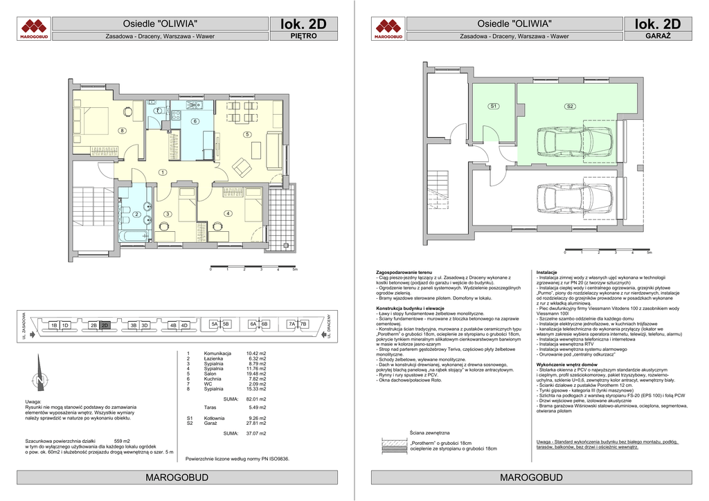 lok. 2D Osiedle "OLIWIA" PIĘTRO Zasadowa - Draceny, Warszawa - Wawer lok. 2D Osiedle "OLIWIA" GARAŻ Zasadowa - Draceny, Warszawa - Wawer S1 7 S2 6 8 5 1 4 3 2 0 1B 1D 2B 2D 3B 3D 4B 5A 4D 1 2 3 4 5 6 7 8 1 5B Komunikacja Łazienka Sypialnia Sypialnia Salon Kuchnia WC Sypialnia SUMA: Uwaga: Rysunki nie mogą stanowić podstawy do zamawiania elementów wyposażenia wnętrz. Wszystkie wymiary należy sprawdzić w naturze po wykonaniu obiektu. Taras S1 S2 2 3 6A 6B 5m 4 7A 10.42 m2 6.32 m2 8.79 m2 11.76 m2 19.48 m2 7.82 m2 2.09 m2 15.33 m2 Zagospodarowanie terenu - Ciąg pieszo-jezdny łączący z ul. Zasadową z Draceny wykonane z kostki betonowej (podjazd do garażu i wejście do budynku). - Ogrodzenie terenu z paneli systemowych. Wydzielenie poszczególnych ogrodów zielenią. - Bramy wjazdowe sterowane pilotem. Domofony w lokalu. 7B UL. DRACENY UL. ZASADOWA 0 Konstrukcja budynku i elewacje - Ławy i stopy fundamentowe żelbetowe monolityczne. - Ściany fundamentowe - murowane z bloczka betonowego na zaprawie cementowej. - Konstrukcja ścian tradycyjna, murowana z pustaków ceramicznych typu „Porotherm” o grubości 18cm, ocieplenie ze styropianu o grubości 18cm, pokrycie tynkiem mineralnym silikatowym cienkowarstwowym barwionym w masie w kolorze jasno-szarym - Strop nad parterem gęstożebrowy Teriva, częściowo płyty żelbetowe monolityczne. - Schody żelbetowe, wylewane monolityczne. - Dach w konstrukcji drewnianej, wykonanej z drewna sosnowego, pokrytej blachą panelową „na rąbek stojący” w kolorze antracytowym. - Rynny i rury spustowe z PCV. - Okna dachowe/połaciowe Roto. 82.01 m2 5.49 m2 Kotłownia Garaż SUMA: 2 3 4 5m Instalacje - Instalacja zimnej wody z własnych ujęć wykonana w technologii zgrzewanej z rur PN 20 (z tworzyw sztucznych) - Instalacja ciepłej wody i centralnego ogrzewania, grzejniki płytowe „Purmo”, piony do rozdzielaczy wykonane z rur nierdzewnych, instalacje od rozdzielaczy do grzejników prowadzone w posadzkach wykonane z rur z wkładką aluminiową. - Piec dwufunkcyjny firmy Viessmann Vitodens 100 z zasobnikiem wody Viessmann 100l - Szczelne szambo oddzielnie dla każdego domu - Instalacje elektryczne jednofazowe, w kuchniach trójfazowe - kanalizacja teletechniczna do wykonania przyłączy (lokator we własnym zakresie wybiera operatora internetu, telewizji, telefonu, alarmu) - Instalacja wewnętrzna telefoniczna i internetowa - Instalacja wewnętrzna RTV - Instalacja wewnętrzna systemu alarmowego - Orurowanie pod „centralny odkurzacz” Wykończenie wnętrz domów - Stolarka okienna z PCV o najwyższym standardzie akustycznym i cieplnym, profil sześciokomorowy, pakiet trzyszybowy, rozwiernouchylna, szklenie U=0,6, zewnętrzny kolor antracyt, wewnętrzny biały. - Ścianki działowe z pustaków Porotherm 12 cm. - Tynki gipsowe - kategoria III (tynki maszynowe) - Szlichta na podłogach z warstwą styropianu FS-20 (EPS 100) i folią PCW - Drzwi wejściowe pełne, izolowane akustycznie - Brama garażowa Wiśniowski stalowo-aluminiowa, ocieplona, segmentowa, otwierana pilotem 9.26 m2 27.81 m2 37.07 m2 559 m2 Szacunkowa powierzchnia działki w tym do wyłącznego użytkowania dla każdego lokalu ogródek o pow. ok. 60m2 i służebność przejazdu drogą wewnętrzną o szer. 5 m Ściana zewnętrzna „Porotherm” o grubości 18cm ocieplenie ze styropianu o grubości 18cm Uwaga - Standard wykończenia budynku bez białego montażu, podłóg, tarasów, balkonów, bez drzwi i ościeżnic wewnątrz. Powierzchnie liczone według normy PN ISO9836. MAROGOBUD 1 MAROGOBUD