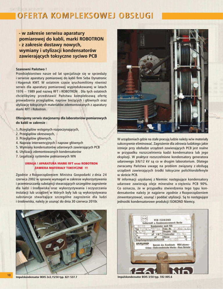 OFERTA KOMPLEKSOWEJ OBS!UGI - w zakresie serwisu aparatury pomiarowej do kabli, marki ROBOTRON - z zakresie dostawy nowych, wymiany i utylizacji kondensatorów zawieraj"cych toksyczne syciwo PCB Szanowni Pa stwo ! Przedsi&biorstwo nasze od lat specjalizuje si& w sprzeda"y i serwisie aparatury pomiarowej do kabli Þrm Seba Dynatronic i Hagenuk KMT. W ostatnim czasie uruchomili#my równie" serwis dla aparatury pomiarowej wyprodukowanej w latach 1976 – 1989 pod nazw RFT i ROBOTRON . Dla tych ostatnich chcieliby#my przedstawi% Pa!stwu kompleksow ofert& prowadzenia przegl dów, napraw bie" cych i g$ównych oraz utylizacj& toksycznych materia$ów zdemontowanych z aparatury marki RFT i Robotron. Oferujemy serwis stacjonarny dla laboratoriów pomiarowych do kabli w zakresie : 1. Przegl dów wst&pnych-rozpoczynaj cych, 2. Przegl dów okresowych, 3. Przegl dów g$ównych, 4. Napraw interwencyjnych i napraw g$ównych 5. Wymiany kondensatorów udarowych zawieraj cych PCB 6. Utylizacji zdemontowanych kondensatorów 7. Legalizacji systemów pomiarowych WN Zgodnie z Rozporz dzeniem Ministra Gospodarki z dnia 24 czerwca 2002 w sprawie wymaga! w zakresie wykorzystywania i przemieszczania substancji stwarzaj cych szczególne zagro"enie dla ludzi i #rodowiska oraz wykorzystywania i oczyszczania instalacji lub urz dze! w których by$y lub s wykorzystywana substancje stwarzaj ce szczególne zagro"enie dla ludzi i #rodowiska, nale"y je usun % do dnia 30 czerwca 2010r. W urz dzeniach gdzie na sta$e pracuj ludzie nale"y w/w materia$y sukcesywnie eliminowa%. Zagro"enie dla zdrowia ludzkiego jakie istnieje przy obs$udze urz dze! zawieraj cych PCB jest realne w przypadku rozszczelnienia kadzi kondensatora lub jego eksplozji. W praktyce rozszczelnione kondensatory generatora udarowego 3/6/12 kV s co w drugim laboratorium. Dlatego zwracamy Pa!stwa uwag& na problem zwi zany z obs$ug urz dze! zawieraj cych #rodki toksyczne polichlorobifenyle w skrócie PCB. W informacji uzyskanej z Niemiec nast&puj ce kondensatory udarowe zawieraj oleje mineralne o st&"eniu PCB 90%. Co oznacza, "e w przypadku stwierdzenia tego typu kondensatorów nale"y je najpierw zgodnie z Rozporz dzeniem zinwentaryzowa%, usun % i podda% utylizacji. S to nast&puj ce jednostki kondensatorowe produkcji ISOKOND Niemcy. Impulskondensator BOIS 2x3,15/50 typ. 821 537.7 Impulskondensator BOIS 3/50 typ. 592 005.6 UWAGA ! APARATURA MARKI RFT oraz ROBOTRON ZAWIERA MATERIALY TOKSYCZNE !!! 10 W przypadku stwierdzenia w/w kondensatorów przedsi&biorstwo nasze oferuje kompleksow us$ug& demonta"u toksycznego materia$u (dzi&ki temu odpad powstaje w OLMEX S.A. i ci&"ar wytworzenia odpadu w rozumieniu ustawy o odpadach niebezpiecznych przejmuje nasze przedsi&biorstwo), zast pienia go nowoczesnymi kondensatorami wykonanymi w technologii bez PCB, o identycznych parametrach i wymiarach wewn&trznych (przez co nie jest potrzebna przebudowa czy to aparatury czy to laboratorium), dobudowy nowoczesnych rezystorów roz$adowczych i przeprowadzenia utylizacji zdemontowanych kondensatorów (otrzymujecie Pa!stwo certyÞkat unieszkodliwienia odpadu). Zdemontowane kondensatory zawieraj ce PCB Przedsi#biorstwo OLMEX S.A. dzia$a zgodnie z ustaw z dnia 27 kwietnia 2001 – „Prawo Ochrony 'rodowiska” , $"czymy ze sob" do%wiadczenia dwóch dzia$ów : w dziedzinie kondensatorów (kompensacja mocy biernej i kondensatory specjalne) i w dziedzinie serwisu aparatury pomiarowej do kabli Þrm SEBA Dynatronic, Hagenuk KMT i ROBOTRON. Przedsi&biorstwo nasze posiada stosowne zezwolenia na prowadzenie dzia$alno#ci w zakresie zbierania i transportu odpadów, posiadamy w$asny transport zgodny z ADR i prowadzimy utylizacj& w ramach konsorcjum w profesjonalnej spalarni odpadów zawieraj cych PCB w Belgii. Pakowanie kondensatorów do pojemników przed wysy$k do termicznego unieszkodliwienia do Belgii. Zak$ad utylizacyjny koncernu INDAVER gdzie traÞaj zdemontowane kondensatory unieszkodliwia je w procesie termicznym. Dodatkowo proponujemy Pa stwu : - przegl dy g$ówne i okresowe - naprawy g$ówne i awaryjne, konserwacje systemów pomiarowych - legalizacj& serwisow – opomiarowanie sygna$ów WN na wzorcu MWR (Seba KMT) - szkolenia i treningi operatorów 11